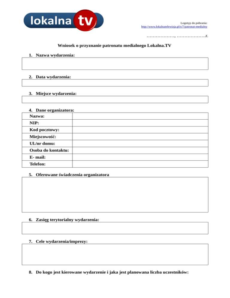 Logotyp do pobrania: http://www.lokalnatelewizja.pl/s/7/patronat-medialny ………………, ……………….r. Wniosek o przyznanie patronatu medialnego Lokalna.TV 1. Nazwa wydarzenia: 2. Data wydarzenia: 3. Miejsce wydarzenia: 4. Dane organizatora: Nazwa: NIP: Kod pocztowy: Miejscowość: Ul./nr domu: Osoba do kontaktu: E- mail: Telefon: 5. Oferowane świadczenia organizatora 6. Zasięg terytorialny wydarzenia: 7. Cele wydarzenia/imprezy: 8. Do kogo jest kierowane wydarzenie i jaka jest planowana liczba uczestników: Logotyp do pobrania: http://www.lokalnatelewizja.pl/s/7/patronat-medialny 9. Źródła finansowania wydarzenia: 10. Czy udział w wydarzeniu jest odpłatny? 11. Partnerzy/współorganizatorzy wydarzenia: 12. Czy wydarzenie/impreza ma charakter cykliczny? Jeśli tak, proszę podać informację czy uprzednio było objęte patronatem Lokalna.TV: 13. Stopień patronatu Lokalna.TV (zaznacz właściwe): stopień I stopień II stopień III 14. Uzasadnienie wniosku: 15. Załączniki do wniosku a) obligatoryjne: dokładny opis wydarzenia szczegółowy program/regulamin wydarzenia b) dodatkowe: Wniosek należy przesłać w formie elektronicznej (plik .odt lub .pdf) na e-mail: [email protected]. W tytule należy wpisać: „Prośba o patronat medialny”