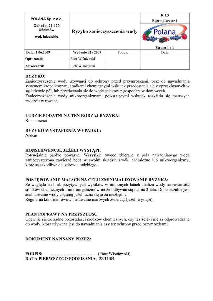 R.1.5 Egzemplarz nr 1 POLANA Sp. z o.o. Ochoża, 21-109 Uścimów Ryzyko zanieczyszczenia wody woj. lubelskie Data: 1.06.2009 Wydanie 02 / 2009 Opracował: Piotr Wiśniewski Zatwierdził: Piotr Wiśniewski Podpis Strona 1 z 1 Data RYZYKO; Zanieczyszczenie wody używanej do ochrony przed przymrozkami, oraz do nawadniania systemem kropelkowym, środkami chemicznymi wskutek przedostania się z opryskiwanych w sąsiedztwie pól, lub przedostania się do wody ścieków z gospodarstw domowych. Zanieczyszczenie wody mikroorganizmami powstającymi wskutek rozkładu się martwych zwierząt w rowach. LUDZIE PODATNI NA TEN RODZAJ RYZYKA: Konsumenci RYZYKO WYSTĄPIENIA WYPADKU: Niskie KONSEKWENCJE JEŻELI WYSTĄPI: Potencjalnie bardzo poważne. Wszystkie owoce zbierane z pola nawadnianego woda zanieczyszczona zawierać będą w swoim składzie środki chemiczne lub mikroorganizmy, które są szkodliwe dla zdrowia ludzkiego. POSTĘPOWANIE MAJĄCE NA CELU ZMINIMALIZOWANIE RYZYKA: Ze względu na brak pozytywnych wyników w minionych latach analiza wody na zawartość środków chemicznych i mikroorganizmów może odbywać się raz na 2 lata. Dopuszczalne jest analizowanie wody częściej jeżeli uzna się to za niezbędne. Regularna kontrola rowów i usuwanie martwych zwierząt (jeżeli wystąpi). PLAN POPRAWY NA PRZYSZŁOŚĆ: Upewnić się ze żadne pozostałości środków chemicznych, czy tez ścieki nie są odprowadzane do wody, która używana jest do nawadniania czy tez ochrony przed przymrozkami. DOKUMENT NAPISANY PRZEZ: PODPIS: …………………………. (Piotr Wisniewski) DATA PIERWSZEGO PODPISANIA; 28/11/04