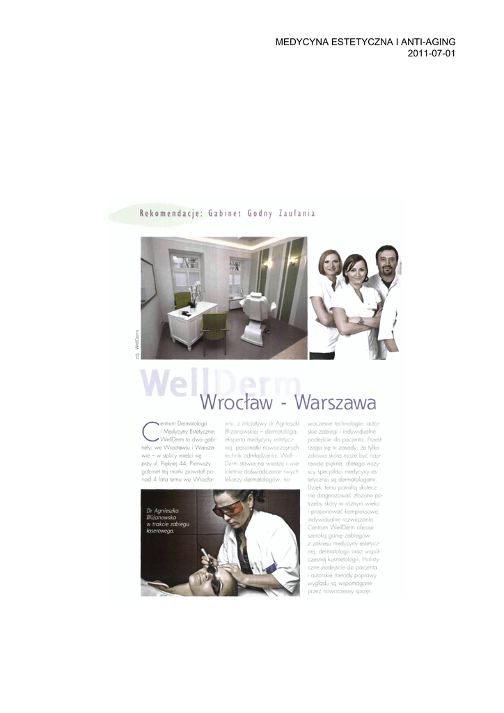 MEDYCYNA ESTETYCZNA I ANTI-AGING 2011-07-01 Rekomendacje: Gabinet Godny Zaufania Wrocław - Warszawa entrum Dermatologii i Medycyny Estetycznej WellDerm to dwa gabi wiu, z inicjatywy dr Agnieszki Bliżanowskiej - dermatologa, eksperta medycyny estetycz woczesne technologie, autor skie zabiegi i indywidualne podejście do pacjenta. Przest nety: we Wrocławiu i Warsza wie - w stolicy mieści się przy ul. Pięknej 44. Pierwszy nej, pasjonatki nowoczesnych technik odmładzania Well Derm stawia na wiedzę i wie rzega się tu zasady, że tylko zdrowa skóra może być nap rawdę piękna, dlatego wszy gabinet tej marki powstał po nad 4 lata temu we Wrocła loletnie doświadczenie swych lekarzy dermatologów, no- scy specjaliści medycyny es tetycznej sq dermatologami. Dzięki temu potrafią skutecz C Dr Agnieszka Bliżanowska w trakcie zabiegu laserowego. nie diagnozować złożone po trzeby skóry w różnym wieku i proponować kompleksowe, indywidualne rozwiązania. Centrum WellDerm oferuje szeroką gamę zabiegów z zakresu medycyny estetycz nej, dermatologii oraz współ czesnej kosmetologii. Holisty czne podejście do pacjenta i autorskie metody poprawy wyglądu są wspomagane przez nowoczesny sprzęt. MEDYCYNA ESTETYCZNA I ANTI-AGING 2011-07-01 Rekomendacje: Gabinet Godny Zaufania A OFERTA CENTRUM DERMATOLOGII I MEDYCYNY ESTETYCZNEJ WELLDERM • zabiegi toksyną botulinową (Botox) • zabiegi z kwasem hialuronowym • kwas polimlekowy (Sculptra) • Mesoline Roller • Regeneris • Hydrobalance - Restylane Vital • Zaffiro (Thermolifting) • Exilis • redukcja rumienią metodą GEM-IPL • elektrokoagulacja • laser frakcyjny Lux 1540™ Palomar (leczenie blizn i rozstępów, likwidacja przebarwień, fotoodmładzanie), • mezoterapia (igłowa, nowości marki Croma, bezigłowa, lipolityczna) • lipoliza iniekcyjna • likwidacja przebarwień (Cosmelan/Dermamelan, peelingi medyczne) • Jet Peel (hydroabrazja) • dermatochirurgia • EAT SkinShock • peelingi chemiczne • makijaż trwały • laserowe leczenie zmian naczyniowych • depilacja laserowa