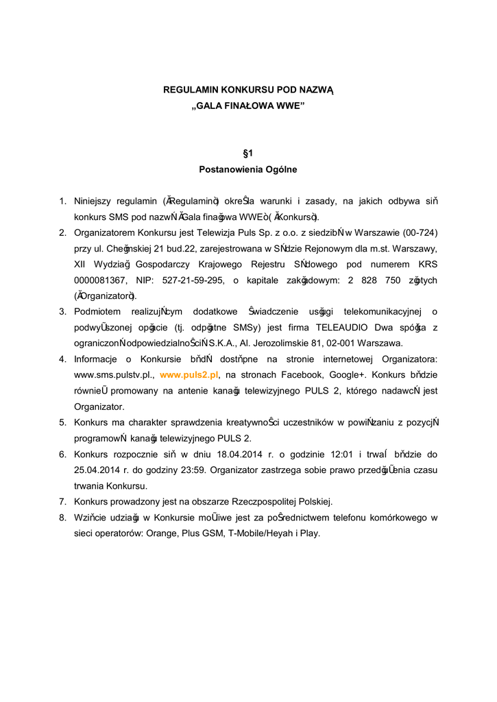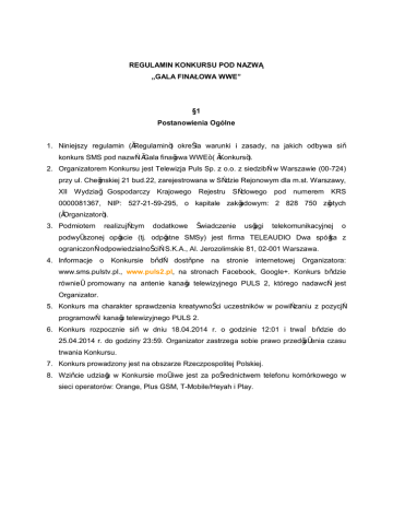 REGULAMIN KONKURSU POD NAZWĄ „GALA FINAŁOWA WWE” §1 Postanowienia Ogólne 1. Niniejszy regulamin („Regulamin”) określa warunki i zasady, na jakich odbywa się konkurs SMS pod nazwą „Gala finałowa WWE” ( „Konkurs”). 2. Organizatorem Konkursu jest Telewizja Puls Sp. z o.o. z siedzibą w Warszawie (00-724) przy ul. Chełmskiej 21 bud.22, zarejestrowana w Sądzie Rejonowym dla m.st. Warszawy, XII Wydział Gospodarczy Krajowego Rejestru Sądowego pod numerem KRS 0000081367, NIP: 527-21-59-295, o kapitale zakładowym: 2 828 750 złotych („Organizator”). 3. Podmiotem realizującym dodatkowe świadczenie usługi telekomunikacyjnej o podwyższonej opłacie (tj. odpłatne SMSy) jest firma TELEAUDIO Dwa spółka z ograniczoną odpowiedzialnością S.K.A., Al. Jerozolimskie 81, 02-001 Warszawa. 4. Informacje o Konkursie będą dostępne na stronie internetowej Organizatora: www.sms.pulstv.pl., www.puls2.pl, na stronach Facebook, Google+. Konkurs będzie również promowany na antenie kanału telewizyjnego PULS 2, którego nadawcą jest Organizator. 5. Konkurs ma charakter sprawdzenia kreatywności uczestników w powiązaniu z pozycją programową kanału telewizyjnego PULS 2. 6. Konkurs rozpocznie się w dniu 18.04.2014 r. o godzinie 12:01 i trwać będzie do 25.04.2014 r. do godziny 23:59. Organizator zastrzega sobie prawo przedłużenia czasu trwania Konkursu. 7. Konkurs prowadzony jest na obszarze Rzeczpospolitej Polskiej. 8. Wzięcie udziału w Konkursie możliwe jest za pośrednictwem telefonu komórkowego w sieci operatorów: Orange, Plus GSM, T-Mobile/Heyah i Play. §2 Uczestnicy Konkursu 1. Uczestnikiem Konkursu jest osoba fizyczna, która ukończyła 18 rok życia lub posiada pisemną zgodę przedstawiciela ustawowego na uczestnictwo w Konkursie, spełnia wszystkie wymogi wynikające z niniejszego Regulaminu oraz przystąpiła do Konkursu przez dokonanie czynności określonych w § 3 ust. 1 Regulaminu („Uczestnik”). 2. W Konkursie nie mogą brać udziału pracownicy Organizatora i TELEAUDIO DWA Spółka z ograniczoną odpowiedzialnością Spółka Komandytowo Akcyjna, oraz krewni pracowników wymienionych spółek w linii prostej i w bocznej. Powyższy warunek zwycięzca Konkursu potwierdza przed odbiorem wygranej. 3. W przypadku uczestnictwa w Konkursie, wbrew ograniczeniom określonym w pkt. 2, osoby te nie nabywają prawa do nagrody, a jeżeli fakt podlegania wspomnianym wyżej ograniczeniom zostanie ujawniony po odebraniu nagrody, zobowiązane są nagrodę zwrócić. 4. Przystąpienie do Konkursu jest równoznaczne z akceptacją przez Uczestnika Regulaminu w całości i Uczestnik zobowiązuje się do przestrzegania określonych w nim zasad, jak również potwierdza, iż spełnia wszystkie warunki, które uprawniają go do udziału w Konkursie. §3 Przebieg Konkursu 1. Aby wziąć udział w Konkursie należy w dniach od 18.04.2014 r. od godziny 12:01 do 25.04.2014 r. do godziny 23:59 wysłać SMS pod numer 7243 (2zł/2,46zł z VAT) o treści Puls.A, Puls.B, Puls.C, lub Puls.D. 2. Po wysłaniu SMS, o którym mowa w ustępie poprzedzającym Uczestnik otrzyma od Organizatora wiadomość SMS z finałowym pytaniem konkursowym dotyczącym rozgrywek WWE(„Zadanie/Pytanie finałowe”). 3. Odpowiedzi na Zadanie/Pytanie Finałowe należy udzielać po jego otrzymaniu i zaznajomieniu się z jego treścią za pomocą SMS pod numer 7243 (2zł/2,46zł z VAT). Liczba znaków ze spacjami w wiadomości SMS nie powinna przekraczać 160 znaków oraz nie należy używać polskich znaków. 4. Po udzieleniu odpowiedzi na Zadanie/Pytanie podziękowanie za skorzystanie z serwisu. finałowe Uczestnik otrzyma 5. Spośród odpowiedzi na Zadanie/Pytanie Finałowe komisja konkursowa złożona z 3 przedstawicieli Organizatora („Komisja Konkursowa”) wyłoni 11 osób uprawnionych do nagród, w tym jednego laureata nagrody głównej, spośród tych Uczestników Konkursu, którzy przesłali odpowiedzi na Zadanie/Pytanie Finałowe, uznane przez Komisję Konkursową za najlepsze, najbardziej oryginalne („Zwycięzcy”). 6. Podstawowe kryteria oceny Zadania/Pytania Finałowego są następujące: pomysłowość, zwięzłość i oryginalność odpowiedzi. 7. Komisja Konkursowa ma prawo nie przyjąć odpowiedzi niezgodnych z Zadaniem/Pytaniem Finałowym zawartym w SMS. 8. Jednemu Uczestnikowi Konkursu Komisja Konkursowa może przyznać tylko jedną nagrodę, bez względu na wysłaną liczbę SMS-ów konkursowych. 9. Zwycięzcy zostaną wyłonieni i poinformowani o tym fakcie za pośrednictwem SMS w terminie 5 dni roboczych od daty zakończenia Konkursu. 10. W celu przekazania nagród Zwycięzcy po otrzymaniu SMS z informacją o wygranej, są zobowiązani wysłać za pomocą wiadomości SMS swoje pełne dane osobowe niezbędne do przekazania nagrody (tj. imię, nazwisko, adres, na który na zostać wysłana nagroda czyli: ulica, nr domu/mieszkania, kod pocztowy, miejscowość) pod numer 7057 (koszt: 0,50zł netto/0,62zł brutto) poprzedzając swoje dane prefixem DANE w ciągu 24 godzin od otrzymania wiadomości SMS informującej o przyznanej nagrodzie. Podanie danych osobowych jest dobrowolne. 11. W celu przekazania nagród, nagrodzeni Zwycięzcy, którzy nie przekażą swoich danych osobowych zgodnie z ust. 10, są zobowiązani podczas rozmowy telefonicznej z przedstawicielem Organizatora Konkursu podać swoje dane osobowe niezbędne do przekazania nagrody (imię, nazwisko, adres, na który na zostać wysłana nagroda, tj: ulica, nr domu/mieszkania, kod pocztowy, miejscowość). Podanie danych osobowych jest dobrowolne. Próba uzyskania połączenia ze Zwycięzcami nastąpi po zakończeniu Konkursu. 12. W przypadku nie uzyskania danych osobowych Zwycięzców w trybie ust. 14 lub 15, własność nagrody przechodzi na Organizatora. 13. Wyniki Konkursu zostaną opublikowane w terminie do 6.05.2014r. na stronie internetowej Organizatora: www.sms.pulstv.pl. §4 Nagrody 1. Nagrodami w konkursie 