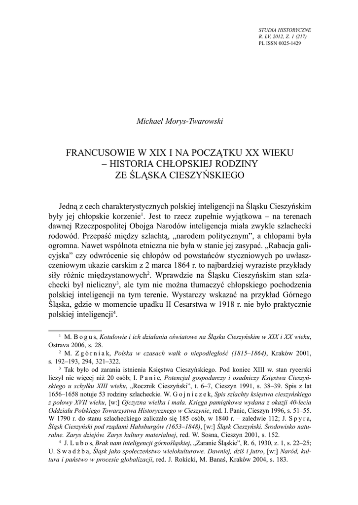 STUDIA HISTORYCZNE R. LV, 2012, Z. 1 (217) PL ISSN 0025-1429 Michael Morys-Twarowski FRANCUSOWIE W XIX I NA POCZĄTKU XX WIEKU – HISTORIA CHŁOPSKIEJ RODZINY ZE ŚLĄSKA CIESZYŃSKIEGO Jedną z cech charakterystycznych polskiej inteligencji na Śląsku Cieszyńskim były jej chłopskie korzenie1. Jest to rzecz zupełnie wyjątkowa – na terenach dawnej Rzeczpospolitej Obojga Narodów inteligencja miała zwykle szlachecki rodowód. Przepaść między szlachtą, „narodem politycznym”, a chłopami była ogromna. Nawet wspólnota etniczna nie była w stanie jej zasypać. „Rabacja galicyjska” czy odwrócenie się chłopów od powstańców styczniowych po uwłaszczeniowym ukazie carskim z 2 marca 1864 r. to najbardziej wyraziste przykłady siły różnic międzystanowych2. Wprawdzie na Śląsku Cieszyńskim stan szlachecki był nieliczny3, ale tym nie można tłumaczyć chłopskiego pochodzenia polskiej inteligencji na tym terenie. Wystarczy wskazać na przykład Górnego Śląska, gdzie w momencie upadku II Cesarstwa w 1918 r. nie było praktycznie polskiej inteligencji4. 1 M. B o g u s, Kotulowie i ich działania oświatowe na Śląsku Cieszyńskim w XIX i XX wieku, Ostrava 2006, s. 28. 2 M. Z g ó r n i a k, Polska w czasach walk o niepodległość (1815–1864), Kraków 2001, s. 192–193, 294, 321–322. 3 Tak było od zarania istnienia Księstwa Cieszyńskiego. Pod koniec XIII w. stan rycerski liczył nie więcej niż 20 osób; I. P a n i c, Potencjał gospodarczy i osadniczy Księstwa Cieszyńskiego u schyłku XIII wieku, „Rocznik Cieszyński”, t. 6–7, Cieszyn 1991, s. 38–39. Spis z lat 1656–1658 notuje 53 rodziny szlacheckie. W. G o j n i c z e k, Spis szlachty księstwa cieszyńskiego z połowy XVII wieku, [w:] Ojczyzna wielka i mała. Księga pamiątkowa wydana z okazji 40-lecia Oddziału Polskiego Towarzystwa Historycznego w Cieszynie, red. I. Panic, Cieszyn 1996, s. 51–55. W 1790 r. do stanu szlacheckiego zaliczało się 185 osób, w 1840 r. – zaledwie 112; J. S p y r a, Śląsk Cieszyński pod rządami Habsburgów (1653–1848), [w:] Śląsk Cieszyński. Środowisko naturalne. Zarys dziejów. Zarys kultury materialnej, red. W. Sosna, Cieszyn 2001, s. 152. 4 J. L u b o s, Brak nam inteligencji górnośląskiej, „Zaranie Śląskie”, R. 6, 1930, z. 1, s. 22–25; U. S w a d ź b a, Śląsk jako społeczeństwo wielokulturowe. Dawniej, dziś i jutro, [w:] Naród, kultura i państwo w procesie globalizacji, red. J. Rokicki, M. Banaś, Kraków 2004, s. 183. 110 Działacze społeczni i narodowi ze Śląska Cieszyńskiego z przełomu XIX i XX w. sprawiają czasami wrażenie „samotnych wysp”, bowiem w literaturze rzadko zwraca się uwagę na środowisko rodzinne, z którego się wywodzili. Tymczasem okazuje się, że wielu z nich było z sobą blisko spokrewnionych lub spowinowaconych. Do wyjątków należą opracowania poświęcone rodzinom Michejdów i Kotulów5. Można zgłosić postulat opracowania rodowodów innych miejscowych działaczy z tego terenu. Dotychczas chłopskie genealogie na Śląsku Cieszyńskim budziły dość nikłe zainteresowanie. Ilość publikacji im poświęconych jest stosunkowo nieliczna, a trzeba mieć jeszcze na uwadze fakt, że część z nich jest pozbawiona aparatu naukowego6. W niniejszym artykule zamierzam się przyjrzeć działalności członków rodziny Francusów ze wsi Gułdowy koło Cieszyna, od początku XIX w. do końca I wojny światowej. Najsłynniejszym przedstawicielem rodu był Franciszek Francus (1870–1962), nauczyciel, pszczelarz i pisarz ludowy7. Okazuje się, że nie był jedynym członkiem rodziny prowadzącym szeroko pojętą działalność społeczną. Za protoplastę Francusów z Gułdowów można uznać Michała [I] Francusa, syna Jerzego [I]. Pochodził z Zabłocia. 13 sierpnia 1799 r. w Cieszynie poślubił Zuzannę, córkę Jerzego Figuli, wdowę po Andrzeju Figuli. Według metryki ślubu pan młody miał 30 lat, a panna młoda 458. Tego typu małżeństwa nie należały do rzadkości na Śląsku Cieszyńskim. Dla młodego mężczyzny była to stosunkowa prosta ścieżka awansu. Wdowa, zwykle jeszcze obarczona nieletnim potomstwem, zyskiwała partnera, który był w stanie prowadzić – nieraz sporych rozmiarów – gospodarstwo. Należy zwrócić uwagę, że okres, jaki dzielił śmierć pierwszego męża od poślubienia drugiego, nie był szczególnie długi. 5 W. S o s n a, Ród Michejdów, „Ziemia Śląska” 2001, s. 43–59; M. B o g u s, Kotulowie i ich działania oświatowe... 6 Oprócz wyżej wymienionych prac zob. L. N o v á k, Ondra Foltýn a jeho rod na Karvínsku. „Těšínsko” 1960, seš. 11, s. 11–15; E. G u z i u r, Rodowód Guziurów 1750–1975. Publikacja wydana z okazji zjazdu rodzinnego 25.10.1975 w Cieszynie, Cieszyn 1975; J. P i l c h, Ustrońska rodzina Lipowczanów, „Pamiętnik Ustroński”, t. 5, 1992, s. 59–73; J. S z t e f e k, Niektóre gałęzie drzewa genealogicznego rodziny Szczepańskich, „Pamiętnik Ustroński”, t. 6, 1993, s. 13; i d e m, Kilka przyczynków do drzewa genealogicznego rodziny Śliwków z Polany, „Pamiętnik Ustroński”, t. 8, 1995, s. 11–12; i d e m, Drzewo genealogiczne Józefa Pilcha, „Pamiętnik Ustroński”, t. 9, 1998, s. 24–26; A. Ż u r e k, Chłopska genealogia, „Kalendarz Cieszyński 2001”, Cieszyn 2000, s. 60–63; M. M o r y s -T w a r o w s k i, Krąg rodzinny Marii Lipa (1830–1920). Ze studiów nad genealogią rodzin chłopskich na Śląsku Cieszyńskim, „Pamiętnik Cieszyński”, t. 20, 2005, s. 11–15. 7 K. S z c z u r e k, Starosta weselny, „Kalendarz Cieszyński 1988”, Cieszyn 1987, s. 135–138; L. M i ę k i n a, Prekursorzy, Cieszyn 1988, s. 116; J. G o l e c, S. B o j d a, Słownik biograficzny ziemi cieszyńskiej, t. 3, Cieszyn 1998, s. 69; L. M i ę k i n a, Znów minie wiek... Antologia literatury nadolziańskiej, Cieszyn 2001, s. 114. 8 Parafia rzymskokatolicka p.w. św. Marii Mag