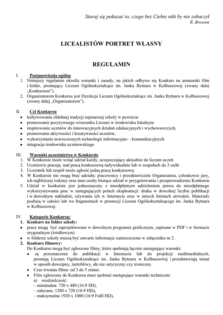 Staraj się pokazać to, czego bez Ciebie nikt by nie zobaczył R. Bresson LICEALISTÓW PORTRET WŁASNY REGULAMIN I. Postanowienia ogólne 1. Niniejszy regulamin określa warunki i zasady, na jakich odbywa się Konkurs na amatorski film i folder, promujący Liceum Ogólnokształcące im. Janka Bytnara w Kolbuszowej (zwany dalej „Konkursem”). 2. Organizatorem Konkursu jest Dyrekcja Liceum Ogólnokształcące im. Janka Bytnara w Kolbuszowej (zwany dalej „Organizatorem”). II. Cel Konkursu kultywowanie chlubnej tradycji najstarszej szkoły w powiecie promowanie pozytywnego wizerunku Liceum w środowisku lokalnym inspirowanie uczniów do innowacyjnych działań edukacyjnych i wychowawczych, promowanie aktywności i kreatywności uczniów, wykorzystanie nowoczesnych technologii informacyjno – komunikacyjnych. integracja środowiska uczniowskiego III. 1. 2. 3. 4. Warunki uczestnictwa w Konkursie W Konkursie może wziąć udział każdy, uczęszczający aktualnie do liceum uczeń Uczniowie pracują nad pracą konkursową indywidualnie lub w zespołach do 3 osób Uczestnik lub zespół może zgłosić jedną pracę konkursową W Konkursie nie mogą brać udziału: pracownicy i przedstawiciele Organizatora, członkowie jury, ich najbliższej rodziny oraz inne osoby biorące udział w przygotowaniu i przeprowadzeniu Konkursu 5. Udział w konkursie jest jednoznaczny z nieodpłatnym udzieleniem prawa do nieodpłatnego wykorzystywania prac w następujących polach eksploatacji: druku w dowolnej liczbie publikacji i w dowolnym nakładzie, używania ich w Internecie oraz w innych formach utrwaleń. Materiały posłużą w całości lub we fragmentach w promocji Liceum Ogólnokształcącego im. Janka Bytnara w Kolbuszowej. IV. Kategorie Konkursu: 1. Konkurs na folder szkoły: prace mogą być zaprojektowane w dowolnym programie graficznym, zapisane w PDF i w formacie oryginalnym (źródłowym). w folderze szkoły muszą być zawarte informacje zamieszczone w załączniku nr 2. 2. Konkurs filmowy: Do Konkursu mogą być zgłoszone filmy, które spełniają łącznie następujące warunki: są przeznaczone do publikacji w Internecie lub do projekcji multimedialnych, promują Liceum Ogólnokształcące im. Janka Bytnara w Kolbuszowej i przedstawiają temat w sposób dowcipny, żartobliwy, ale nie satyryczny czy ironiczny. Czas trwania filmu: od 3 do 5 minut. Film zgłoszony do Konkursu musi spełniać następujące warunki techniczne: a) rozdzielczość: – minimalna: 720 x 480 (16:9 SD), – zalecana: 1280 x 720 (16:9 HD), – maksymalna 1920 x 1080 (16:9 Fulll HD), b) format zapisu: mpg, mov, avi, zalecane H.264, c) rozmiar maksymalny pliku: do 4 GB, d) format dźwięku: preferowane są kodeki MP3 lub AAC, e) film może być nakręcony: kamerą cyfrową, telefonem komórkowym lub aparatem fotograficznym. V. Zgłaszanie prac 1. Prace należy przesłać na adres: dostarczyć na nośniku danych do biblioteki szkolnej wraz z uzupełnioną kartą zgłoszeniową 2. Organizator nie zwraca przekazanych materiałów. 3. Zgłaszający pracę konkursową ponoszą pełną odpowiedzialność za naruszenie praw osób trzecich w związku z wykorzystaniem filmu/folderu. W żadnym wypadku zgłoszony film/ folder nie może mieć wad prawnych, a w szczególności nie może naruszać praw osób trzecich. 4. Warunkiem uczestnictwa w Konkursie jest dostarczenie wraz z pracą prawidłowo wypełnionych i podpisanych następujących dokumentów: karty zgłoszenia do konkursu (załącznik nr 1), zgody na publikację wizerunku osób trzecich występujących w filmie i na zdjęciach wykorzystanych w pracy (załącznik nr 3). 5. Kartę zgłoszeniową można pobrać w bibliotece szkolnej, sekretariacie lub ze strony internetowej LO. 6. Termin zgłaszania prac upływa 16. 12.2016 r. o godz. 14.00. Prace należy dostarczyć do biblioteki szkolnej. 7. Organizator ma prawo do odrzucenia prac, jeśli nie spełniają one wymaganych regulaminem warunków. 8. Organizator zastrzega sobie prawo do wykorzystania nadesłanych filmów lub ich fragmentów w celach promujących liceum. VI. Ocena filmów 1. Jury konkursu powołuje Dyrektor Liceum Ogólnokształcącego im. Janka Bytnara w Kolbuszowej 2. Laureaci konkursu otrzymają nagrody w postaci bonów zakupowych w salonie Empik Kategoria film – I miejsce – 400 złotych, II miejsce – 200 złotych, III miejsce – 100 złotych Kategoria folder – I miejsce – 150 złotych, II miejsce – 100 złotych, III miejsce – 50 złotych 3. Jury wyłoni zwycięzców Konkursu do 22.12.2016 r. Ogłoszenie wyników Konkursu i wręczenie nagród nastąpi na szkolnej uroczystości. 4. Jury zastrzega sobie prawo do innego podziału nagród lub do ich nieprzyznania. 5. Decyzje Jury są ostateczne i nie przysługuje od nich odwołanie. VII. 1. 2. 3. Postanowienia końcowe Wszelkie spory mogące wyniknąć w związku z niniejszym regulaminem lub Konkursem będą rozstrzygane przez sądy właściwe dla siedziby organizatora. Zgłoszenie filmu do konkursu oznacza akceptację postanowień regulaminu. Informacje dotyczące Konkursu umieszczone są na stronie internetowej Organizatora www.http://lokolbuszowa.edupage.org/ Możliwy jest także kontakt informacyjny drogą mailową na adres: [email protected] Wszelkich informacji na temat konkursu udzielają: p. Agnieszka Bałchan (biblioteka szkolna) i p. Ewa Pindel (pedagog szkolny)