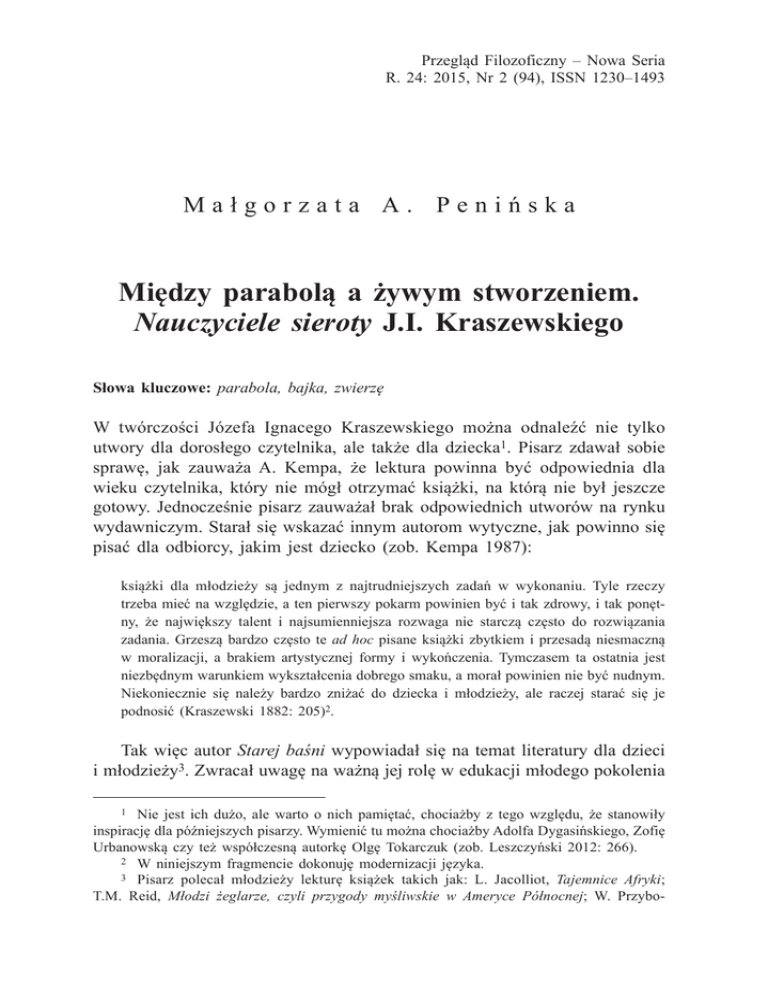 Przegląd Filozoficzny – Nowa Seria R. 24: 2015, Nr 2 (94), ISSN 1230–1493 Małgorzata A. Penińska Między parabolą a żywym stworzeniem. Nauczyciele sieroty J.I. Kraszewskiego Słowa kluczowe: parabola, bajka, zwierzę W twórczości Józefa Ignacego Kraszewskiego można odnaleźć nie tylko utwory dla dorosłego czytelnika, ale także dla dziecka1. Pisarz zdawał sobie sprawę, jak zauważa A. Kempa, że lektura powinna być odpowiednia dla wieku czytelnika, który nie mógł otrzymać książki, na którą nie był jeszcze gotowy. Jednocześnie pisarz zauważał brak odpowiednich utworów na rynku wydawniczym. Starał się wskazać innym autorom wytyczne, jak powinno się pisać dla odbiorcy, jakim jest dziecko (zob. Kempa 1987): książki dla młodzieży są jednym z najtrudniejszych zadań w wykonaniu. Tyle rzeczy trzeba mieć na względzie, a ten pierwszy pokarm powinien być i tak zdrowy, i tak ponętny, że największy talent i najsumienniejsza rozwaga nie starczą często do rozwiązania zadania. Grzeszą bardzo często te ad hoc pisane książki zbytkiem i przesadą niesmaczną w moralizacji, a brakiem artystycznej formy i wykończenia. Tymczasem ta ostatnia jest niezbędnym warunkiem wykształcenia dobrego smaku, a morał powinien nie być nudnym. Niekoniecznie się należy bardzo zniżać do dziecka i młodzieży, ale raczej starać się je podnosić (Kraszewski 1882: 205)2. Tak więc autor Starej baśni wypowiadał się na temat literatury dla dzieci i młodzieży3. Zwracał uwagę na ważną jej rolę w edukacji młodego pokolenia 1 Nie jest ich dużo, ale warto o nich pamiętać, chociażby z tego względu, że stanowiły inspirację dla późniejszych pisarzy. Wymienić tu można chociażby Adolfa Dygasińskiego, Zofię Urbanowską czy też współczesną autorkę Olgę Tokarczuk (zob. Leszczyński 2012: 266). 2 W niniejszym fragmencie dokonuję modernizacji języka. 3 Pisarz polecał młodzieży lekturę książek takich jak: L. Jacolliot, Tajemnice Afryki; T.M. Reid, Młodzi żeglarze, czyli przygody myśliwskie w Ameryce Północnej; W. Przybo- 328 Małgorzata A. Penińska Polaków4. W 1882 r. zostały wydane Bajeczki Kraszewskiego, które uczyły bohatera pochodzącego z ludu „wiary we własne siły, szacunku dla przodków, optymizmu, przekonywały do altruizmu, budowały poczucie słusznej dumy ze swej pozycji społecznej” (Budrewicz 2012: 415). Nie oznacza to, że przed nimi Kraszewski nie pisał żadnych bajek. Jedną z nich jest chociażby utwór o tytule Nauczyciele sieroty5, w którym pisarz starał się pogodzić realia zwierzęce z paraboliczną strukturą utworu, czemu pragnę poświęcić niniejszy artykuł. Nauczyciele sieroty Treść utworu zdaje się na pozór prosta. Ubogi chłopiec po śmierci matki – jedynej opiekunki – wyrusza za radą pastucha do miasta. Po drodze spotyka zwierzęta, które uczą go, m.in. czym jest praca. Tak więc można rzec: typowa bajka, gdzie za stworzeniami kryją się ludzie i nie ma żadnej rzeczywistej wiedzy na temat zwierząt6. Jednakże wątpliwości, czy tak odczytać utwór, rodzą się, gdy weźmiemy pod uwagę kilka istotnych spostrzeżeń. Pierwszym są słowa Kraszewskiego z Nocy bezsennych, gdzie dowiadujemy się, że powieściopisarz: (...) potrzebuje studiów nad encyklopedią całą, aby mógł nawet skromne tło opowiadania sumiennie odtworzyć. Nie wolno mu ani rośliny pomieścić na niewłaściwym jej gruncie, ani kazać rozkwitnąć w niestosownej porze, ani kazać jej wonnością poić, gdy się jej kielich zamyka (Kraszewski 1972: 439). rowski, Bitwa pod Raszynem (zob. Kraszewski 1882: 204). Wiesław Olkusz pisze o dyskusji toczącej się w dziewiętnastowiecznej publicystyce na temat literatury dla dzieci i młodzieży (zob. Olkusz 2000: 30–31). 4 Bolesławita przypisywał dziełu literackiemu istotną rolę w edukacji społeczeństwa. Miało ono jednoczyć naród zamieszkujący w różnych zaborach (zob. Kempa 1987). 5 Utwór ten ukazał się w następujących wydaniach: J.I. Kraszewski (1890), Nowele, obrazki i fantazje. Porządkiem chronologicznym ułożone i wstępem krytycznym poprzedzone przez Piotra Chmielowskiego, Warszawa: Nakład i druk S. Lewentala; J.I. Kraszewski (1907), W oknie; Nauczyciele sieroty, Warszawa: Nakład Gebethnera i Wolffa; J.I. Kraszewski [1918], W oknie; Nauczyciele sieroty, Warszawa: Nakład Gebethnera i Wolffa; J.I. Kraszewski (1960), Bajki i bajeczki, Warszawa: Czytelnik. Nowy Korbut nie podaje, gdzie ukazał się pierwodruk, ale utwór powstał w dwóch partiach. Ma to związek z jego dwudzielną budową, gdzie pod poszczególnymi częściami widnieją daty: „Drezno, 3 maja 1865” i „1866”. Wydanie z 1960 r. rezygnuje z tych adnotacji, a także z podtytułu utworu: „bajka”. 6 Warto tutaj przywołać Janinę Abramowską, która pisze: „bohater bajkowy to nie człowiek «w zwierzęcej skórze», ani – wbrew sugestiom wyglądu – zwykłe zwierzę, ale «człekozwierz» – twór hybrydalny, dający się porównać z satyrem, syreną lub centaurem. Jest on obdarzony nie tylko mową, lecz również – w różnym stopniu – ludzkim sposobem myślenia, odczuwania i zachowania” (Abramowska 1991: 25). Między parabolą a żywym stworzeniem. Nauczyciele sieroty J.I. Kraszewskiego 329 Choć nie padają tutaj słowa na temat zwierząt, to można zastosować je również do nich. Bolesławita dba bowiem o wiarygodność opisów zwierząt i stara się w swoich utworach oddać jak najwierniej ich rzeczywiste zachowania. Gdy będziemy mieli na uwadze powyższe słowa z pamiętnika, ale także uwagi pojawiające się w powieściach, typu: „ciężar, jaki mrówka dźwiga na swój tumulus złożony prawie z mikroskopijnych okruchów, wzbudza większe podziwienie we mnie niż obelisk luksorski, przyciągniony do Paryża” (Kraszewski 1963: 96–97), oraz będziemy pamiętać, że mamy do czynienia z pisarzem nieprzechodzącym obojętnie wobec cierpien