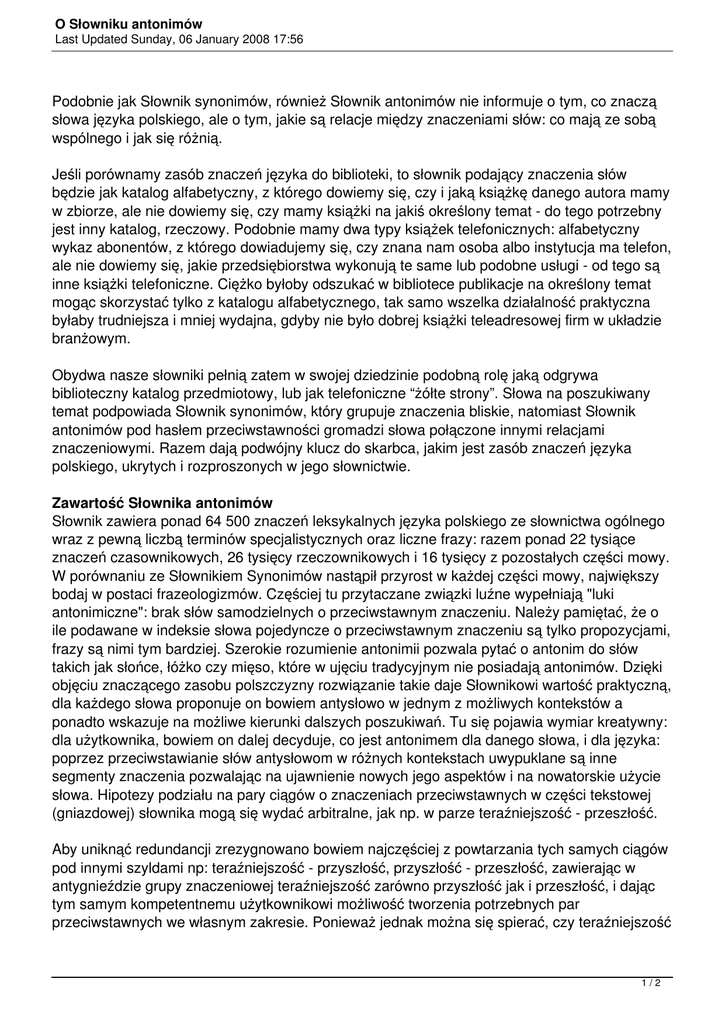 O Słowniku antonimów Last Updated Sunday, 06 January 2008 17:56 Podobnie jak Słownik synonimów, również Słownik antonimów nie informuje o tym, co znaczą słowa języka polskiego, ale o tym, jakie są relacje między znaczeniami słów: co mają ze sobą wspólnego i jak się różnią. Jeśli porównamy zasób znaczeń języka do biblioteki, to słownik podający znaczenia słów będzie jak katalog alfabetyczny, z którego dowiemy się, czy i jaką książkę danego autora mamy w zbiorze, ale nie dowiemy się, czy mamy książki na jakiś określony temat - do tego potrzebny jest inny katalog, rzeczowy. Podobnie mamy dwa typy książek telefonicznych: alfabetyczny wykaz abonentów, z którego dowiadujemy się, czy znana nam osoba albo instytucja ma telefon, ale nie dowiemy się, jakie przedsiębiorstwa wykonują te same lub podobne usługi - od tego są inne książki telefoniczne. Ciężko byłoby odszukać w bibliotece publikacje na określony temat mogąc skorzystać tylko z katalogu alfabetycznego, tak samo wszelka działalność praktyczna byłaby trudniejsza i mniej wydajna, gdyby nie było dobrej książki teleadresowej firm w układzie branżowym. Obydwa nasze słowniki pełnią zatem w swojej dziedzinie podobną rolę jaką odgrywa biblioteczny katalog przedmiotowy, lub jak telefoniczne “żółte strony”. Słowa na poszukiwany temat podpowiada Słownik synonimów, który grupuje znaczenia bliskie, natomiast Słownik antonimów pod hasłem przeciwstawności gromadzi słowa połączone innymi relacjami znaczeniowymi. Razem dają podwójny klucz do skarbca, jakim jest zasób znaczeń języka polskiego, ukrytych i rozproszonych w jego słownictwie. Zawartość Słownika antonimów Słownik zawiera ponad 64 500 znaczeń leksykalnych języka polskiego ze słownictwa ogólnego wraz z pewną liczbą terminów specjalistycznych oraz liczne frazy: razem ponad 22 tysiące znaczeń czasownikowych, 26 tysięcy rzeczownikowych i 16 tysięcy z pozostałych części mowy. W porównaniu ze Słownikiem Synonimów nastąpił przyrost w każdej części mowy, największy bodaj w postaci frazeologizmów. Częściej tu przytaczane związki luźne wypełniają "luki antonimiczne": brak słów samodzielnych o przeciwstawnym znaczeniu. Należy pamiętać, że o ile podawane w indeksie słowa pojedyncze o przeciwstawnym znaczeniu są tylko propozycjami, frazy są nimi tym bardziej. Szerokie rozumienie antonimii pozwala pytać o antonim do słów takich jak słońce, łóżko czy mięso, które w ujęciu tradycyjnym nie posiadają antonimów. Dzięki objęciu znaczącego zasobu polszczyzny rozwiązanie takie daje Słownikowi wartość praktyczną, dla każdego słowa proponuje on bowiem antysłowo w jednym z możliwych kontekstów a ponadto wskazuje na możliwe kierunki dalszych poszukiwań. Tu się pojawia wymiar kreatywny: dla użytkownika, bowiem on dalej decyduje, co jest antonimem dla danego słowa, i dla języka: poprzez przeciwstawianie słów antysłowom w różnych kontekstach uwypuklane są inne segmenty znaczenia pozwalając na ujawnienie nowych jego aspektów i na nowatorskie użycie słowa. Hipotezy podziału na pary ciągów o znaczeniach przeciwstawnych w części tekstowej (gniazdowej) słownika mogą się wydać arbitralne, jak np. w parze teraźniejszość - przeszłość. Aby uniknąć redundancji zrezygnowano bowiem najczęściej z powtarzania tych samych ciągów pod innymi szyldami np: teraźniejszość - przyszłość, przyszłość - przeszłość, zawierając w antygnieździe grupy znaczeniowej teraźniejszość zarówno przyszłość jak i przeszłość, i dając tym samym kompetentnemu użytkownikowi możliwość tworzenia potrzebnych par przeciwstawnych we własnym zakresie. Ponieważ jednak można się spierać, czy teraźniejszość 1/2 O Słowniku antonimów Last Updated Sunday, 06 January 2008 17:56 znaczy to samo w opozycji do przeszłości i do przyszłości, więc niektóre podobne przypadki są rozpisane na dwie lub więcej par. Należy zatem ostrzec, że gniazda jedynie gromadzą możliwe antonimy do wyrazów z gniazda przeciwnego i ani nie wyczerpują zestawu synonimów, ani nie są wolne od przytaczania tych samych znaczeń po raz kolejny, co się nie zdarza w Słowniku Synonimów. Staraliśmy się uwzględnić możliwie dużą liczbę kontekstów, także dla rzadszych użyć. Stąd proponowane podpowiedzi mogą wydać się na pierwszy rzut oka nieprzystawalne, nawet fałszywe. Najjaskrawiej widać to przy ciągach hiponimów. Aczkolwiek nie stanowią grup synonimicznych, weszły one do SłS ze względu na onomazjologiczny jego charakter: pomagają nazwać coś inaczej - a to znaczy raz: dokładniej, kiedy indziej zaś: ogólniej. Włączenie ich również do Słownika Antonimów może wzbudzić wątpliwości. Zwarte grupy hiponimów nie posiadają zwykle tak przejrzyście zbudowanych anty-grup. Dość często jednak hiponimy wchodzą w "bratobójcze" relacje antonimiczne w obrębie tego samego hiperonimu. Wszystkie strony świata są sobie równe, ale można - nie mając nic złego na myśli, tylko wędrując wzdłuż równoleżników albo wzdłuż południków - przeciwstawiać wschód zachodowi, północ zaś południu. Jeżeli hiponimy wchodzą w relację antonimii na zewnątrz swego kręgu, to zwykle poprzez swój hiperonim z jego anty-hiperonimem (miłośnik - przeciwnik). W tych to przypadkach propozycja antonimu w indeksie może się wydać zbyt okazjonalna, nietrafna lub dziwna. Uniknęlibyśmy tych dysonansów wykreślając trochę słów. Pozbawiałoby to nas jednak wiedzy o tej szczególnej odmianie relacji antonimicznej. Słownik stawałby się także mniej drożny: omijanie większych połaci leksyki powoduje, że zmniejsza się liczba wejść do zbioru głównego, co pomniejsza użyteczność słownika. Oprócz tego wiele znaczeń hiponimicznych funkcjonuje przez swą wyrazistość jako prototyp całej grupy objętej zakresem hiperonimu, 
