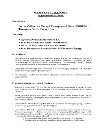 WARSZTATY GIEŁDOWE 25 października 2011r. Organizator: Forum Odbiorców Energii Elektrycznej i Gazu i FORUMCO2 Towarowa Giełda Energii S.A. Partnerzy: Agencja Rozwoju Przemysłu S.A. Izba Rozliczeniowa Giełd Towarowych NOBLE Securities SA Dom Maklerski Izba Energetyki Przemysłowej i Odbiorców Energii Cel spotkania: 1. Zaprezentowanie przemysłowym odbiorcom energii elektrycznej możliwości udziału w obrocie energią elektryczną na rynku giełdowym, procedur korzystania z oferty rozliczeniowej i gwarancji oraz uwarunkowań europejskiego rynku energii i przewidywanych zmian w modelu funkcjonowania rynku w Polsce. 2. Usługi Domu Maklerskiego Noble Securities S.A. w zakresie kupna energii na TGE S.A., w tym nabywania energii poprzez grupę zakupową. 3. Przedstawienie oczekiwań i propozycji odbiorców przemysłowych w zakresie zakupów energii na TGE. Program spotkania: prezentacje i dyskusja 1. Strategia i zamierzenia TGE S.A. Bieżąca problematyka europejskiego i polskiego rynku energii elektrycznej i gazu, funkcjonowanie TGE S.A. na rynku energii elektrycznej dyr. Maciej Olejniczak. 2. Rynek giełdowy: prowadzone rynki i oferta produktowa giełdy, zasady obrotu, zasady uczestnictwa w rynku giełdowym - propozycja dla odbiorców przemysłowych, prezentacja dyr. Leszek Prachniak. 3. Infrastruktura informatyczna giełdy TGE S.A.: platforma informacyjna giełdy, struktura systemu, wymagania techniczne. - dyr. Paweł Opara. 4. Uczestnictwo TGE S.A. w procesie tworzenia europejskiego rynku energii elektrycznej. Prawne, organizacyjne i techniczne uwarunkowania rynku europejskiego i krajowego. Market Coupling jako docelowy model wprowadzania energii importowanej na polski rynek hurtowy – korzyści dla odbiorców przemysłowych, doświadczenia z funkcjonowania na połączeniu kablowym ze Szwecją; możliwości wprowadzenia na połączeniach transgranicznych z Ukrainą. prezentacja - dyr. Jacek Brandt. 5. Izba Rozliczeniowa Giełd Towarowych (IRGiT): członkostwo, procedury rozliczeniowe, koszty uczestnictwa, depozyty, gwarantowanie rozliczeń - prezentacja IRGIT. 6. Dom maklerski w giełdowym obrocie energią elektryczną - zakres usług świadczonych dla nabywców energii elektrycznej, prezentacja - NOBLE Securities S.A.: Możliwości wynikające z pośrednictwa Domów Maklerskich w dostępie do TGE; uwarunkowanie formalno prawne; grupowanie zakupów; zwrot odbiorcom przemysłowym podatku akcyzowego od energii odnawialnej; koszty pośrednictwa a spodziewane efekty dla odbiorców przemysłowych. Termin i miejsce spotkania: 25 października 2011r. (wtorek) , w siedzibie Agencji Rozwoju Przemysłu S.A., ul. Wołoska 7, Warszawa, budynek „MARS”, klatka „A” sala 220, II p. Rozpoczęcie godz. 11:15, lunch ok. godz. 13:00, zakończenie ok. 15:00. Sugerowane miejsce do parkowania – Galeria Mokotów, przejście kładką dla pieszych na drugą stronę ulicy Wołoskiej. Szkolenie jest nieodpłatne dla przedsiębiorstw - Członków Izb zrzeszonych w Forum OEEiG i FORUMCO2 oraz rekomendowanych przez współorganizatorów - Partnerów Forum OEEiG i FORUMCO2 . Koszt uczestnictwa dla innych podmiotów: 450 zł + VAT 23% Informacje i zgłoszenia do 20 października br. Izba Energetyki Przemysłowej i Odbiorców Energii ( IEPiOE) tel.: (22) 545 03 65 faks: (22) 211 19 33 e-mail: [email protected] Henryk Kaliś Towarowa Giełda Energii S.A. Przewodniczący FOEEiG i FORUMCO2