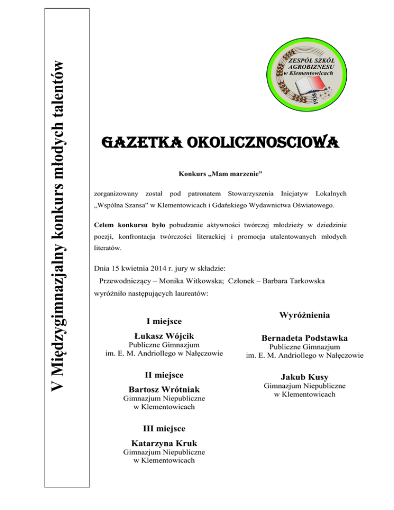 V Międzygimnazjalny konkurs młodych talentów GAZETKA OKOLICZNOSCIOWA Konkurs „Mam marzenie” zorganizowany został pod patronatem Stowarzyszenia Inicjatyw Lokalnych „Wspólna Szansa” w Klementowicach i Gdańskiego Wydawnictwa Oświatowego. Celem konkursu było pobudzanie aktywności twórczej młodzieży w dziedzinie poezji, konfrontacja twórczości literackiej i promocja utalentowanych młodych literatów. Dnia 15 kwietnia 2014 r. jury w składzie: Przewodniczący – Monika Witkowska; Członek – Barbara Tarkowska wyróżniło następujących laureatów: I miejsce Łukasz Wójcik Wyróżnienia Bernadeta Podstawka Publiczne Gimnazjum im. E. M. Andriollego w Nałęczowie Publiczne Gimnazjum im. E. M. Andriollego w Nałęczowie II miejsce Jakub Kusy Bartosz Wrótniak Gimnazjum Niepubliczne w Klementowicach Gimnazjum Niepubliczne w Klementowicach III miejsce Katarzyna Kruk Gimnazjum Niepubliczne w Klementowicach Łukasz Wójcik Klasa I Publiczne Gimnazjum im. E. M. Andriollego w Nałęczowie Opiekun: Justyna Kowalik *** Kiedy myślę o tym wszystkim dookoła, W kraju, żyją miliony ludzi. Gdy patrzę na nas, na nasze ludzkie twarze ile wyciąga swoją pomocną dłoń? i na to co robimy nawet gdy ktoś woła Wiele... tak wielu ludzi się trudzi tak wielu, Zaczynam rozumieć o czym teraz marzę że gdyby tę wielką toń przeliczyć na procenty, Bo mnie boli, że ja słyszę, widzę, czuję coś mnie jednak trzyma więc nie reaguję. te wielkie ludzi odmęty, Na co współczucie kiedy ten brak mocy trzeba by liczyć palcem długi szlak górski zostawia was gdy potrzebujecie pomocy? zer znajdujących się po jednym małym przecineczku I chociaż kłopoty dzieją się za ścianą Jesteśmy pełni dumy lub rozpaczy, wpatruję się w cyfrowy ekran wysłuchując Czy ktoś nam tę słabość ludzką wybaczy? nowinek o strasznych wydarzeniach jakie się dzieją. nie interesują nas bardziej niż my, I marzę, że od dziś ten kraj nowy budując ludzie przepełnieni niechcianą przez fundamenty pokoju na świecie powstaną! nas goryczą i samotnością... Czy wśród tych ludzi jesteś również Ty? Po co to wszystko ma miejsce? Kto w takim razie zaszczyci nas litością? Po co ! zadaję pytanie Dla przereklamowanej popularności? Interesuje nas nasza wygoda, Niech ktoś mi odpowie na nie zarobki czy osobista swoboda, Dla respektu do jakiegoś człowieka, a co z naszą powagą i kulturą? który w pogoni za sławą sprawia Powaga to dla nas eleganckie buty cierpienie niewinnym ludziom za kilka brudnych banknotów. chwaląc się swoją obławą? kulturą jest koncert, Nie wiem. Ale ilu jeszcze ludzi musi tam gdzieś wśród tych łomotów ucierpieć przez nasze rządze pośród których ostatnio byliśmy Ilu? czy film który obejrzeliśmy w kinie. 2 Czasem wracając do domu Czekam na dzień, w którym Ci co są na górze po twardym krocząc asfalcie przestaną zajmować się tym co nieistotne mam ochotę położyć się na nim i w jakiś sposób gdzie wszyscy równi - zamiast żyć w tym murze znaleźć się na łóżku w moim pokoju lub po prostu na zamiast materialistów - pomoce stokrotne. Malcie Żeby to nie portfel był miarą człowieka Lecz ten mój obrazek śliczny żeby po wartościach człowieka oceniał człowieka pyta, po co mam myśleć tak jak teraz żeby znikła wartość tych zielonych śmieci Kiedy wszystko na świecie ludźmi poniewiera żeby życie nasze oraz naszych dzieci Setki metalowych pudeł z ludźmi nie było zależne od jakichś w środku, przemierza w stronę mojej posesji? nieprzyjemnych w dotyku krążków z wybitymi Gdzie jadą? cyferkami. Żyjemy w świecie chciwości i pieniędzy Jestem pewien, że my- ludzie Tam gdzie jedni budują się w złocie jesteśmy w stanie spełnić moje marzenie, Niektórzy żyją na skraju nędzy ale do tego trzeba pomocy każdego, Taki kiedy w strachu przed karą za to zmyka, bo tylko wspólne głosu brzmienie Ucieka gdzie pieprz rośnie, ślad po nich zanika… Tylko wspólnie zaangażowane dłonie tylko wiara która wspólnie płonie Marzę o tym, że doczekam się dnia takiego, jest wstanie nadać temu odpowiednie znaczenie Takiego dnia gdzie ludzie będą żyć chwilą Bez życia od pierwszego do pierwszego Mam takie marzenie chociaż wcale Bez strachu dnia następnego nie dotyczy do końca mnie, dotyczy Gdzie liczy się człowiek a nie czyjeś ego innych i dlatego jest dla mnie na prawdę ważne. Bez zmartwień i rachunków stosu Czekam na ten dzień z nadzieją, że nastanie już juto… bez strachu darów losu Gdzie ludzie nie zapijają smutków w nadziei że to już do skutku 3 Bartosz Wrótniak Klasa III Gimnazjum Niepubliczne w Klementowicach Opiekun: Agnieszka Aleksandrowicz Jestem jak każdy inny i mam marzenia, Uważam, że bez nich człowiek nie wyszedłby z podziemia, Siedzę, patrzę, a w końcu i marzę, Nie zabronisz mi marzyć, gardziłbym takim zakazem, Marzenia prosta rzecz, normalne u wszystkich ludzi, Chcesz je spełnić? To wciśnij sukcesu guzik, Ja mam pełno marzeń i chce je wszystkie spełnić, Chce być bogaty i trwać w szczęściu zupełnym, Chce mieć rodzinę i kluczyki do szybkiego samochodu, Nieśmiertelność i dostęp do nieograniczonego dochodu, Mieć wszystko, a szczególnie wielki i piękny dom, Może pokusiłbym się by w garażu stał też własny czołg, Marzę o dziewczynie co nad wszystko mnie pokocha, Chce spełnić wszystkie marzenia i przed niczym nie będę się cofał, Marzę by zostać mistrzem Polski, Europy i całego świata, W głowie fantastyka identyczna jak w filmie "Avatar", Chce jakoś zapisać się w dzisiejszej historii, Zostać zdolniejszym niż wszyscy razem wzięci zdolni, 4 Katarzyna Kruk Klasa II Gimnazjum Niepubliczne w Klementowicach Opiekun: Agnieszka Aleksandrowicz Popatrz teraz , Jak świat się zmienia. Razem z nim Zmieniają się marzenia. Siedzę, marzę I czekam co czas pokarze. Lecz to przemija, Idzie w niepamięć ta chwila. Ty je rozsiewasz. Gdzie