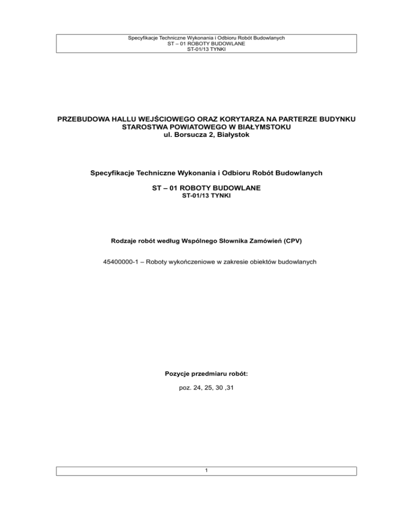 Specyfikacje Techniczne Wykonania i Odbioru Robót Budowlanych ST – 01 ROBOTY BUDOWLANE ST-01/13 TYNKI PRZEBUDOWA HALLU WEJŚCIOWEGO ORAZ KORYTARZA NA PARTERZE BUDYNKU STAROSTWA POWIATOWEGO W BIAŁYMSTOKU ul. Borsucza 2, Białystok Specyfikacje Techniczne Wykonania i Odbioru Robót Budowlanych ST – 01 ROBOTY BUDOWLANE ST-01/13 TYNKI Rodzaje robót według Wspólnego Słownika Zamówień (CPV) 45400000-1 – Roboty wykończeniowe w zakresie obiektów budowlanych Pozycje przedmiaru robót: poz. 24, 25, 30 ,31 1 Specyfikacje Techniczne Wykonania i Odbioru Robót Budowlanych ST – 01 ROBOTY BUDOWLANE ST-01/13 TYNKI A. PRZEDMIOT ST Przedmiotem S.T. są wymagania dotyczące wykonania i odbioru robót tynkarskich dla zadania pod nazwą: .REMONTU HALLU WEJŚCIOWEGO ORAZ KORZYTARZA NA PARTERZE BUDYNKU STAROSTWA POWIATOWEGO W BIAŁYMSTOKU, ul. Borsucza 2, Białystok. Specyfikacja Techniczna stanowi dokument pomocniczy przy realizacji i odbiorze robót. B. ZAKRES ROBÓT Wykonanie tynków wewnętrznych. C. MATERIAŁY Zaprawa cementowo—wapienna, tynki cienkowarstwowe, wyprawa gipsowa D. SPRZĘT Poziomice, szczotki stalowe, skrzynia do zapraw, kielnia murarska, czerpak blaszany, poziomica, łaty kierująca i murarska, warstwomierz naroŜny, pion i sznur murarski, betoniarka elektryczna, wiadra; rusztowania systemowe, wciągniki, Ŝuraw samojezdny,. E. TRANSPORT Samochód cięŜarowy, rozładunek ręczny, dźwig pionowy, transport ręczny. F. WYKONANIE ROBÓT I. PRZYGOTOWANIE PODŁOśA DO TYNKÓW I WYMAGANIA W STOSUNKU DO PODŁOśY 1) PodłoŜe betonowe PodłoŜe betonowe pod tynk powinno być równe, ale nie gładkie i dlatego powinno być wykonywane w deskowaniu z tarcicy niestruganej. Stosowane jest nawet nabijanie na deskowanie listewek w celu stworzenia wgłębień podobnych do niewypełnionych spoin w murze. Gładkie podłoŜe betonowe naleŜy naciąć dłutami ręcznymi lub pneumatycznymi i następnie oczyścić z pyłu i kurzu. Wystające z elementów monolitycznych stalowe pręty i kotwy powinny być usunięte, tak aby nie wchodziły w warstwę tynku lub zabezpieczone antykorozyjnie. Rury i przewody wodno-kanalizacyjne muszą być zaizolowane przed kondensacją pary wodnej. Przygotowanie świeŜego podłoŜa betonowego do tynkowania sprowadza się do czyszczenia go szczotkami, zmycia i zwilŜenia. Dozwolone jest występowanie drobnych raków, niedopuszczalna jest łuszcząca się zendra na powierzchni elementów prefabrykowanych. W przypadku zanieczyszczenia powierzchni betonowej olejem szalunkowym lub sadzą naleŜy ją oczyścić za pomocą piaskowania lub specjalnych preparatów odtłuszczających. Przed rozpoczęciem prac tynkarskich naleŜy dokonać oceny przydatności podłoŜa betonowego np. metodą zwilŜania. W metodzie tej wykonuje się zwilŜenie wodą powierzchni przez zmoczenie jej pędzlem malarskim średniej twardości. Za powierzchnięnadającą się do tynkowania naleŜy uznać tą, na której znikną krople wody oraz nastąpi zmiana koloru z jasnego na ciemny w ciągu 5 minut. Brak takiego wyniku badania świadczy o niedostatecznie wyschniętym lub zbyt szczelnym betonie, alboo pozostałości na powierzchni środka antyadhezyjnego. Szczegółowe badanie wilgotności podłoŜa betonowego naleŜy wykonywać za pomocą specjalistycznego wilgotnościomierza lub przez 2 Specyfikacje Techniczne Wykonania i Odbioru Robót Budowlanych ST – 01 ROBOTY BUDOWLANE ST-01/13 TYNKI próbę suszenia do stałej masy próbki popranej z minimalnej głębokości 2 cm przy uŜyciu szybkoobrotowej wiertnicy z wiertłem koronowym o minimalnej średnicy 25 mm. Powierzchnie betonowe o wilgotności masowej przekraczającej 4% nie powinny być tynkowane, poniewaŜ w takim przypadku moŜe dochodzić do obsuwania się mokrej zaprawy z powierzchni ściany. Powierzchnie betonowe osiągają wilgotność w przedziale 2,5^1% latem po 8 tygodniach od betonowania, zimą po 80 dniach bez mrozu. Tynki zwykłe, cementowo-wapienne mogą być wykonywane bez stosowania środków gruntujących na powierzchniach betonowych szorstkich, dobrze chłoniących wodę, o wilgotności poniŜej 2,5%. Tynki pocienione moŜna wykonywać na powierzchniach równych, dobrze chłonących wodę. W przypadku wykonywania tynków zawierających gips naleŜy na podłoŜe stosować środki gruntujące - tzw. mostki adhezyjne zwiększające przyczepność zaprawy tynkarskiej. Badania stanu podłoŜy betonowych moŜna przeprowadzać wg tabeli 1. Tabela 1. Lista kontrolna do sprawdzania stanu podłoŜa pod tynk Cecha wilgotność równość podłoŜa przywierające ciała obce, kurz, zabrudzenia luźne części podłoŜa resztki oleju szalunkowego, środków anty-adhezyjnych słaba chłonność podłoŜa Metoda kontroli i sprawdzania Wynik kontroli Środki zaradcze wygląd ciemny kolor próba dotyku odczucie wilgoci próba zwilŜania powolne wchłanianie wilgoci lub jej brak sprawdzenie za pomocą łaty wg PN-80/B-10021 oraz PN-70/B10025 wygląd nierówności wyrównać, jeŜeli nierówności są powyŜej dopuszczalnych róŜnica w kolorze, zgrubienia oczyszczenie przy pomocy szczotek, względnie wody i pozostawienie do wyschnięcia próba ścierania kurzenie się próba skrobania odłupywanie się części podłoŜa próba dotyku pylenie próba zwilŜania woda nie wsiąka (tworzy krople) światło ultrafioletow e wygląd fluoroscencyjne świecenie pow. błyszcząca próba dotyku pow. gładka próba zwilŜania beton nie zmienia koloru z jasnego na ciemny próba skrobania złuszczenia i powierzchniowe odspojenia betonu odrywanie się, łuszczenie 3 odczekać aŜ podłoŜe wyschnie dokładne usunięcie zanieczyszczeń przy pomocy szczotek, mioteł zmycie czystą wodą i pozostawienie do wyschnięcia lub zastosowanie środków specj alistycznych zastosować środki zwiększające przyczepność szczotkowanie szczotką stalową, piaskowanie, szlifowanie Specyfikacje Techniczne Wykonania i Odbioru Robót Budowlanych ST – 01 ROBOTY BUDOWL