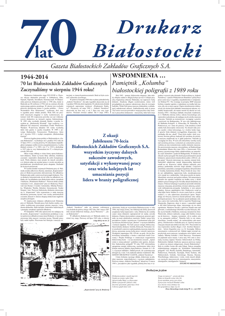 70 lat Drukarz Białostocki Gazeta Białostockich Zakładów Graficznych S.A. WSPOMNIENIA … 70 lat Białostockich Zakładów Graficznych Pamiętnik „Kolumba” Zaczynaliśmy w sierpniu 1944 roku! białostockiej poligrafii z 1989 roku 1944-2014 Drukarstwo białostockie sięga XVI-XVIII w. Pierwsze oficyny drukarskie powstały w Zabłudowie, Ełku, Sejnach, Supraślu, Suwałkach, Siemiatyczach. W Białymstoku pierwsze drukarnie powstały w 1798 roku, kiedy to Białystok po III rozbiorze (1794) stał się centrum obwodu rejencyjnego państwa pruskiego. W okresie tym wychodzi pierwsze periodyczne pismo w języku polskim – „Nowo Wschodnich Prus Doniesienia”, wydawane dwa razy w tygodniu przez władze pruskie. Wiek XIX nie przyniósł znacznych osiągnięć w ruchu wydawniczym, natomiast wiek XX rozpoczyna powolny acz już widoczny rozwój drukarstwa na terenach regionu białostockiego. W 1903 roku wychodzi dziennik lokalny w języku rosyjskim pt. „Biełostockij Wiestnik”. Jego wydawcą i redaktorem był miejscowy dziennikarz Fiodor Wasilewicz Wasiljew. W pierwszej dekadzie XX wieku wychodzą także inne gazety w języku rosyjskim. W 1909 r. powstaje Białostockie Towarzystwo Wydawnicze, które od 1 stycznia 1910 r. wydaje czasopismo „Biełostockaja Gazieta”. Pierwsze legalne pismo polskie w Białymstoku to „Gazeta Białostocka”, wychodzące od 1 grudnia 1912 roku do 15 lipca 1915 r. z roczną przerwą. Po odzyskaniu niepodległości następuje szybki rozwój czasopiśmiennictwa. Liczba drukarń wzrasta z 7 w 1905 r. do 17 w 1919 r, dochodząc w 1937 roku (w woj. białostockim) do 37, w których pracowało 248 osob. Okres wojny obfituje w różne formy oporu białostockich drukarzy. Znane są liczne fakty sabotaży, kradzieży czcionek i materiałów drukarskich do celów konspiracyjnych. Wielu drukarzy musi przejść do innych zawodów, a ci, którym udaje się uzyskać pracę w swoim zawodzie są prześladowani, przesłuchiwani przez okupanta. Dochodzi do licznych aresztowań. W wyniku działań wojennych Drukarnia przy ul. Malmeda została całkowicie zburzna, natomiast „Koperciarnia” przy ul. Brukowej poważnie zdewastowana. Do odbudowy Drukarni jako jedni z pierwszych przystąpili drukarze. Praca drukarzy koncentrowała się nie tylko na odbudowie zakładu, ale i na składaniu oraz drukowaniu odezw, zarządzeń i biuletynu „Wiadomości Radiowe”. Pierwsze druki zostały wykonane w tzw. „Koperciarni” przy ul. Brukowej. Pracowali tam Roman i Czesław Antonienko, Mikołaj Pietraszko, Władysław Wachla, Bolesław Gierasimczuk, Teodor Siergiej i inni. Pierwsza białostocka drukarnia mieszcząca się w „Koperciarni” była wyposażona w małą maszynę dociskową poruszaną ręcznie oraz trochę poniemieckich czcionek, którymi w okresie okupacji drukowano nagłówki urzędowych kopert. W międzyczasie drukarze odbudowywali Drukarnię przy ul. Malmeda. Warunki pracy były bardzo ciężkie, mozolnie wydobywano przysypane gruzem maszyny i urządzenia drukarskie. Brak narzędzi, materiałów budowlanych i pieniędzy utrudniał i opóźniał odbudowę. W listopadzie 1944 roku opuszczono nie nadającą się do użytku „Koperciarnię” i uruchomiono produkcję w części parterowej odbudowywanej starej Drukarni, w tej części utworzono halę maszyn i zecernię ręczną. Warunki pracy były nadal ciężkie. Pracowano bez linotypu i maszyny ro- tacyjnej, w ciasnych pomieszczeniach. Brak też było czcionek i materiału zecerskiego. W połowie listopada 1944 roku wydano jednodniówkę „Jedność Narodowa”. Już jako tygodnik ukazywała się od 3 grudnia 1944 roku dość regularnie. Po zakończeniu działań wojennych zaprzestano wydawać „Wiadomości Radiowe”. Począwszy od maja 1945 r. „Jedność Narodowa” ukazywała się dwa razy, a od 3 lipca trzy razy tygodniowo. Wzrastał również nakład. Od 9 maja 1946 r. Rok 1943 – ponura, hitlerowska okupacja. Jako młody chłopiec stałem w długiej kolejce po nici w sklepie przy ulicy Kupieckiej (obecnie Malmeda), tuż naprzeciw byłej drukarni. Znudzony długim oczekiwaniem, mimo woli przyglądałem się, poprzez zakratowane okna do wewnątrz budynku. Widać było pracę maszyny drukarskiej, wykładającej zadrukowane arkusze. Zaabsorbowała mnie ta praca i być może wewczes powstała w mojej psychice chęć zastania w przyszłości drukarzem – maszynistą. Jakie było moje Z okazji Jubileuszu 70-lecia Białostockich Zakładów Graficznych S.A. wszystkim życzymy dalszych sukcesów zawodowych, satysfakcji z wykonywanej pracy oraz wielu kolejnych lat umacniania pozycji lidera w branży poligraficznej „Jedność Narodowa” stała się pismem codziennym i wychodziła do połowy lutego 1947 roku. Od 1 marca 1947 roku zaczęto drukować mutację „Życie Warszawy” – „Życie Białostockie”. W odbudowie drukarni przy ul. Malmeda należy wyróżnić trzy etapy. Pierwszy od lipca 1945 roku, w okresie (ciąg dalszy na str. 2) zdziwienie, kiedy po wyzwoleniu Białostocczyzny w roku 1944, mąż mojej siostry, Jan Aleksiejczuk (który przewoził urządzenia byłej koperciarni z ulicy Brukowej do ocalałej części starej drukarni) zaproponował mi naukę zawodu drukarza. Chętnie skorzystałem z propozycji, przecież spełniały się moje młodzieńcze marzenia. Nauka i praca były początkowo ciężkie i prymitywne. Uruchomiono tylko jedną maszynę dociskową typu „Boston” o ręcznym nakładzie i nożnym napędzie. Nie było jeszcze energii elektrycznej. Starsi koledzy drukarze: Grybok, Klimczak, Pietraszko i inni uruchomili częściowo spaloną płaską maszynę stopcylindrową, poruszaną ręczną korbą przez czterech mężczyzn. Wydajność imponująca 100–120 ark. na godz. Ale już drukowaliśmy komunikaty z frontu o sukcesach Armii Czerwonej i Wojska Polskiego w ostatecznym rozgromieniu hitlerowskiej bestii – i to nas niezmiernie cieszyło. „Apetyt rośnie w miarę jedzenia”, podob