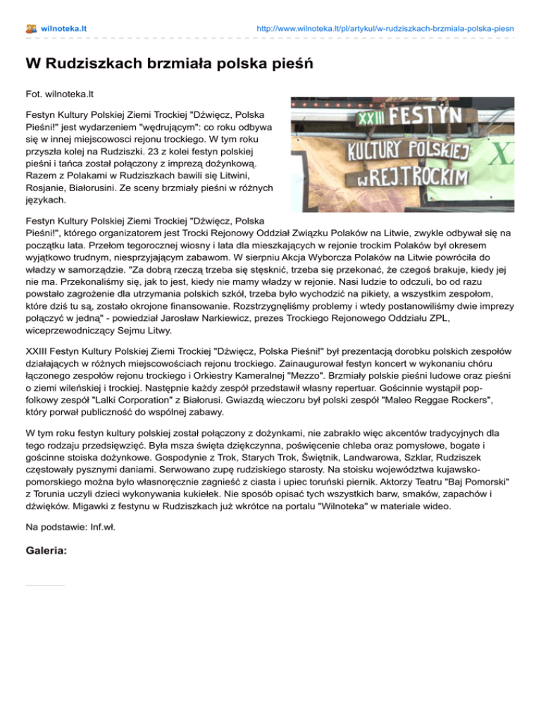 wilnoteka.lt http://www.wilnoteka.lt/pl/artykul/w-rudziszkach-brzmiala-polska-piesn W Rudziszkach brzmiała polska pieśń Fot. wilnoteka.lt Festyn Kultury Polskiej Ziemi Trockiej "Dźwięcz, Polska Pieśni!" jest wydarzeniem "wędrującym": co roku odbywa się w innej miejscowosci rejonu trockiego. W tym roku przyszła kolej na Rudziszki. 23 z kolei festyn polskiej pieśni i tańca został połączony z imprezą dożynkową. Razem z Polakami w Rudziszkach bawili się Litwini, Rosjanie, Białorusini. Ze sceny brzmiały pieśni w różnych językach. Festyn Kultury Polskiej Ziemi Trockiej "Dźwięcz, Polska Pieśni!", którego organizatorem jest Trocki Rejonowy Oddział Związku Polaków na Litwie, zwykle odbywał się na początku lata. Przełom tegorocznej wiosny i lata dla mieszkających w rejonie trockim Polaków był okresem wyjątkowo trudnym, niesprzyjającym zabawom. W sierpniu Akcja Wyborcza Polaków na Litwie powróciła do władzy w samorządzie. "Za dobrą rzeczą trzeba się stęsknić, trzeba się przekonać, że czegoś brakuje, kiedy jej nie ma. Przekonaliśmy się, jak to jest, kiedy nie mamy władzy w rejonie. Nasi ludzie to odczuli, bo od razu powstało zagrożenie dla utrzymania polskich szkół, trzeba było wychodzić na pikiety, a wszystkim zespołom, które dziś tu są, zostało okrojone finansowanie. Rozstrzygnęliśmy problemy i wtedy postanowiliśmy dwie imprezy połączyć w jedną" - powiedział Jarosław Narkiewicz, prezes Trockiego Rejonowego Oddziału ZPL, wiceprzewodniczący Sejmu Litwy. XXIII Festyn Kultury Polskiej Ziemi Trockiej "Dźwięcz, Polska Pieśni!" był prezentacją dorobku polskich zespołów działających w różnych miejscowościach rejonu trockiego. Zainaugurował festyn koncert w wykonaniu chóru łączonego zespołów rejonu trockiego i Orkiestry Kameralnej "Mezzo". Brzmiały polskie pieśni ludowe oraz pieśni o ziemi wileńskiej i trockiej. Następnie każdy zespół przedstawił własny repertuar. Gościnnie wystąpił popfolkowy zespół "Lalki Corporation" z Białorusi. Gwiazdą wieczoru był polski zespół "Maleo Reggae Rockers", który porwał publiczność do wspólnej zabawy. W tym roku festyn kultury polskiej został połączony z dożynkami, nie zabrakło więc akcentów tradycyjnych dla tego rodzaju przedsięwzięć. Była msza święta dziękczynna, poświęcenie chleba oraz pomysłowe, bogate i gościnne stoiska dożynkowe. Gospodynie z Trok, Starych Trok, Świętnik, Landwarowa, Szklar, Rudziszek częstowały pysznymi daniami. Serwowano zupę rudziskiego starosty. Na stoisku województwa kujawskopomorskiego można było własnoręcznie zagnieść z ciasta i upiec toruński piernik. Aktorzy Teatru "Baj Pomorski" z Torunia uczyli dzieci wykonywania kukiełek. Nie sposób opisać tych wszystkich barw, smaków, zapachów i dźwięków. Migawki z festynu w Rudziszkach już wkrótce na portalu "Wilnoteka" w materiale wideo. Na podstawie: Inf.wł. Galeria: