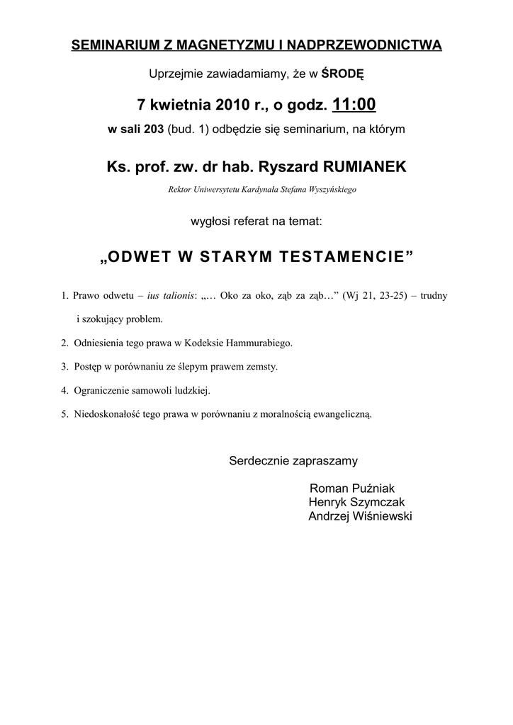 SEMINARIUM Z MAGNETYZMU I NADPRZEWODNICTWA Uprzejmie zawiadamiamy, że w ŚRODĘ 7 kwietnia 2010 r., o godz. 11:00 w sali 203 (bud. 1) odbędzie się seminarium, na którym Ks. prof. zw. dr hab. Ryszard RUMIANEK Rektor Uniwersytetu Kardynała Stefana Wyszyńskiego wygłosi referat na temat: „ODWET W STARYM TESTAMENCIE” 1. Prawo odwetu – ius talionis: „… Oko za oko, ząb za ząb…” (Wj 21, 23-25) – trudny i szokujący problem. 2. Odniesienia tego prawa w Kodeksie Hammurabiego. 3. Postęp w porównaniu ze ślepym prawem zemsty. 4. Ograniczenie samowoli ludzkiej. 5. Niedoskonałość tego prawa w porównaniu z moralnością ewangeliczną. Serdecznie zapraszamy Roman Puźniak Henryk Szymczak Andrzej Wiśniewski