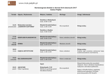 www.mok.pelplin.pl Harmonogram działań w okresie ferii zimowych 2017 Gmina Pelplin Termin Zajęcia / Wydarzenia Miejsce / Godzina Dla kogo Uwagi / Informacje Dla wszystkich Wstęp wolny. Świetlica w Bielawkach Godz. 10:00-11:00 16.01 Widowisko teatralne poniedziałek „CZERWONY KAPTUREK” Miejski Ośrodek Kultury Godz. 12:00-13:00 Świetlica w Rudnie Godz. 14:00-15:00 17.01 DZIEŃ GIER PLANSZOWYCH wtorek Miejski Ośrodek Kultury Godz. 10:00-13:00 Dzieci, młodzież, dorośli Wstęp wolny. 17.01 ZUMBA wtorek Miejski Ośrodek Kultury Godz. 14:30-15:30 Młodzież, dorośli Wstęp wolny. Miejski Ośrodek Kultury Godz. 11:00-14:00 Dzieci, młodzież Wstęp wolny. Podczas zajęć uczestnicy wykonywać będą maski karnawałowe oraz biżuterię. Miejski Ośrodek Kultury Godz. 11:00-14:00 Dzieci z rodzicami Wstęp wolny. 18.01 środa ZAJĘCIA ARTYSTYCZNE 19.01 BAL KARNAWAŁOWY czwartek Sopot 20.01 AQUAPARK piątek Pobyt 3-godzinny Wyjazd godz. 9.30 Zbiórka na parkingu przed Ośrodkiem Kultury Dla wszystkich Wyjazd dobrowolny dla wszystkich chętnych. Dzieci i młodzież niepełnoletnia wyłącznie z dorosłym opiekunem. Zapisy w Ośrodku Kultury, najpóźniej tydzień przed wyjazdem. W drodze powrotnej postój w MC Donald’s. www.mok.pelplin.pl Odpłatność: 15 zł/os. (opłata obejmuje wyłącznie transport) Opłatę za bilet wstępu uczestnicy uiszczają we własnym zakresie: Koszt wg cennika Aquaparku: dzieci do ukończenia 3 lat - wchodzą bezpłatnie Bilet za 3-godzinny pobyt – 38 zł 23.01 TURNIEJ FIFA 16 poniedziałek Miejski Ośrodek Kultury Godz. 10:00-14:00 Uczniowie klas IV-VI szkoły podstawowej, gimnazjaliści oraz młodzież starsza Wstęp wolny. Liczba miejsc ograniczona. Zgłoszenia do 20.01.2017 Dla wszystkich Wstęp wolny. Dla wszystkich Koszt biletu: 16 zł Ceny biletów wg cennika Profesjonalnego Kina Objazdowego OUTDOOR CINEMA Dla wszystkich Odpłatność: 10 zł/os. (Wypożyczenie łyżew we własnym zakresiekoszt 6 zł). W drodze powrotnej postój w MC Donald’s. Świetlica w Rajkowach Godz. 12.00 – 13.00 23.01 Widowisko teatralne poniedziałek „MISIO TULISIO” Świetlica w Międzyłężu Godz. 14.00 – 15.00 Świetlica w Lignowach Szl. Godz. 16.00 – 17.00 24.01 KINO wtorek OUTDOOR CINEMA 25.01 LODOWISKO środa Wycieczka do Malborka Miejski Ośrodek Kultury Godz. 11:00-21:00 Wyjazd godz. 10.30 Zbiórka na parkingu przed Ośrodkiem Kultury Powrót ok. godz. 15:30 www.mok.pelplin.pl 25-27.01 PLAC ZABAW środapiątek (dmuchańce, inne atrakcje) Miejski Ośrodek Kultury Godz. 11.00 – 19.00 Dzieci przedszkolne i szkolne Odpłatność: 30 min. – 5 zł/os. 1 godz. – 10 zł/os. Dodatkowo możliwość zakupu popcornu i waty cukrowej Odpłatność : Dorośli - 30 zł Dzieci i młodzież - 20 zł 26.01 czwartek SNOWTUBING Wycieczka do Wieżycy (Kaszuby) Jazda po śniegu na gumowej dętce. Zabawa dla każdego, nie wymaga żadnych specjalnych umiejętności! Wyjazd o godz. 7.45 Zbiórka na parkingu przed Ośrodkiem Kultury Powrót ok. godz. 16:00 Dla wszystkich Koszt wycieczki zawiera: 10 zjazdów na gumowej dętce, bezpłatne przebywanie w chacie grillowej z możliwością pieczenia przywiezionych ze sobą kiełbasek, bezpłatne korzystanie z toalety. Z wyjazdu bez opieki rodziców korzystać mogą osoby po ukończeniu 13 lat. Wymagana zgoda rodziców. Zapisy na wyjazdy w biurze Miejskiego Ośrodka Kultury w Pelplinie, ul. Kościuszki 2A, od poniedziałku do piątku w godz. 8.00–15.00. Tel./fax. 58 536 14 52 Kom. 789-240-990 e-mail: [email protected] www.mok.pelplin.pl