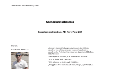 OPRACOWAŁ WALDEMAR WĘGLARZ Scenariusz szkolenia Prezentacje multimedialne MS PowerPoint 2010 TRENER: WALDEMAR WEGLARZ Absolwent Akademii Pedagogicznej w Krakowie. Od 2002 roku zawodowy trener IT, dyplomowany nauczyciel przedmiotów zawodowych w Technikum Informatycznym. Egzaminator ECDL Core, ECDL Advanced. Autor książek do ECDL Core, ECDL advanced oraz MS Office: “ECDL na skróty”, wyd. PWN 2011r. “ECDL Advanced na skróty”, wyd. PWN 2011r. „Przeglądanie stron internetowych i komunikacja”, wyd. PWN 2011r. „Office 2010”, wyd. PWN 2012 r. OPRACOWAŁ WALDEMAR WĘGLARZ MS PowerPoint – prezentacje multimedialne: Prezentacja multimedialna to jedna z ciekawszych i częściej wykorzystywanych form przekazu i komunikacji. Jest narzędziem wspomagającym i uatrakcyjniającym wystąpienie prelegenta. Prezentację multimedialną tworzymy z myślą o wzmocnieniu przekazu, a nie zastąpieniu wystąpienia pokazem slajdów. Optymalny przekaz to taki, w którym prelegent przedstawia treści, odwołując się jednocześnie do wyświetlanych slajdów. Przygotowując wystąpienie, powinniśmy pamiętać o zasadzie, że odbiorca zapamiętuje tylko 20% przekazu w postaci wykładu, około 30% treści oglądanych i aż 70% przekazu, w którym wykorzystane są oba kanały. PREZENTACJA MULTIMEDIALNA Lp. Temat Godz 1 Uruchamianie programu Microsoft PowePoint. Charakterystyka ogólna środowiska pracy Microsoft PowerPoint. 1 2 Elementy prezentacji: Strona tytułowa, strona z punktami, dwie kolumny zawierające tekst, animacje, tabele – czynności tworzenia. 4 Cel minimum Uczestnik szkolenia potrafi: uruchomić program do tworzenia prezentacji: z pulpitu i paska zadań, wymienić elementy składowe okna aplikacji PowerPoint, Cel oczekiwany Uczestnik szkolenia potrafi: scharakteryzować elementy składowe okna aplikacji PowerPoint, wykonać proste operacje programu do tworzenia slajdów, projektować proste układy slajdów, korzystać z okna dialogowego Wybierz Autoukład, zasady i kolejność prac nad prezentacją właściwie komponować prezentacje wspomagające wystąpienia, OPRACOWAŁ WALDEMAR WĘGLARZ Lp. Temat Godz Cel minimum Uczestnik szkolenia potrafi: tworzyć wykresy w programie PowerPoint, formatować poszczególne elementy wykresu, zmienić rodzaj wykesu, Cel oczekiwany Uczestnik szkolenia potrafi: wstawiać i przyłączać do dokumentu tekstowego informacje w postaci: wykresów, obiektów filmowych i dźwiękowych, zastosować niestandardowe przejścia i animacje, 3 Wykres jako element prezentacji. Formatowanie wykresu. Zmiana rodzaju wykresu. 3 4 Efekty specjalne: rzut, przylot, animacja tabeli – wykresu. 2 zastosować standardowe przejścia i animacje, 5 Modyfikacja prezentacji: zmiana układu slajdu, tło slajdu 1 zmieniać układ slajdu, wprowadzać tło, 6 Dołączanie dowolnych obiektów do slajdów. 1 importować i eksportować elementy tekstowe i graficzne, 7 Kreator zawartości prezentacji. 1 korzystać z kreatora zawartości prezentacji, 8 Wstawianie dźwięków i filmów do prezentacji. 1 wstawić dźwięk, wstawić film, 9 Przedstawienie prezentacji. 3 uruchomić pokaz slajdów, ustawić czas dla slajdów, prowadzić połączenia między innymi slajdami w obrębie prezentacji, potrafi prowadzić prezentację zdalną, przeprowadza pokaz prezentacji na forum klasy, zgodnie z obowiązującymi zasadami, dodawać kształty do prezentacji, kreślić obiekty, rozpoczynać pokaz od dowolnego slajdu, usuwać oraz dodawać slajdy, zmieniać kolejność slajdów, ukrywać slajdy, dodawać notatek prelegenta do prezentacji, propaguje treści etyczne i zgodne z prawem zastosować narzędzia nawigacji, OPRACOWAŁ WALDEMAR WĘGLARZ Lp. Temat Godz 10 Przenoszenie prezentacji do dokumentu w edytorze Word i na stronę WWW. Drukowanie zawartości prezentacji. 2 11 Prezentacja w programie PowerPoint – ćwiczenia utrwalające i sprawdzające. 4 Cel minimum Uczestnik szkolenia potrafi: drukować zawartość prezentacji, Cel oczekiwany Uczestnik szkolenia potrafi: przenieść prezentację do dokumentu w edytorze Word i odwrotnie, zapisywać prezentację przeznaczoną do rozpowszechniania w Internecie, wstawić hiperłącz w prezentacji, tworzyć własny niepowtarzalny projekt prezentacji na zadany temat, tworzyć prezentację na dowolny temat z wykorzystaniem szablonów,