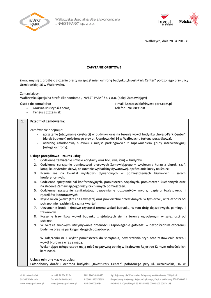 Wałbrzych, dnia 28.04.2015 r. ZAPYTANIE OFERTOWE Zwracamy się z prośbą o złożenie oferty na sprzątanie i ochronę budynku „Invest-Park Center” położonego przy ulicy Uczniowskiej 16 w Wałbrzychu. Zamawiający: Wałbrzyska Specjalna Strefa Ekonomiczna „INVEST-PARK” Sp. z o.o. (dalej: Zamawiający) Osoba do kontaktów: - Grażyna Muszyńska Szmaj - Ireneusz Szcześniak 1. e-mail: [email protected] Telefon: 781 889 998 Przedmiot zamówienia: Zamówienie obejmuje: - sprzątanie (utrzymanie czystości) w budynku oraz na terenie wokół budynku „Invest-Park Center” (dalej: budynek) położonego przy ul. Uczniowskiej 16 w Wałbrzychu (usługa porządkowa). - ochronę całodobową budynku i miejsc parkingowych z zapewnieniem grupy interwencyjnej (usługa ochrony). Usługa porządkowa – zakres usług: 1. Codzienne zamiatanie i mycie korytarzy oraz holu (wejściu) w budynku. 2. Codzienne sprzątanie pomieszczeń biurowych Zamawiającego – wycieranie kurzu z biurek, szaf, lamp, kaloryferów, drzwi, odkurzanie wykładziny dywanowej, opróżnianie koszy na śmieci. 3. Pranie raz na kwartał wykładzin dywanowych w pomieszczeniach biurowych i salach konferencyjnych. 4. Codzienne sprzątanie sal konferencyjnych, pomieszczeń socjalnych, pomieszczeń kuchennych oraz na zlecenie Zamawiającego wszystkich innych pomieszczeń. 5. Codzienne sprzątanie sanitariatów, uzupełnianie dozowników mydła, papieru toaletowego i ręczników jednorazowych. 6. Mycie okien (wewnątrz i na zewnątrz) oraz powierzchni przeszklonych, w tym drzwi, w zależności od potrzeb, nie rzadziej niż raz na kwartał. 7. Utrzymanie letnie i zimowe czystości terenu wokół budynku, w tym dróg dojazdowych, parkingu i trawników. 8. Koszenie trawników wokół budynku znajdujących się na terenie ogrodzonym w zależności od potrzeb. 9. W okresie zimowym utrzymywanie drożności i zapobieganie gołoledzi w bezpośrednim otoczeniu budynku oraz na parkingu i drogach dojazdowych. W załączeniu nr 1 wykaz pomieszczeń do sprzątania, powierzchnia szyb oraz zestawienie terenu wokół biurowca wraz z mapą. Wykonujące usługę osoby mają mieć negatywną opinię w Krajowym Rejestrze Karnym odnośnie ich karalności. Usługa ochrony – zakres usług: Całodobowy dozór i ochrona budynku „Invest-Park Center” położonego przy ul. Uczniowskiej 16 w Wałbrzychu wraz z parkingiem oraz obsługą recepcji. Przez dozór i ochronę rozumie się: 1. Ochronę wszystkich pomieszczeń (w tym korytarzy i klatek schodowych) znajdujących się w budynku wraz z parkingami przed kradzieżami i bezprawnymi wtargnięciami z zewnątrz oraz w wnętrza budynku, z obowiązkiem informowania o tych zdarzeniach właściwych służb i Zamawiającego; 2. Monitorowanie w zakresie wystąpienia awarii urządzeń dostawy mediów, pożaru i klęsk żywiołowych, systemów alarmowych itp. Z obowiązkiem informowania o tych zdarzeniach właściwych służb Zamawiającego. Monitorowanie będzie się odbywać poprzez elektroniczny system monitorowania oraz przez wykonywanie obchodów kontrolnych na zasadzie obserwacji całej infrastruktury technicznej chronionego budynku; 3. Monitorowanie systemu sygnalizacji przeciwpożarowej na zasadach określonych w instrukcji p.poż.; 4. Zabezpieczenie miejsc parkingowych przed zajęciem przez osoby nieuprawnione; 5. Zapewnienie grupy interwencyjnej przez całą dobę; co najmniej jedną zmotoryzowaną; wyposażoną w radiowe środki łączności z czasem dojazdu nie przekraczającym 15 minut, składającymi się z co najmniej dwóch kwalifikowanych pracowników ochrony każda; 6. Obsługę recepcji. Przez obsługę recepcji rozumie się obsługę stanowiska systemu monitorowania budynku umieszczonego w recepcji oraz udzielanie informacji osobom odwiedzającym budynek. Wykonawca zapewni odpowiedni strój służbowych (w uzgodnieniu ze zleceniodawcą) dla pracowników ochrony. Ponadto Wykonawca: 1. zapewni min. dwóch pracowników w godz. od 7:00 do 17:00, a w pozostałych 1 osobę 2. będzie zgodnie z prawem i posiadanymi uprawnieniami podejmował działania zmierzające do ujęcia lub usunięcia osób trzecich stwarzających zagrożenie, zakłócającymi spokój, dokonujących kradzieży lub dewastacji mienia na terenie budynku i jego otoczeniu, zgodnie z mapą stanowiącą załącznik nr 1 3. zapewni całodobowy dostępu do nieruchomości pracownikom Zamawiającego lub najemcom pomieszczeń w budynku; 4. zapewni aby wykonujące usługę osoby miały negatywną opinię w Krajowym Rejestrze Karnym odnośnie ich karalności; 5. będzie przestrzegł „Regulaminu porządkowego budynku „Invest Park Center”. 6. opracuje „Instrukcję ochrony”, którą uzgodni z Zamawiającym przed uzyskaniem jego akceptacji. 2. 3. Termin realizacji zamówienia: Od dnia podpisania umowy przez 3 lata. Kryteria oceny ofert: Cena Zamawiający wybierze ofertę o najkorzystniejszej cenie. Przed podpisaniem umowy Zamawiający zastrzega sobie prawo do negocjacji z Wykonawcą, który złożył najkorzystniejszą ofertę, zaproponowanej przez Wykonawcę ceny. Zaoferowane cena obejmuje wynagradzanie z usługę ochrony i usługę porządkową. Zasady oceny kryterium „Cena brutto za realizację przedmiotu zamówienia” (Ca). Oferta otrzyma zaokrągloną do dwóch miejsc po przecinku liczbę punktów wynikającą z działania: Pi (Ca) = gdzie: Pi(Ca) Camin Ca min x 100 Cai liczba punktów, jakie otrzyma oferta „i” za kryterium „Cena brutto za realizację przedmiotu zamówienia” najniższa cena spośród wszystkich ważnych i nieodrzuconych ofert Cai cena oferty „i” Do oceny ofert będzie brana pod uwagę pozycja „suma brutto” z oferty wykonawcy. 1) Niniejsze zamówienie zostanie udzielone temu Wykonawcy, którego oferta uzyska najwyższą liczbę punktów w ostatecznej ocenie punktowej. 2) Jeżeli Zamawiający nie może dokonać wyboru oferty najkorzystniejszej ze względu na to, że zostały złożone oferty, k