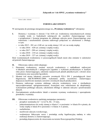 Załącznik nr 1 do SIWZ „wymiana wodomierzy” ..................................................... Nazwa i adres oferenta FORMULARZ OFERTY W nawiązaniu do przetargu nieograniczonego na „Wymianę wodomierzy” oferujemy: Dostawę i wymianę w okresie 5 lat 1636 szt. wodomierzy mieszkaniowych zimnej i ciepłej wody w budynkach należących do zasobów Zamawiającego wraz z urządzeniem i licencją programu do zdalnego odczytu przez Zamawiającego oraz wdrożenie i uruchomienie systemu radiowego połączone ze szkoleniem z obsługi, w tym: w roku 2015 - 281 szt. (140 szt. na wodę zimną i 141 szt. na wodę ciepłą), w roku 2016 – 620 szt. (zimnej i cieplej wody), w roku 2017 - 298 szt. (zimnej i cieplej wody), w roku 2018 – 210 szt. (zimnej i ciepłej wody), w roku 2019 – 227 szt. (zimnej i ciepłej wody). Ilość wymienianych wodomierzy w poszczególnych latach może ulec zmianie w zależności od potrzeb Zamawiającego. I. II. Oferowany zakres robót obejmuje: 1. Demontaż wodomierzy, montaż nowych wodomierzy z nakładkami radiowymi w lokalach mieszkalnych i usługowych (zgodnie z wykazem przekazanym w każdym roku przez Zamawiającego), założenie numerowych plomb plastikowych z dwóch stron wodomierza oraz uszczelek łączników. 2. Montaż (od strony lokatora) zaworów zwrotnych FILA DN 1 posiadających Atest Higieniczny HK/W/0890/01/2009, wykonanie próby szczelności. Zamawiający dopuszcza możliwość montażu zaworów zwrotnych innych producentow. 3. Dostawę radiowego systemu zdalnego odczytu wodomierzy wraz z niezbędnym oprzyrządowaniem, oprogramowaniem, licencjami oraz wdrożeniem do eksploatacji, wykonaniem próbnego odczytu, szkoleniem obsługi w zakresie odczytu i przetwarzania danych. 4. Zawiadomienie użytkowników lokali o terminie wymiany wodomierzy i sporządzenie protokołu z wymiany. III. Oferowane wodomierze spełniają następujące parametry: przepływ nominalny Q = 1,6 m3/h, Dn - 15 mm, jednostrumieniowe do wody zimnej w klasie C w poziomie i w klasie B w pionie, do wody ciepłej w klasie B w poziomie i w klasie A w pionie, suchobieżne, możliwość odczytu wzrokowego, wodomierze fabrycznie nowe i posiadają cechę legalizacyjną nadaną w roku realizacji dostawy u Zamawiającego, posiadają dopuszczenie do stosowania na terenie Rzeczypospolitej Polskiej. IV. V. Oferowana część radiowa spełnia następujące parametry: moduł radiowy montowany bezpośrednio na wodomierzu, alarm sygnalizujący zdjęcie nakładki, użycie magnesu, przepływ wsteczny, system jednokierunkowej komunikacji między nakładką a urządzeniem odczytującym, rejestracja próby rozłączenia modułu i wodomierza, historia pełnego rozbioru wody w m3 za 12 miesięcy, możliwość zabezpieczenia modułu radiowego przez plombę mechaniczną, nakładka z możliwością przeprogramowania w przypadku wymiany wodomierza, nakładka z możliwością zamontowania na wodomierz bez konieczności jego demontażu, system odczytowy posiadający dostęp do czytników z historią odczytów wodomierzy. Oferowana cena jednostkowa wymiany wodomierza i nakładki radiowej wynosi: na wodę zimną – wodomierz suchobieżny klasy B-H/A-V ……...... zł/szt. brutto, na wodę ciepłą – wodomierz suchobieżny klasy B-H/A-V ….......... zł/szt. brutto, nakładka radiowa …………zł/szt. brutto zawór zwrotny FILA DN 15 ..…......... zł/szt. brutto. Wartość wymiany wodomierzy na zimną i ciepłą wodę w 2015r. z nakładką radiową, wraz z montażem, oplombowaniem i zamontowaniem zaworów zwrotnych wynosi: cena netto ............... zł, podatek VAT ............. zł, cena brutto ................. zł, słownie: ..................................................................................................................... zł. Ceny jednostkowe dostawy i wymiany wodomierzy w latach 2016 – 2019 mogą ulec zmianie z uwzględnieniem wzrostu lub obniżki cen o średnioroczny wskaźnik cen towarów i usług konsumpcyjnych za rok poprzedni, ogłaszany przez Prezesa GUS. Oferowana cena jednostkowa urządzenia i licencji programu systemu do odczytu radiowego wraz z wdrożeniem oraz szkoleniem obsługi wynosi: VI. urządzenie do odczytu ………………..zł/szt. licencja programu ………………..zł/szt. wdrożenie systemu oraz szkolenie z obsługi……………zł/szt. Wartość urządzenia oraz licencji programu do zdalnego odczytu wraz z wdrożeniem i szkoleniem obsługi wynosi: cena netto ............... zł, podatek VAT ............. zł, cena brutto ................. zł, słownie: ........................................................................................................................... zł. Okresy gwarancji wynoszą: gwarancja i rękojmia na roboty…………………………….., gwarancja i rękojmia na wodomierze………………………., gwarancja i rękojmia na moduły radiowe (baterie)..……….., gwarancja na urządzenie wraz z programem odczytu………………………………………………..……, Termin realizacji zamówienia:...................................... VII. do zdalnego VIII. Postanowienia końcowe: 1. Oświadczamy, że zapoznaliśmy się ze specyfikacją istotnych warunków zamówienia oraz projektem umowy i nie mamy do nich zastrzeżeń oraz zdobyliśmy konieczne informacje do przygotowania oferty. 2. Oświadczamy, że zobowiązujemy się w przypadku wyboru naszej oferty do zawarcia umowy na warunkach określonych w specyfikacji oraz projekcie umowy. 3. Oświadczamy, że zobowiązujemy się do wpłaty ustalonej kwoty zabezpieczenia należytego wykonania zmówienia najpóźniej w dniu zawarcia umowy. 4. Oświadczamy, że nie podlegamy wykluczeniu z postępowania na podstawie art. 24 ust. 1 ppkt. 1, 2, 3 i 4 ustawy z dnia 29.01.2004r. Prawo zamówień publicznych (tekst jednolity: Dz. U. z 2004r. Nr 19, poz.177, z późniejszymi zmianami). 5. Oświadczamy, że żaden z pracowników ani właściciel firmy nie pozost