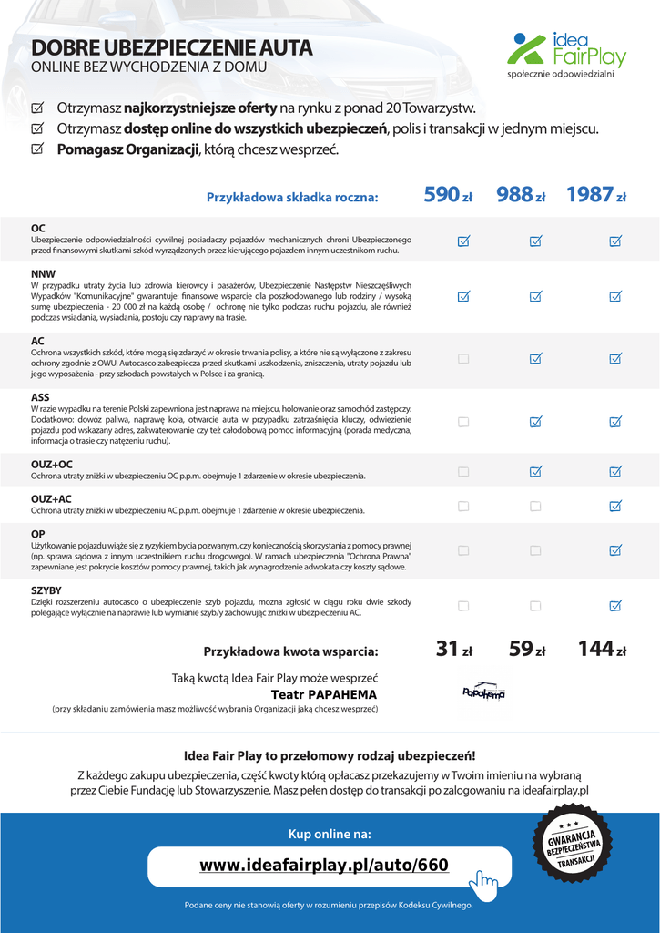 DOBRE UBEZPIECZENIE AUTA ONLINE BEZ WYCHODZENIA Z DOMU Otrzymasz najkorzystniejsze oferty na rynku z ponad 20 Towarzystw. Otrzymasz dostęp online do wszystkich ubezpieczeń, polis i transakcji w jednym miejscu. Pomagasz Organizacji, którą chcesz wesprzeć. Przykładowa składka roczna: 590 zł 988 zł 1987 zł OC Ubezpieczenie odpowiedzialności cywilnej posiadaczy pojazdów mechanicznych chroni Ubezpieczonego przed finansowymi skutkami szkód wyrządzonych przez kierującego pojazdem innym uczestnikom ruchu. NNW W przypadku utraty życia lub zdrowia kierowcy i pasażerów, Ubezpieczenie Następstw Nieszczęśliwych Wypadków "Komunikacyjne" gwarantuje: finansowe wsparcie dla poszkodowanego lub rodziny / wysoką sumę ubezpieczenia - 20 000 zł na każdą osobę / ochronę nie tylko podczas ruchu pojazdu, ale również podczas wsiadania, wysiadania, postoju czy naprawy na trasie. AC Ochrona wszystkich szkód, które mogą się zdarzyć w okresie trwania polisy, a które nie są wyłączone z zakresu ochrony zgodnie z OWU. Autocasco zabezpiecza przed skutkami uszkodzenia, zniszczenia, utraty pojazdu lub jego wyposażenia - przy szkodach powstałych w Polsce i za granicą. ASS W razie wypadku na terenie Polski zapewniona jest naprawa na miejscu, holowanie oraz samochód zastępczy. Dodatkowo: dowóz paliwa, naprawę koła, otwarcie auta w przypadku zatrzaśnięcia kluczy, odwiezienie pojazdu pod wskazany adres, zakwaterowanie czy też całodobową pomoc informacyjną (porada medyczna, informacja o trasie czy natężeniu ruchu). OUZ+OC Ochrona utraty zniżki w ubezpieczeniu OC p.p.m. obejmuje 1 zdarzenie w okresie ubezpieczenia. OUZ+AC Ochrona utraty zniżki w ubezpieczeniu AC p.p.m. obejmuje 1 zdarzenie w okresie ubezpieczenia. OP Użytkowanie pojazdu wiąże się z ryzykiem bycia pozwanym, czy koniecznością skorzystania z pomocy prawnej (np. sprawa sądowa z innym uczestnikiem ruchu drogowego). W ramach ubezpieczenia "Ochrona Prawna" zapewniane jest pokrycie kosztów pomocy prawnej, takich jak wynagrodzenie adwokata czy koszty sądowe. SZYBY Dzięki rozszerzeniu autocasco o ubezpieczenie szyb pojazdu, mozna zgłosić w ciągu roku dwie szkody polegające wyłącznie na naprawie lub wymianie szyb/y zachowując zniżki w ubezpieczeniu AC. Przykładowa kwota wsparcia: 31 zł 59 zł 144 zł Taką kwotą Idea Fair Play może wesprzeć Teatr PAPAHEMA (przy składaniu zamówienia masz możliwość wybrania Organizacji jaką chcesz wesprzeć) Idea Fair Play to przełomowy rodzaj ubezpieczeń! Z każdego zakupu ubezpieczenia, część kwoty którą opłacasz przekazujemy w Twoim imieniu na wybraną przez Ciebie Fundację lub Stowarzyszenie. Masz pełen dostęp do transakcji po zalogowaniu na ideafairplay.pl Kup online na: www.ideafairplay.pl/auto/660 Podane ceny nie stanowią oferty w rozumieniu przepisów Kodeksu Cywilnego.