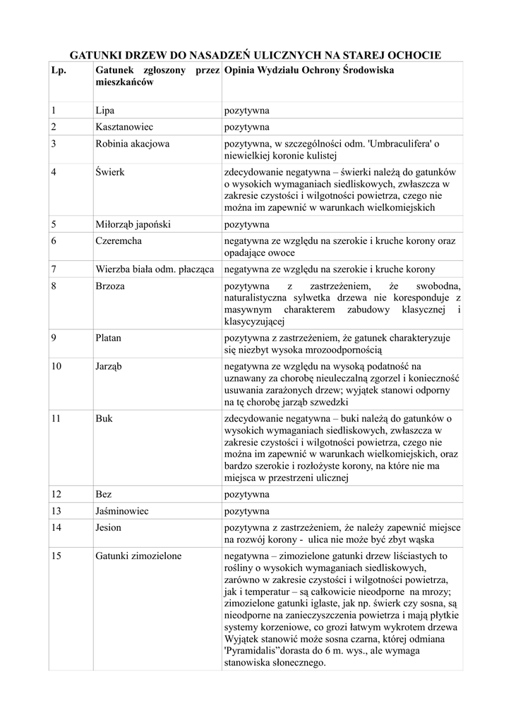 GATUNKI DRZEW DO NASADZEŃ ULICZNYCH NA STAREJ OCHOCIE Lp. Gatunek zgłoszony przez Opinia Wydziału Ochrony Środowiska mieszkańców 1 Lipa pozytywna 2 Kasztanowiec pozytywna 3 Robinia akacjowa pozytywna, w szczególności odm. 'Umbraculifera' o niewielkiej koronie kulistej 4 Świerk zdecydowanie negatywna – świerki należą do gatunków o wysokich wymaganiach siedliskowych, zwłaszcza w zakresie czystości i wilgotności powietrza, czego nie można im zapewnić w warunkach wielkomiejskich 5 Miłorząb japoński pozytywna 6 Czeremcha negatywna ze względu na szerokie i kruche korony oraz opadające owoce 7 Wierzba biała odm. płacząca negatywna ze względu na szerokie i kruche korony 8 Brzoza pozytywna z zastrzeżeniem, że swobodna, naturalistyczna sylwetka drzewa nie koresponduje z masywnym charakterem zabudowy klasycznej i klasycyzującej 9 Platan pozytywna z zastrzeżeniem, że gatunek charakteryzuje się niezbyt wysoka mrozoodpornością 10 Jarząb negatywna ze względu na wysoką podatność na uznawany za chorobę nieuleczalną zgorzel i konieczność usuwania zarażonych drzew; wyjątek stanowi odporny na tę chorobę jarząb szwedzki 11 Buk zdecydowanie negatywna – buki należą do gatunków o wysokich wymaganiach siedliskowych, zwłaszcza w zakresie czystości i wilgotności powietrza, czego nie można im zapewnić w warunkach wielkomiejskich, oraz bardzo szerokie i rozłożyste korony, na które nie ma miejsca w przestrzeni ulicznej 12 Bez pozytywna 13 Jaśminowiec pozytywna 14 Jesion pozytywna z zastrzeżeniem, że należy zapewnić miejsce na rozwój korony - ulica nie może być zbyt wąska 15 Gatunki zimozielone negatywna – zimozielone gatunki drzew liściastych to rośliny o wysokich wymaganiach siedliskowych, zarówno w zakresie czystości i wilgotności powietrza, jak i temperatur – są całkowicie nieodporne na mrozy; zimozielone gatunki iglaste, jak np. świerk czy sosna, są nieodporne na zanieczyszczenia powietrza i mają płytkie systemy korzeniowe, co grozi łatwym wykrotem drzewa Wyjątek stanowić może sosna czarna, której odmiana 'Pyramidalis”dorasta do 6 m. wys., ale wymaga stanowiska słonecznego.