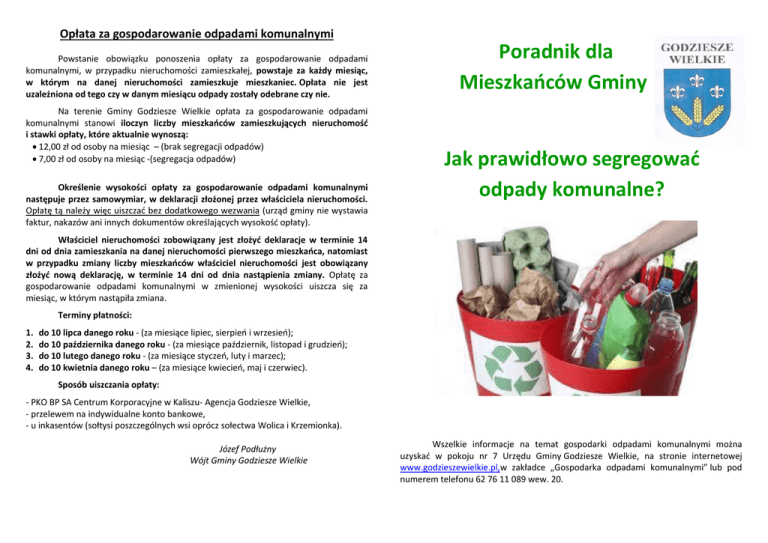 Opłata za gospodarowanie odpadami komunalnymi Powstanie obowiązku ponoszenia opłaty za gospodarowanie odpadami komunalnymi, w przypadku nieruchomości zamieszkałej, powstaje za każdy miesiąc, w którym na danej nieruchomości zamieszkuje mieszkaniec. Opłata nie jest uzależniona od tego czy w danym miesiącu odpady zostały odebrane czy nie. Na terenie Gminy Godziesze Wielkie opłata za gospodarowanie odpadami komunalnymi stanowi iloczyn liczby mieszkańców zamieszkujących nieruchomość i stawki opłaty, które aktualnie wynoszą: 12,00 zł od osoby na miesiąc – (brak segregacji odpadów) 7,00 zł od osoby na miesiąc -(segregacja odpadów) Określenie wysokości opłaty za gospodarowanie odpadami komunalnymi następuje przez samowymiar, w deklaracji złożonej przez właściciela nieruchomości. Opłatę tą należy więc uiszczać bez dodatkowego wezwania (urząd gminy nie wystawia faktur, nakazów ani innych dokumentów określających wysokość opłaty). Poradnik dla Mieszkańców Gminy Jak prawidłowo segregować odpady komunalne? Właściciel nieruchomości zobowiązany jest złożyć deklaracje w terminie 14 dni od dnia zamieszkania na danej nieruchomości pierwszego mieszkańca, natomiast w przypadku zmiany liczby mieszkańców właściciel nieruchomości jest obowiązany złożyć nową deklarację, w terminie 14 dni od dnia nastąpienia zmiany. Opłatę za gospodarowanie odpadami komunalnymi w zmienionej wysokości uiszcza się za miesiąc, w którym nastąpiła zmiana. Terminy płatności: 1. 2. 3. 4. do 10 lipca danego roku - (za miesiące lipiec, sierpień i wrzesień); do 10 października danego roku - (za miesiące październik, listopad i grudzień); do 10 lutego danego roku - (za miesiące styczeń, luty i marzec); do 10 kwietnia danego roku – (za miesiące kwiecień, maj i czerwiec). Sposób uiszczania opłaty: - PKO BP SA Centrum Korporacyjne w Kaliszu- Agencja Godziesze Wielkie, - przelewem na indywidualne konto bankowe, - u inkasentów (sołtysi poszczególnych wsi oprócz sołectwa Wolica i Krzemionka). Józef Podłużny Wójt Gminy Godziesze Wielkie Wszelkie informacje na temat gospodarki odpadami komunalnymi można uzyskać w pokoju nr 7 Urzędu Gminy Godziesze Wielkie, na stronie internetowej www.godzieszewielkie.pl,w zakładce „Gospodarka odpadami komunalnymi” lub pod numerem telefonu 62 76 11 089 wew. 20. ODPADY SUCHE (żółty worek) TAK: papier i tektura np. opakowania z papieru i tektury, gazety, książki, zeszyty, czasopisma, worki, kartony i tektura, torebki papierowe, papier pakowy, katalogi, prospekty i foldery, papier szkolny i biurowy itp.; tworzywa sztuczne np. zgniecione butelki po napojach, nakrętki z butelek, opakowania po żywności (jogurtach, serkach), opakowania po środkach czystości, opakowania ze styropianu, plastikowe torebki, reklamówki, kartoniki po mleku i napojach itp.; metale np. puszki po napojach i konserwach, kapsle i inne drobne elementy metalowe itp.; NIE: papier powlekany folią i kalką, tłusty i zabrudzony, pieluchy i inne artykuły higieniczne, worki po nawozach, cemencie i innych materiałach budowlanych, tapety, opakowania z zawartością, butelki po olejach spożywczych i samochodowych, puszki po farbach, baterie, opakowania po aerozolach, opakowania po środkach chwastobójczych i owadobójczych, zabawki, sprzęt elektryczny i elektroniczny, lekarstwa, strzykawki i materiały medyczne itp. SZKŁO OPAKOWANIOWE (zielony worek) TAK: szklane opakowania np. butelki i słoiki po napojach i żywności, butelki po napojach alkoholowych, szklane opakowania po kosmetykach i inne opakowania szklane; NIE: termometry, żarówki i świetlówki, reflektory, szkło stołowe, zbrojone i żaroodporne, ekrany i lampy telewizyjne, lustra, szyby samochodowe i okienne, porcelana, ceramika i doniczki, znicze z zawartością wosku, nieopróżnione opakowania po lekach, olejach itp. BIOODPADY I ODPADY ZIELONE (brązowy worek) ODPADY ZMIESZANE (POJEMNIK) TAK: wrzucamy wszystko to, czego nie możemy wrzucić do żółtego, zielonego i brązowego worka ani do kompostownika, czego nie musimy oddać do punktu selektywnej zbiórki np. worki z odkurzaczy, sznurki i wstążki, artykuły higieniczne (np. waciki, patyczki, pieluchy), lustra, szkło zbrojone, ceramika, niedopałki papierosów, zmiotki (śmieci), zimny popiół, odpady kuchenne np. kości, resztki mięsa i ryb itp. NIE: odpady niebezpieczne, leki, farby, oleje silnikowe i ich opakowania, opakowania po środkach ochrony roślin, zużyty sprzęt elektroniczny, sprzęt AGD i RTV, trawa i inne odpady ulegające biodegradacji. ODPADY PROBLEMATYCZNE (PSZOK) (jeżeli jest to możliwe należy je gromadzić w workach) Odpady niebezpieczne: baterie, akumulatory, świetlówki, resztki farb, lakierów, rozpuszczalników, środków do impregnacji drewna, środków ochrony roślin i nawozów, pojemniki po aerozolach, olejach mineralnych i syntetycznych, tłuszczach, benzynie, środkach chemicznych, środkach ochrony roślin, przeterminowane leki, skażone opatrunki, strzykawki, stare kosmetyki, tusze do drukarek i tonery, taśmy video, kasety magnetofonowe, materiały fotograficzne, taśmy barwiące itp. Zużyty sprzęt elektryczny i elektroniczny: np. nieużywane lub zepsute pralki, lodówki, telewizory, sprzęt audio, żelazka, telefony, komputery itp. Odpady wielkogabarytowe: meble, rowery, stare szafy, tapczany, fotele, krzesła, dywany, wózki dziecięce, materace itp. TAK: części roślin z ogrodu np. liście, trawa, kwiaty i pozostałości roślin, przycięte części Odpady budowlane i remontowe- odpady z budowy i remontów prowadzonych we własnym zakresie, np. gruz betonowy, gruz ceglany, materiały i elementy ceramiczne, usunięte tynki, tapety, okleiny itp. (odbiór do 100 kg jednorazowo z nieruchomości) drzew i krzewów, trociny i kora drzew, owoce i warzywa itp. Zużyte opony samochodowe itp. (o ile nie zobowiązaliśmy się do kompostowania na nieruchomości) Segre