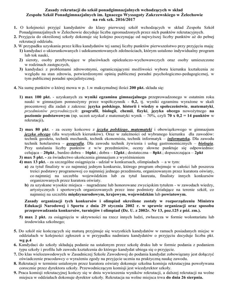 Zasady rekrutacji do szkół ponadgimnazjalnych wchodzących w skład Zespołu Szkół Ponadgimnazjalnych im. Ignacego Wyssogoty Zakrzewskiego w Żelechowie na rok szk. 2016/2017 1. O kolejności przyjęć kandydatów do klasy pierwszej szkół wchodzących w skład Zespołu Szkół Ponadgimnazjalnych w Żelechowie decyduje liczba zgromadzonych przez nich punktów rekrutacyjnych. 2. Przyjęcia do określonej szkoły dokonuje się kolejno poczynając od najwyższej liczby punktów aż do pełnej rekrutacji oddziału. 3. W przypadku uzyskania przez kilku kandydatów tej samej liczby punktów pierwszeństwo przy przyjęciu mają: 1) kandydaci o ukierunkowanych i udokumentowanych zdolnościach, którym ustalono indywidualny program lub tok nauki, 2) sieroty, osoby przebywające w placówkach opiekuńczo-wychowawczych oraz osoby umieszczone w rodzinach zastępczych, 3) kandydaci z problemami zdrowotnymi, ograniczającymi możliwości wyboru kierunku kształcenia ze względu na stan zdrowia, potwierdzonymi opinią publicznej poradni psychologiczno-pedagogicznej, w tym publicznej poradni specjalistycznej. 4. Na sumę punktów o której mowa w p. 1.w maksymalnej ilości 200 pkt. składa się: 1) max 100 pkt. - uzyskanych za wyniki egzaminu gimnazjalnego przeprowadzonego w ostatnim roku nauki w gimnazjum pomnożymy przez współczynnik - 0,2, tj. wyniki egzaminu wyrażone w skali procentowej dla zadań z zakresu: języka polskiego, historii i wiedzy o społeczeństwie, matematyki, przedmiotów przyrodniczych: geografii, biologii, chemii, fizyki, języka obcego nowożytnego na poziomie podstawowym (np. uczeń uzyskał z matematyki wynik – 70%, czyli 70 x 0,2 = 14 punktów w rekrutacji). 2) max 80 pkt. - za oceny końcowe z języka polskiego, matematyki i obowiązkowego w gimnazjum języka obcego (dla wszystkich kierunków). Oraz w zależności od wybranego kierunku dla zawodów: technik geodeta, technik mechanik, technik ekonomista, technik informatyk – informatyka. Dla zawodu technik hotelarstwa – geografia. Dla zawodu technik żywienia i usług gastronomicznych – biologia. Przy ustalaniu liczby punktów z w/w przedmiotów, oceny słowne punktuje się odpowiednio: celująca – 20pkt., bardzo dobra – 16pkt.; dobra – 12pkt.; dostateczna – 8pkt.; dopuszczająca – 2pkt 3) max 5 pkt. - za świadectwo ukończenia gimnazjum z wyróżnieniem 4) max 13 pkt. - za szczególne osiągnięcia - udział w konkursach, olimpiadach – a w tym: a) za tytuł finalisty w co najmniej jednym konkursie, którego program obejmuje w całości lub poszerza treści podstawy programowej co najmniej jednego przedmiotu, organizowanym przez kuratora oświaty, co najmniej na szczeblu wojewódzkim lub za tytuł laureata, finalisty innych konkursów organizowanych przez kuratora oświaty. b) za uzyskane wysokie miejsca – nagradzane lub honorowane zwycięskim tytułem - w zawodach wiedzy, artystycznych i sportowych organizowanych przez inne podmioty działające na terenie szkół, co najmniej na szczeblu międzynarodowym, krajowym, wojewódzkim lub powiatowym. Zasady organizacji tych konkursów i olimpiad określone zostały w rozporządzeniu Ministra Edukacji Narodowej i Sportu z dnia 29 stycznia 2002 r. w sprawie organizacji oraz sposobu przeprowadzania konkursów, turniejów i olimpiad (Dz. U. z 2002r. Nr 13, poz.125 z póź. zm.). 5) max 2 pkt. za osiągnięcia w aktywności na rzecz innych ludzi, zwłaszcza w formie wolontariatu lub środowiska szkolnego; 5. Do szkół nie kończących się maturą przyjmuje się wszystkich kandydatów w ramach posiadanych miejsc w oddziałach w kolejności zgłoszeń a w przypadku nadmiaru kandydatów o przyjęciu decyduje liczba pkt. wg p.4 6. Kandydaci do szkoły składają podanie na ustalonym przez szkołę druku lub w formie podania z podaniem typu szkoły i profilu lub zawodu kształcenia do którego kandydat ubiega się o przyjęcie. 7. Do klas wielozawodowych w Zasadniczej Szkole Zawodowej do podania kandydat zobowiązany jest dołączyć oświadczenie pracodawcy o wyrażeniu zgody na przyjęcie ucznia na praktyczną naukę zawodu. 8. Rekrutacji w terminie ustalonym przez kuratora oświaty dokonuje szkolna komisja rekrutacyjna powoływana corocznie przez dyrektora szkoły. Przewodniczącym komisji jest wicedyrektor szkoły. 9. Praca komisji rekrutacyjnej kończy się w dniu wywieszenia wyników rekrutacji, a dalszej rekrutacji na wolne miejsca w oddziałach dokonuje dyrektor szkoły. Rekrutacja na wolne miejsca trwa do dnia 26 sierpnia.