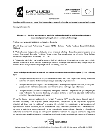 Katarzyna Koszewska Ekspertyza : Analiza porównawcza wyników badan w kontekście możliwości współpracy organizacji pozarządowych, szkół i samorządu lokalnego Analizie porównawczej poddano następujące badania: 1.Youth Empowerment Partnership Program (YEPP) - Bielany - Polska Fundacja Dzieci i Młodzieży, 2011 rok 2. "Picie alkoholu i używanie narkotyków przez młodzież szkolną' - badanie przeprowadzone przez Instytut Psychologii Zdrowia Polskiego Towarzystwa Psychologicznego na zlecenie Biura Polityki Społecznej Urzędu m.st. Warszawy , 2011 rok 3. "Używanie alkoholu i narkotyków przez młodzież szkolną w Warszawie w ocenie nauczycieli badanie wykonanie przez Instytut Psychologii Zdrowia Polskiego towarzystwa Psychologicznego na zlecenie Biura Polityki Społecznej Urzędu m.st. Warszawy, 2011 rok Celem badań prowadzonych w ramach Youth Empowerment Partnership Program (YEPP) - Bielany było: 1. Zdiagnozowanie sposobów w jaki młodzież w wieku 13-18 lat spędza czas wolny na terenie dzielnicy Warszawa-Bielany oraz jakie są jej potrzeby w tym zakresie. 2. Zdiagnozowanie postrzegania sposobu spędzania wolnego czasu przez rodziców, nauczycieli i pracowników NGO oraz sposobów pozyskiwania przez nich tego typu informacji 3. Zdiagnozowanie poziomu współpracy pomiędzy szkołami i organizacjami pozarządowymi oraz rodzicami na terenie dzielnicy Warszawa-Bielany w zakresie edukacji nieformalnej młodzieży (spędzanie czasu wolnego). W wyniku badań przeprowadzonych w ramach Programu YEPP okazało się, że badani: dzieci i młodzież najwięcej czasu spędzają przed komputerem, spotykaniu się ze znajomymi, oglądaniu telewizji lub tzw. „nic nie robieniu” , znaczny ich odsetek nie uczestniczy w zorganizowanych wydarzeniach, mimo, że znana jest im oferta takich zajęć. Niewielki procent dzieci i młodzieży zna i korzysta z zajęciach proponowanych przez organizacje pozarządowe. Zajęcia o charakterze kulturalno-oświatowym cieszą się mniejszym zainteresowaniem niż zajęcia sportowe (regularne uprawianie sportu deklaruje ponad połowa badanych- najczęściej uczniowie gimnazjum). Oferta poza Bielanami wydaje się być atrakcyjniejsza. Badana młodzież wskazała zajęcia , w których chciałaby uczestniczyć: sport i zajęcia o charakterze artystycznym, taniec, fotografia. Badani zwracają uwagę na to, że zajęcia takie powinny być prowadzone w sposób dla nich atrakcyjny. Bardzo interesujące jest to, że uczniowie szkół zawodowych wskazali wolontariat jako atrakcyjną formę spędzania czasu wolnego, wśród gimnazjalistów powodzeniem cieszą się koła zainteresowań, a wśród uczniów LO zajęcia uzupełniające (prawdopodobnie przygotowanie do matury). Natomiast niepokoi fakt, że badana młodzież nie ma wzorców rodzicielskich związanych z prozdrowotnym trybem życia , rodzice mają niewielki wpływ na wybór sposobu spędzania czasu wolnego przez dzieci i młodzież, a co za tym idzie - mało skutecznie współpracują ze szkołą w tym zakresie. Wyniki badań wskazują na to, że szkoła jest mało atrakcyjnym miejscem rozwoju dzieci i młodzieży, znikomy procent badanych uczniów korzysta z oferty szkoły ( nie oznacza to, że oferta taka nie istnieje, ona jest, ale jest nieatrakcyjna dla uczniów), wielu uczniów nie ma pomysłu na swój rozwój, nie zdefiniowało swoich życiowych celów i nie wie, czym się tak naprawdę interesuje. Nauczyciele koncentrują się głównie na realizacji materiału programowego, proponują rozwiązania standardowe, a to, co wpływa na aktywność szkoły w czasie wolnym to indywidualna motywacja poszczególnych nauczycieli i ich determinacja. Nie są znane obszary współpracy między instytucjami a organizacjami pozarządowymi, brakuje sprawnego systemu wymiany informacji. Podsumowując to, co wynika z badań YEPP Bielany, należy stwierdzić, że: istnieje "duży do zagospodarowania potencjał rynku czasu wolnego", gimnazjalistów, szczególnie wśród warto zainwestować w ofertę adresowaną wspólnie do rodziców i uczniów, zaczynając od młodszego wieku szkolnego, oprócz rozwoju zainteresowań, co jest naturalnie korzystne dla rozwoju dzieci i młodzieży, należy opracować ofertę związaną z ogólnym rozwojem osobowości, definiowaniem celów życiowych, coachingiem kompetencyjnym (doprecyzowanie zainteresowań), w procesie konstruowania oferty należy badać potrzeby i zainteresowania, co wpłynie na jej atrakcyjność i użyteczność, docierając do adresatów należy wykorzystywać ich naturalne środowisko komunikacji, a przede wszystkim portale społecznościowe, warto stworzyć system współpracy instytucji i organizacji działających na rzecz dzieci i młodzieży w obszarze efektywnego zagospodarowania ich czasu wolego, a co za tym idzie optymalnego wykorzystania zasobów ludzkich i finansowych. "Picie alkoholu i używanie narkotyków przez młodzież szkolną" - badanie przeprowadzone przez Instytut Psychologii Zdrowia Polskiego Towarzystwa Psychologicznego na zlecenie Biura Polityki Społecznej Urzędu m.st. Warszawy to kolejne badanie ESPAD na terenie miasta Warszawy przeprowadzone w październiku 2011roku. W badaniu uczestniczyła młodzież szkolna z podobnych grup wiekowych, jak w badaniu przeprowadzonym przez Polską Fundację Dzieci i Młodzieży (trzecich klas szkół gimnazjalnych oraz drugich klas szkół ponadgimnazjalnych). W badaniu tym pytano młodzież o ich osobiste doświadczenia związane z używaniem substancji psychoaktywnych, jak i o ich opinię na temat powszechności używania alkoholu i narkotyków wśród ich rówieśników. Podstawowym celem badań była diagnoza powszechności zjawiska używania substancji psychoaktywnych przez młodzież. Ważnym celem było również poznanie postaw młodzieży wobec sięgania po różne substancje psychoaktywne, jej wiedzy na temat skutków używania substancji oraz oceny poziomu ryzyka. Informacje te są ważne prz