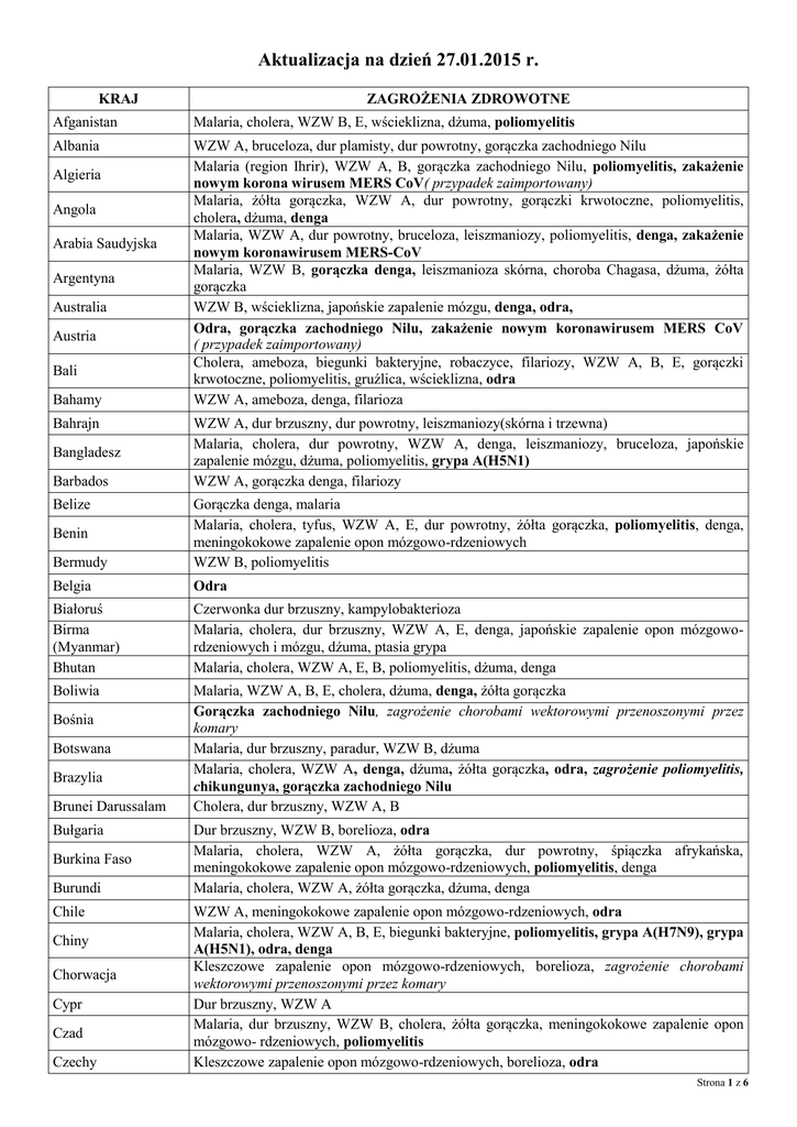 Aktualizacja na dzień 27.01.2015 r. ZAGROŻENIA ZDROWOTNE KRAJ Afganistan Malaria, cholera, WZW B, E, wścieklizna, dżuma, poliomyelitis Albania WZW A, bruceloza, dur plamisty, dur powrotny, gorączka zachodniego Nilu Malaria (region Ihrir), WZW A, B, gorączka zachodniego Nilu, poliomyelitis, zakażenie nowym korona wirusem MERS CoV( przypadek zaimportowany) Malaria, żółta gorączka, WZW A, dur powrotny, gorączki krwotoczne, poliomyelitis, cholera, dżuma, denga Malaria, WZW A, dur powrotny, bruceloza, leiszmaniozy, poliomyelitis, denga, zakażenie nowym koronawirusem MERS-CoV Malaria, WZW B, gorączka denga, leiszmanioza skórna, choroba Chagasa, dżuma, żółta gorączka WZW B, wścieklizna, japońskie zapalenie mózgu, denga, odra, Odra, gorączka zachodniego Nilu, zakażenie nowym koronawirusem MERS CoV ( przypadek zaimportowany) Cholera, ameboza, biegunki bakteryjne, robaczyce, filariozy, WZW A, B, E, gorączki krwotoczne, poliomyelitis, gruźlica, wścieklizna, odra WZW A, ameboza, denga, filarioza Algieria Angola Arabia Saudyjska Argentyna Australia Austria Bali Bahamy Bahrajn Bangladesz Barbados WZW A, dur brzuszny, dur powrotny, leiszmaniozy(skórna i trzewna) Malaria, cholera, dur powrotny, WZW A, denga, leiszmaniozy, bruceloza, japońskie zapalenie mózgu, dżuma, poliomyelitis, grypa A(H5N1) WZW A, gorączka denga, filariozy Bermudy Gorączka denga, malaria Malaria, cholera, tyfus, WZW A, E, dur powrotny, żółta gorączka, poliomyelitis, denga, meningokokowe zapalenie opon mózgowo-rdzeniowych WZW B, poliomyelitis Belgia Odra Białoruś Birma (Myanmar) Bhutan Czerwonka dur brzuszny, kampylobakterioza Malaria, cholera, dur brzuszny, WZW A, E, denga, japońskie zapalenie opon mózgowordzeniowych i mózgu, dżuma, ptasia grypa Malaria, cholera, WZW A, E, B, poliomyelitis, dżuma, denga Boliwia Malaria, WZW A, B, E, cholera, dżuma, denga, żółta gorączka Gorączka zachodniego Nilu, zagrożenie chorobami wektorowymi przenoszonymi przez komary Malaria, dur brzuszny, paradur, WZW B, dżuma Malaria, cholera, WZW A, denga, dżuma, żółta gorączka, odra, zagrożenie poliomyelitis, chikungunya, gorączka zachodniego Nilu Cholera, dur brzuszny, WZW A, B Belize Benin Bośnia Botswana Brazylia Brunei Darussalam Bułgaria Burkina Faso Burundi Chile Chiny Chorwacja Cypr Czad Czechy Dur brzuszny, WZW B, borelioza, odra Malaria, cholera, WZW A, żółta gorączka, dur powrotny, śpiączka afrykańska, meningokokowe zapalenie opon mózgowo-rdzeniowych, poliomyelitis, denga Malaria, cholera, WZW A, żółta gorączka, dżuma, denga WZW A, meningokokowe zapalenie opon mózgowo-rdzeniowych, odra Malaria, cholera, WZW A, B, E, biegunki bakteryjne, poliomyelitis, grypa A(H7N9), grypa A(H5N1), odra, denga Kleszczowe zapalenie opon mózgowo-rdzeniowych, borelioza, zagrożenie chorobami wektorowymi przenoszonymi przez komary Dur brzuszny, WZW A Malaria, dur brzuszny, WZW B, cholera, żółta gorączka, meningokokowe zapalenie opon mózgowo- rdzeniowych, poliomyelitis Kleszczowe zapalenie opon mózgowo-rdzeniowych, borelioza, odra Strona 1 z 6 Dania Demokratyczna Republika Konga Dominikana WZW A, odra Malaria, cholera, WZW A, E, B, żółta gorączka, gorączki krwotoczne, dżuma, meningokokowe zapalenie opon mózgowo- rdzeniowych, poliomyelitis, odra Malaria, WZW B, denga, leptospiroza, cholera, chikungunya Dżibuti Malaria, WZW A, B, dury, gorączki krwotoczne, poliomyelitis, denga, Egipt Malaria, dur brzuszny, cholera, dur powrotny, poliomyelitis, WZW A, grypa A(H5N1) Ekwador Malaria, cholera, WZW A, żółta gorączka, dżuma, denga, odra, chikungunya Erytrea Malaria, cholera, WZW A, E, żółta gorączka, denga Estonia WZW A, kleszczowe zapalenie opon mózgowo-rdzeniowych, borelioza Malaria, WZW A, E, dury, gorączki krwotoczne, poliomyelitis, żółta gorączka, denga, cholera, odra WZW A, E, denga, dur brzuszny, denga Malaria, cholera, WZW A, E, gorączki krwotoczne, denga, japońskie zapalenie mózgu, meningokokowe zapalenie opon mózgowo- rdzeniowych, odra, zakażenie nowym korona wirusem MERS – CoV( przypadek zaimportowany) Borelioza, kleszczowe zapalenie opon mózgowo-rdzeniowych, odra, WZW A Odra, zakażenie nowym koronawirusem MERS-CoV( przypadek zaimportowany), denga, chikungunya Malaria, WZW A, E, B, gorączki krwotoczne, denga, dur powrotny, poliomyelitis, śpiączka afrykańska, cholera, żółta gorączka Malaria, cholera, WZW A, E, gorączki krwotoczne, denga, dur powrotny, poliomyelitis, żółta gorączka, meningokokowe zapalenie opon mózgowo-rdzeniowych Malaria, cholera, WZW A, E, B gorączki krwotoczne, denga, żółta gorączka, meningokokowe zapalenie opon mózgowo-rdzeniowych, poliomyelitis Kleszczowe zapalenie opon mózgowo-rdzeniowych, malaria, zakażenie nowym koronawirusem MERS – CoV( przypadek zaimportowany), gorączka zachodniego Nilu Biegunka podróżnych, ogniska cholery, robaczyce, WZW B, odra Etiopia Fidżi Filipiny Finlandia Francja Gabon Gambia Ghana Grecja Gruzja Gujana Gujana Francuska Gwadelupa Malaria, cholera, WZW A, E, B, gorączki krwotoczne, denga, chikungunya Malaria, cholera, gorączki krwotoczne, WZW A, B, wścieklizna, denga, żółta gorączka, chikungunya WZW A, B, tężec, błonica, dur brzuszny, denga, chikungunya Holandia Malaria, cholera, WZW A, B, E, gorączki krwotoczne, poliomyelitis, denga, chikungunya Malaria, WZW A, B, E, żółta gorączka, denga, gorączki krwotoczne, poliomyelitis, cholera, meningokokowe zapalenie opon mózgowo- rdzeniowych, gorączka krwotoczna Ebola Malaria, WZW A, B, E, gorączki krwotoczne, gorączka denga, tularemia, cholera, chikugunya Odra Gorączka zachodniego Nilu, zagrożenie chorobami wektorowymi przenoszonymi przez komary Odra, zakażenie nowym koronawirusem MERS- CoV( przypadek zaimportowany) Honduras Malaria, WZW A, B, E, gorączki krwotoczne, denga, wścieklizna Hongkong Malaria, cholera, WZW A, E, grypa A(H7N9) Malaria, cholera, WZW A, E, gorączki krwotoczne, denga, japońskie zapalen