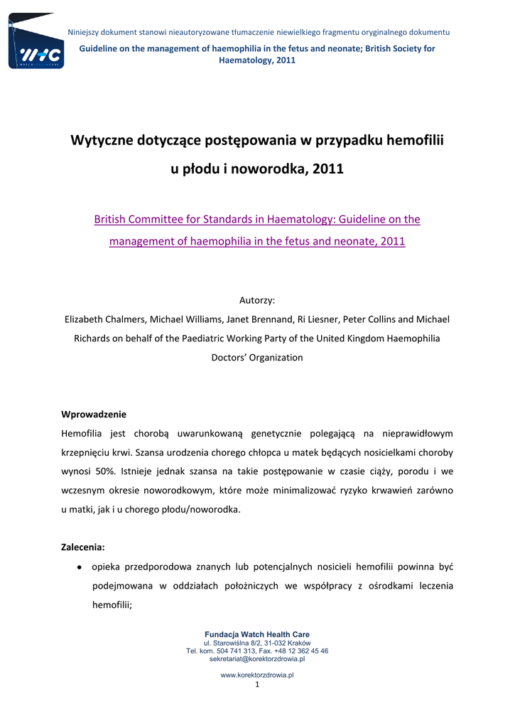 Niniejszy dokument stanowi nieautoryzowane tłumaczenie niewielkiego fragmentu oryginalnego dokumentu Guideline on the management of haemophilia in the fetus and neonate; British Society for Haematology, 2011 Wytyczne dotyczące postępowania w przypadku hemofilii u płodu i noworodka, 2011 British Committee for Standards in Haematology: Guideline on the management of haemophilia in the fetus and neonate, 2011 Autorzy: Elizabeth Chalmers, Michael Williams, Janet Brennand, Ri Liesner, Peter Collins and Michael Richards on behalf of the Paediatric Working Party of the United Kingdom Haemophilia Doctors’ Organization Wprowadzenie Hemofilia jest chorobą uwarunkowaną genetycznie polegającą na nieprawidłowym krzepnięciu krwi. Szansa urodzenia chorego chłopca u matek będących nosicielkami choroby wynosi 50%. Istnieje jednak szansa na takie postępowanie w czasie ciąży, porodu i we wczesnym okresie noworodkowym, które może minimalizować ryzyko krwawień zarówno u matki, jak i u chorego płodu/noworodka. Zalecenia: opieka przedporodowa znanych lub potencjalnych nosicieli hemofilii powinna być podejmowana w oddziałach położniczych we współpracy z ośrodkami leczenia hemofilii; Fundacja Watch Health Care ul. Starowiślna 8/2, 31-032 Kraków Tel. kom. 504 741 313, Fax. +48 12 362 45 46 [email protected] www.korektorzdrowia.pl 1 Niniejszy dokument stanowi nieautoryzowane tłumaczenie niewielkiego fragmentu oryginalnego dokumentu Guideline on the management of haemophilia in the fetus and neonate; British Society for Haematology, 2011 określanie płci dziecka powinno odbywać się zarówno poprzez pobranie próbki krwi matki w ok. 10 tygodniu ciąży jak i za pomocą badania ultrasonograficznego płodu między 18, a 20 tygodniem ciąży; przy podejmowaniu decyzji o sposobie porodu należy uwzględnić czynniki hemostatyczne (nosicielstwo hemofilii nie jest przeciwwskazaniem do porodu drogą naturalną); w związku ze zwiększonym ryzykiem krwawienia należy unikać porodu kleszczowego polegającego na szybkim wydobyciu główki dziecka za pomocą kleszczy, które kształtem dopasowane są do główki dziecka oraz krzywizn kanału rodnego; należy unikać inwazyjnych procedur polegających na umieszczaniu elektrod na głowie dziecka w trakcie porodu czy pobieraniu próbek płodu; rozpoznanie hemofilii powinno być ustalane na podstawie badania krwi pępowinowej pobranej natychmiast po porodzie; domięśniowe podanie witaminy K powinno być wstrzymane do czasu wykluczenia hemofilii; w sytuacji opóźnienia rozpoznania choroby lub potwierdzenia hemofilii należy podać doustnie witaminę K; nie należy stosować desmopresyny1 w leczeniu hemofili u noworodków; nakłucia pięty oraz inne nakłucia żył u noworodków powinny być przeprowadzane z zachowaniem ostrożności przez doświadczonych pracowników; 1 desmopresyna- organiczny związek chemiczny, syntetyczny analog wazopresyny, naturalnego hormonu podwzgórzowego, który w porównaniu z wazopresyną ma silniejsze działanie antydiuretyczne. Wpływa zwiększa stężenie krążącego czynnika VIII wpływający tym samym na homeostazę, zwiększając aktywność tkankowego aktywatora plazminogenu w osoczu i nasilając fibrynolizę. Fundacja Watch Health Care ul. Starowiślna 8/2, 31-032 Kraków Tel. kom. 504 741 313, Fax. +48 12 362 45 46 [email protected] www.korektorzdrowia.pl 2 Niniejszy dokument stanowi nieautoryzowane tłumaczenie niewielkiego fragmentu oryginalnego dokumentu Guideline on the management of haemophilia in the fetus and neonate; British Society for Haematology, 2011 w przypadku podejrzenia krwawienia śródczaszkowego lub innego krwawienia, należy natychmiast podać koncentrat czynnika krzepnięcia; należy wykonać badanie ultrasonograficzne czaszki u wszystkich noworodków z hemofilią ciężką lub umiarkowaną; ze względu na niską czułość badania ultrasonograficznego w wykrywaniu krwawienia podtwardówkowego, zaleca się wykonanie rezonansu magnetycznego czaszki lub tomografię komputerową czaszki u noworodków z objawami hemofilii nawet jeśli wynik badania USG jest prawidłowy; rodzice chorego noworodka powinni być poinformowani o ryzyku krwawień przed opuszczeniem szpitala. Fundacja Watch Health Care ul. Starowiślna 8/2, 31-032 Kraków Tel. kom. 504 741 313, Fax. +48 12 362 45 46 [email protected] www.korektorzdrowia.pl 3