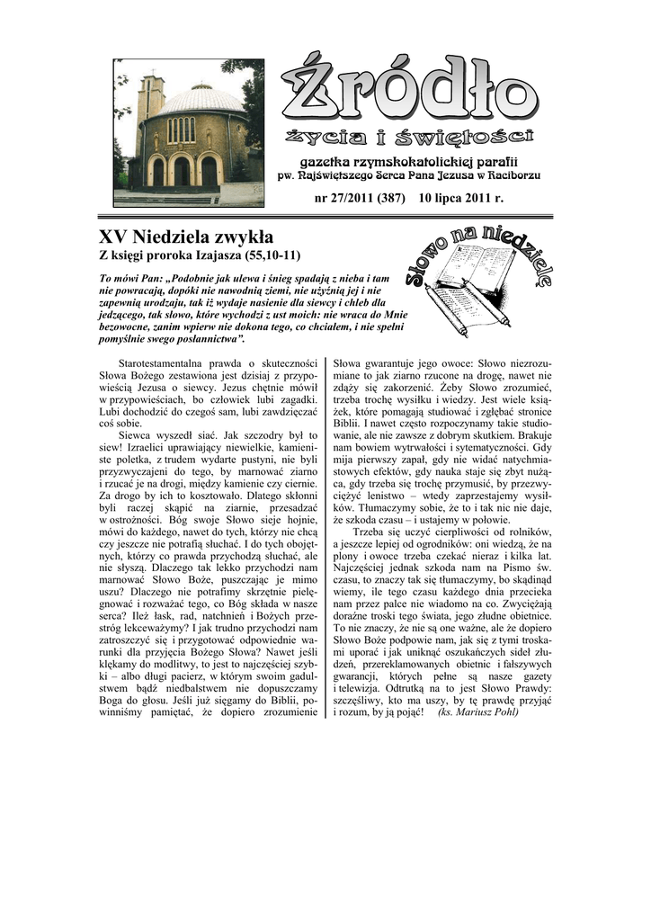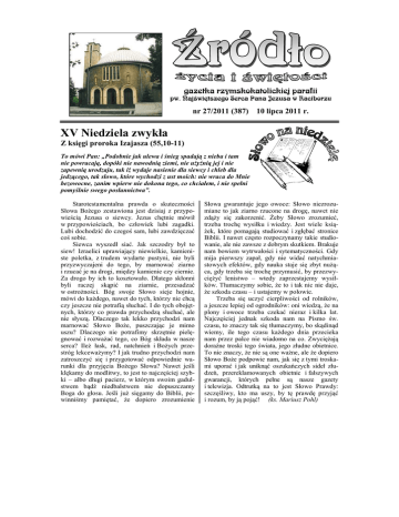 gazetka rzymskokatolickiej parafii pw. Najświętszego Serca Pana Jezusa w Raciborzu nr 27/2011 (387) 10 lipca 2011 r. XV Niedziela zwykła Z księgi proroka Izajasza (55,10-11) To mówi Pan: „Podobnie jak ulewa i śnieg spadają z nieba i tam nie powracają, dopóki nie nawodnią ziemi, nie uŜyźnią jej i nie zapewnią urodzaju, tak iŜ wydaje nasienie dla siewcy i chleb dla jedzącego, tak słowo, które wychodzi z ust moich: nie wraca do Mnie bezowocne, zanim wpierw nie dokona tego, co chciałem, i nie spełni pomyślnie swego posłannictwa”. Starotestamentalna prawda o skuteczności Słowa BoŜego zestawiona jest dzisiaj z przypowieścią Jezusa o siewcy. Jezus chętnie mówił w przypowieściach, bo człowiek lubi zagadki. Lubi dochodzić do czegoś sam, lubi zawdzięczać coś sobie. Siewca wyszedł siać. Jak szczodry był to siew! Izraelici uprawiający niewielkie, kamieniste poletka, z trudem wydarte pustyni, nie byli przyzwyczajeni do tego, by marnować ziarno i rzucać je na drogi, między kamienie czy ciernie. Za drogo by ich to kosztowało. Dlatego skłonni byli raczej skąpić na ziarnie, przesadzać w ostroŜności. Bóg swoje Słowo sieje hojnie, mówi do kaŜdego, nawet do tych, którzy nie chcą czy jeszcze nie potrafią słuchać. I do tych obojętnych, którzy co prawda przychodzą słuchać, ale nie słyszą. Dlaczego tak lekko przychodzi nam marnować Słowo BoŜe, puszczając je mimo uszu? Dlaczego nie potrafimy skrzętnie pielęgnować i rozwaŜać tego, co Bóg składa w nasze serca? IleŜ łask, rad, natchnień i BoŜych przestróg lekcewaŜymy? I jak trudno przychodzi nam zatroszczyć się i przygotować odpowiednie warunki dla przyjęcia BoŜego Słowa? Nawet jeśli klękamy do modlitwy, to jest to najczęściej szybki – albo długi pacierz, w którym swoim gadulstwem bądź niedbalstwem nie dopuszczamy Boga do głosu. Jeśli juŜ sięgamy do Biblii, powinniśmy pamiętać, Ŝe dopiero zrozumienie Słowa gwarantuje jego owoce: Słowo niezrozumiane to jak ziarno rzucone na drogę, nawet nie zdąŜy się zakorzenić. śeby Słowo zrozumieć, trzeba trochę wysiłku i wiedzy. Jest wiele ksiąŜek, które pomagają studiować i zgłębać stronice Biblii. I nawet często rozpoczynamy takie studiowanie, ale nie zawsze z dobrym skutkiem. Brakuje nam bowiem wytrwałości i sytematyczności. Gdy mija pierwszy zapał, gdy nie widać natychmiastowych efektów, gdy nauka staje się zbyt nuŜąca, gdy trzeba się trochę przymusić, by przezwycięŜyć lenistwo – wtedy zaprzestajemy wysiłków. Tłumaczymy sobie, Ŝe to i tak nic nie daje, Ŝe szkoda czasu – i ustajemy w połowie. Trzeba się uczyć cierpliwości od rolników, a jeszcze lepiej od ogrodników: oni wiedzą, Ŝe na plony i owoce trzeba czekać nieraz i kilka lat. Najczęściej jednak szkoda nam na Pismo św. czasu, to znaczy tak się tłumaczymy, bo skądinąd wiemy, ile tego czasu kaŜdego dnia przecieka nam przez palce nie wiadomo na co. ZwycięŜają doraźne troski tego świata, jego złudne obietnice. To nie znaczy, Ŝe nie są one waŜne, ale Ŝe dopiero Słowo BoŜe podpowie nam, jak się z tymi troskami uporać i jak uniknąć oszukańczych sideł złudzeń, przereklamowanych obietnic i fałszywych gwarancji, których pełne są nasze gazety i telewizja. Odtrutką na to jest Słowo Prawdy: szczęśliwy, kto ma uszy, by tę prawdę przyjąć i rozum, by ją pojąć! (ks. Mariusz Pohl) 2 Źródło - gazetka XV Niedziela zwykła – 10 lipca 2011 Iz 55,10-11; Rz 8,18-23; Mt 13,1-23 700 Za † Jerzego Waliczka (od współlokatorów z ulicy Katowickiej 13) 830 Godzinki o Niepokalanym Poczęciu NMP Za † matkę Helenę w I rocznicę śmierci i dusze w czyśćcu cierpiące 900 1030 Do BoŜej Opatrzności w intencji Zofii i Stanisława StęŜowskich z okazji 55. rocznicy ślubu z podziękowaniem za otrzymane łaski, z prośbą o BoŜe błogosławieństwo i zdrowie w całej rodzinie 1200 Do BoŜej Opatrzności w intencji Józefa z okazji 70. rocznicy urodzin z podziękowaniem za otrzymane łaski, z prośbą o BoŜe błogosławieństwo i zdrowie na dalsze lata Ŝycia RóŜaniec za młode pokolenie 1700 1730 Nieszpory niedzielne Za † matkę Annę Klimaszka w 30. rocznicę śmierci, †† dziadków z obu stron 1800 Poniedziałek – 11 lipca 2011 – św. Benedykta, opata, patrona Europy Mt 19,27-29 630 Za †† rodziców Krystynę i Franciszka Hellebrandt, dziadków z obu stron i Annę Kroh 1800 Do BoŜej Opatrzności w intencji Witolda z okazji 50. urodzin oraz Heleny z okazji 75. urodzin z podziękowaniem za otrzymane łaski, z prośbą o zdrowie na dalsze lata i o błogosławieństwo BoŜe w rodzinie Wtorek – 12 lipca 2011 – św. Brunona Bonifacego z Kwerfurtu, bpa i męcz. Mt 11,20-24 630 Do BoŜej Opatrzności w intencji Aleksandry i Piotra w 20. rocznicę ślubu, z podziękowaniem za otrzymane łaski, z prośbą o BoŜe błogosławieństwo dla całej rodziny Kalus 1800 Do Miłosierdzia BoŜego za † męŜa i ojca Edwarda Bajsarowicza w 10. rocznicę śmierci, †† rodziców z obu stron oraz o błogosławieństwo BoŜe i zdrowie w intencji całej rodziny Środa – 13 lipca 2011 – św. Andrzeja Świerada i Benedykta, pustelników Mt 11,25-27 630 Za † męŜa Pawła Czecha w 3. rocznicę śmierci, †† rodziców z obu stron: Czech i Zubel 1800 Za † Eugeniusza Kwiatka w I rocznicę śmierci Czwartek – 14 lipca 2011 Mt 11,28-30 630 Za †† Michała Kłoska, matkę Florentinę, siostrę Helgę i pokrewieństwo 1800 Za †† rodziców Zofię i Władysława oraz teścia Antoniego Piątek – 15 lipca 2011 – św. Bonawentury, bpa i doktora K-ła Mt 12,1-8 630 Za †† męŜa Antoniego, rodziców Józefę i Jana Koczy, dziadków z obu stron 1800 Za zmarłych (zbiorowa): Za † ks. Proboszcza Alojzego Jurczyka w 6. rocznicę śmierci (od RóŜ RóŜańcowych), za †† Wandę Karaczan w 20. rocznicę śmierci, ojca Piotra, brata Juliana, matkę Agatę i dziadków z obu stron 