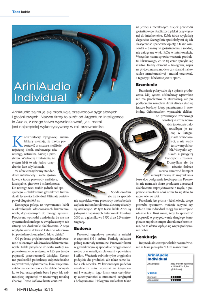 Test kable na jednej z metalowych tulejek przewodu głośnikowego i tabliczce z pleksi przywiązanej do interkonektu. Kable także wyglądają elegancko. Szczególnie spodobały mi się ich elastyczność i pancerne oploty, a także końcówki – banany w głośnikowym i solidne, nie zakręcane wtyki RCA w interkonekcie. Wszystko razem sprawia wrażenie produktu luksusowego, co w tej cenie spotyka się rzadko. Każdy element – hologram, napis na płytce z nazwą modelu czy strzałki na koszulce termokurczliwej – musiał kosztować, a tego typu bibelotów jest tu sporo. AriniAudio Individual Brzmienie AriniAudio zajmuje się produkcją przewodów sygnałowych i głośnikowych. Nazwa firmy to skrót od Argentum Intelligence In Audio, z czego łatwo wywnioskować, jaki metal jest najczęściej wykorzystywany w roli przewodnika. K onstruktorzy bydgoskiej manufaktury uważają, że trzeba pozostawić w muzyce możliwie najwięcej detali, zachowując równowagę, naturalną barwę i przestrzeń. Wychodzą z założenia, że system hi-fi to nie jedno urządzenie, lecz cały łańcuch. W ofercie znajdziemy standardowe interkonety i kable głośnikowe, a także przewody zasilające, koaksjalne, gitarowe i mikrofonowe. Do naszego testu trafiło jednak coś specjalnego – okablowanie głośnikowe Individual i łączówka Individual Ultimate o nietypowej długości 0,9 m. Koncepcja polega na wytwarzaniu kabli o określonych właściwościach brzmieniowych, dopasowanych do danego systemu. Producent wychodzi z założenia, że nie ma systemu doskonałego, w związku z czym nie istnieje też doskonałe okablowanie. Z tego względu warto dobierać kable do właściwości posiadanych urządzeń. Jak to działa? Od podstaw projektowane jest okablowanie o założonych właściwościach brzmieniowych. Kable przysłane do testu zostały zaprojektowane do systemu, w którym trzeba poprawić przestrzenność dźwięku. Zestaw ma podkreślić podzakresy odpowiedzialne za przestrzeń, wybrzmienia, lokalizację muzyków na scenie oraz ciche detale. Wszystko to bez uszczuplania basu i przy jak najmniejszej ingerencji w równowagę tonalną i barwę. Toż to kablowe haute couture! 42 Hi•Fi i Muzyka 10/13 Spodziewałem się, że za specjalnie zaprojektowane przewody trzeba będzie zapłacić milion kotylionów, ale ceny okazały się atrakcyjne. W tym teście kable Arini są jednymi z najtańszych. Interkonekt kosztuje 2080 zł, a głośnikowy 1950 zł za 2,5-metrową parę. Budowa Przewód sygnałowy powstał z miedzi o czystości 8N i srebra. Funkcję izolatora pełnią materiały naturalne. Przewodnikami w głośnikowym są specjalnie przygotowane srebro oraz miedź, a izolatorami – powietrze i teflon. Wrażenie robi nie tylko oryginalne podejście do produkcji, ale także same kable i ich otoczka. W kartonowym pudełku znajdziemy m.in. woreczki ze ściągaczami i wyszytym logo firmy oraz certyfikaty autentyczności z numerami seryjnymi i hologramami. Hologram znalazłem także Brzmienie pokrywało się z opisem producenta. Mój system odsłuchowy wprawdzie nie ma problemów ze stereofonią, ale po podłączeniu kompletu Arini dźwięk stał się jeszcze bardziej lotny, przestrzenny i swobodny. Odnotowałem wprawdzie delikatne przesunięcie równowagi tonalnej w stronę wysokich tonów, ale traktowałbym je raczej w kategoriach właściwości, a nie wady testowanych kabli. Wszystko wynikało z przyjętej koncepcji strojenia. Domyślam się, że równie dobrze można zamówić komplet zaprojektowany do uwypuklania basu albo podgrzania środka pasma. Pewności nie mam, ale skoro producent dostarczył okablowanie zaprojektowane z myślą o poprawie stereofonii i dokładnie to się stało, to raczej wie, co robi. Przesłanie jest proste – jeżeli wiecie, czego potrzeba systemowi, możecie zapytać, czy kable z linii Individual mogą być nastrojone właśnie tak. Kusi mnie, żeby to sprawdzić i poprosić o przygotowanie drugiego kompletu o zupełnie innym charakterze brzmienia, bo ta oferta wydaje się wręcz podejrzanie dobra. Konkluzja Indywidualnie strojone kable na zamówienie za takie pieniądze? Duże zaskoczenie. AriniAudio Individual Cena/długość: 2080 zł/0,9 m (łączówka) + 1950 zł/2 x 2,5 m (głośnikowe) Ocena: Brzmienie: Jakość/cena: §§§§§ §§§§§
