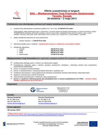 Oferta uczestnictwa w targach SIAL – Międzynarodowe Targi Przemysłu Spożywczego Toronto, Kanada 30 kwietnia – 2 maja 2013 Podstawowe ceny obowiązujące podczas tych targów kształtują się na poziomie: powierzchnia zabudowana w pawilonie (pakiet 9 m², 3m x 3m): 21.500,00 PLN netto* *Cena zawiera: opłatę rejestracyjną (wpis z nazwą firmy i numerem stoiska do katalogu drukowanego i na stronę internetową targów, 10 zaproszeń do zwiedzania, dwie karty wystawcy), boczne i tylne ścianki, wykładzinę (cztery kolory do wyboru: szary, czarny, niebieski, czerwony), dwie półki, stolik i dwa krzesła, kosz na śmieci, fryz z nazwą firmy, 1 punkt świetlny, 1 gniazdko opłaty dodatkowe doliczane do ceny powierzchni: • stoisko narożne + 1.350,00 PLN netto zabudowa stoiska wraz z mediami - indywidualna wycena w zależności od projektu stoiska dodatkowa zabudowa: • krzesło • półka • stolik • lada+hocker 250,00 PLN netto 250,00 PLN netto 400,00 PLN netto 370,00 PLN netto Międzynarodowe Targi Poznańskie jako organizator wystąpień polskich firm za granicą, zapewniają: profesjonalną obsługę przed, w trakcie i po zakończeniu targów kompleksową realizację usług z zakresu wynajmu powierzchni, lokalizacji i zabudowy stoiska oraz zamówienia wyposażenia dodatkowego pomoc w wynajmie tłumaczy/hostess pomoc w zakwaterowaniu i rezerwacji biletów lotniczych, uzyskaniu wiz możliwość skorzystania z usług logistycznych (transport uczestników lotnisko-hotel-lotnisko, hotel-targi-hotel) dogodne, konkurencyjne warunki finansowe rekomendacje sprawdzonych i rzetelnych usług spedycyjnych pomoc w uzyskaniu dofinansowania dla przedsiębiorców w ramach poddziałania 6.5.2 POIG – wnioski można składać najpóźniej do dnia 25.03.2013** Organizator Międzynarodowe Targi Poznańskie sp. z o.o. ul. Głogowska 14 60-734 Poznań Kontakt Bartosz Dembiński tel. (61) 869 24 62 faks (61) 869 20 40 [email protected] Donata Paszkiewicz tel. (61) 869 21 26 faks (61) 869 29 66 [email protected] Termin zgłoszeń 20 marzec 2013 **| Więcej informacji na: http://www.mg.gov.pl/Fundusze+UE/POIG/Dzialania/Dzialanie+652/Dokumenty+dla+wnioskodawcow, http://www.mg.gov.pl/Fundusze+UE/POIG/Dzialania/Dzialanie+652/Ogloszenie+o+naborze Projekt współfinansowany przez Unię Europejską ze środków Europejskiego Funduszu Rozwoju Regionalnego