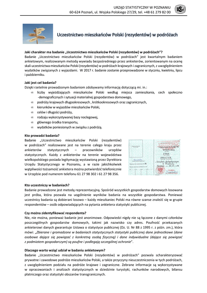 URZĄD STATYSTYCZNY W POZNANIU 60-624 Poznań, ul. Wojska Polskiego 27/29, tel. +48 61 279 82 00 Uczestnictwo mieszkańców Polski (rezydentów) w podróżach Jaki charakter ma badanie „Uczestnictwo mieszkańców Polski (rezydentów) w podróżach”? Badanie „Uczestnictwo mieszkańców Polski (rezydentów) w podróżach” jest kwartalnym badaniem ankietowym, realizowanym metodą wywiadu bezpośredniego przez ankieterów, zorientowanym na ocenę skali uczestnictwa mieszkańców Polski (rezydentów) w podróżach krajowych i zagranicznych, z uwzględnieniem wydatków związanych z wyjazdami. W 2017 r. badanie zostanie przeprowadzone w styczniu, kwietniu, lipcu i październiku. Jaki jest cel badania? Dzięki rzetelnie prowadzonym badaniom zdobywamy informację dotyczącą mi. in.: • liczby wyjeżdżających mieszkańców Polski według miejsca zamieszkania, cech społeczno -demograficznych i sytuacji materialnej gospodarstwa domowego, • podróży krajowych długookresowych , krótkookresowych oraz zagranicznych, • kierunków w wyjazdów mieszkańców Polski, • celów i długości podróży, • rodzaju wykorzystywanej bazy noclegowej, • głównego środka transportu, • wydatków poniesionych w związku z podróżą. Kto prowadzi badania? Badanie „Uczestnictwo mieszkańców Polski (rezydentów) w podróżach” realizowane jest na terenie całego kraju przez ankieterów statystycznych – pracowników urzędów statystycznych. Każdy z ankieterów na terenie województwa wielkopolskiego posiada legitymację wystawioną przez Dyrektora Urzędu Statystycznego w Poznaniu, a w razie jakichkolwiek wątpliwości tożsamość ankietera można potwierdzić telefonicznie w Urzędzie pod numerem telefonu 61 27 98 302 i 61 27 98 356. Kto uczestniczy w badaniach? Badanie prowadzone jest metodą reprezentacyjną. Spośród wszystkich gospodarstw domowych losowana jest próba, która pozwala na uogólnienie wyników badania na wszystkie gospodarstwa. Ponieważ uczestnicy badania są dobierani losowo – każdy mieszkaniec Polski ma równe szanse znaleźć się w grupie respondentów – osób odpowiadających na pytania ankietera statystyki publicznej. Czy można zidentyfikować respondenta? Nie, nie można, ponieważ badanie jest anonimowe. Odpowiedzi nigdy nie są łączone z danymi członków poszczególnych gospodarstw domowych, takimi jak nazwisko czy adres. Poufność przekazanych ankieterowi danych gwarantuje Ustawa o statystyce publicznej (Dz. U. Nr 88 z 1995 r. z późn. zm.), która mówi: „Zbierane i gromadzone w badaniach statystycznych statystyki publicznej dane jednostkowe (dane osobowe dające się powiązać z konkretną osobą fizyczną) i dane indywidualne (dające się powiązać z podmiotem gospodarczym) są poufne i podlegają szczególnej ochronie”. Dlaczego warto wziąć udział w badaniu ankietowym? Badanie „Uczestnictwo mieszkańców Polski (rezydentów) w podróżach” pozwala scharakteryzować prywatne i zawodowe podróże mieszkańców Polski, a także przyczyny nieuczestniczenia w tych podróżach, z uwzględnieniem podziału na podróże krajowe i zagraniczne. Zebrane informacje są wykorzystywane w opracowaniach i analizach statystycznych w dziedzinie turystyki, rachunków narodowych, bilansu płatniczego oraz statystyki obszarów transgranicznych. URZĄD STATYSTYCZNY W POZNANIU 60-624 Poznań, ul. Wojska Polskiego 27/29, tel. +48 61 279 82 00 Co się dzieje z odpowiedziami respondenta? Wszystkie informacje zebrane w badaniu są dostępne jedynie dla pracowników statystyki publicznej zobowiązanych do zachowania tajemnicy statystycznej. Po przeprowadzeniu analiz i opracowaniu danych są one publikowane w formie zbiorczych tablic wynikowych, diagramów, wykresów czy map. Z wynikami badań można zapoznać się korzystając z roczników statystycznych, biuletynów i innych publikacji statystycznych, udostępnianych w formie papierowej, na płytach CD oraz w internecie (www.stat.gov.pl). Czego dowiadujemy się z badania „Uczestnictwo mieszkańców Polski (rezydentów) w podróżach”: Struktura odpraw granicznych na lotniskach. Wyniki badania będą dostępne m. in. w: „Ruch graniczny oraz wydatki cudzoziemców w Polsce i Polaków za granicą w 2017 r.” – termin wydania październik 2018 r., „Turystyka w 2017 r.” – termin wydania czerwiec 2018 r. Więcej informacji o badaniach ankietowych na stronie http://stat.gov.pl/informacja-o-badaniach-ankietowych/ oraz http://poznan.stat.gov.pl/co-gdzie-jak-zalatwic/gdy-skontaktuje-sie-z-nami-ankieter/