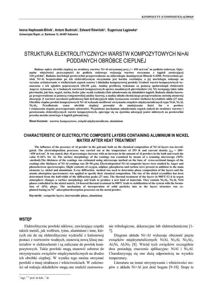 KOMPOZYTY (COMPOSITES) 4(2004)9 Iwona Napłoszek-Bilnik1, Antoni Budniok2, Edward Rówiński3, Eugeniusz Łągiewka4 Uniwersytet Śląski, ul. Bankowa 12, 40-007 Katowice STRUKTURA ELEKTROLITYCZNYCH WARSTW KOMPOZYTOWYCH Ni+Al PODDANYCH OBRÓBCE CIEPLNEJ Badano wpływ obróbki cieplnej na strukturę warstwy Ni+Al otrzymanej przy j = 450 mA/cm2 na podłożu stalowym. Optymalne właściwości przyczepności do podłoża stalowego wykazują warstwy otrzymane z kąpieli zawierającej 120 gAl/dm3. Badania morfologii powierzchni przeprowadzono na mikroskopie skaningowym Hitachi S-4200. Powierzchnia powłok Ni+Al bezpośrednio po ich elektrolitycznym otrzymaniu jest bardzo rozwinięta, a jej morfologia wskazuje na wyraźne zróżnicowanie w wielkościach cząstek osnowy i składnika kompozytowej powłoki. Grubość warstw kompozytowych wyznaczono z ich zgładów poprzecznych (20÷50 μm). Analizę profilową wykonano za pomocą spektroskopii elektronów Augera; wykazano, że w badanych warstwach kompozytowych oprócz zasadniczych pierwiastków (Al, Ni) występują także takie pierwiastki, jak tlen, węgiel, siarka, fosfor jako wynik rozkładu i/lub zabudowania się składników kąpieli. Badania składu fazowego przeprowadzono za pomocą rentgenowskiej analizy fazowej, a analizę składu chemicznego przeprowadzono metodą atomowej absorpcji. Z wartości szerokości połówkowej linii dyfrakcyjnych niklu wyznaczono również wielkości krystalitów niklu (27 nm). Obróbka cieplna powłok kompozytowych Ni+Al wykazała możliwość otrzymania związków międzymetalicznych typu NiAl, Ni3Al, Ni2Al3. Przedłużenie czasu obróbki cieplnej prowadzi do zmniejszenia ilości faz w powłoce i zwiększenia stopnia przereagowania substratów. Wyjaśniono mechanizm zabudowania cząstek stałych do struktury warstwy i powstawania elektrolitycznych warstw kompozytowych, opierając się na zjawisku adsorpcji jonów niklowych na powierzchni proszku metalu zawartego w kąpieli galwanicznej. Słowa kluczowe: warstwy kompozytowe, związki międzymetaliczne, aluminium CHARACTERISTIC OF ELECTROLYTIC COMPOSITE LAYERS CONTAINING ALUMINIUM IN NICKEL MATRIX AFTER HEAT TREATMENT The influence of the presence of Al powder in the galvanic bath on the chemical composition of Ni+Al layers was investigated. The electrodeposition processes was carried out at the temperature of 293 K and current density jdep = 200÷ ÷450 mA/cm2. It was stated, that Al percentages increase with an increase in the amount of Al powders in the bath and reach the value 8÷44% for Al. The surface morphology of the coatings was examined by means of a scanning microscopy (XPS-method).The thickness of the coatings was estimated using microscope method on the base of cross-sectional images of the coatings (the thickness of Ni+Al coatings was 20÷50 μm). Electrodeposited Ni+Al composite layers were studied by Auger and photoelectron spectroscopies. Slight contents of oxygen, sulphur, phosphorus and carbon were present in addition to the main elements i.e. nickel and aluminium. X-ray diffraction method was used to determine phase composition of the layers and the atomic absorption spectrometry was applied to specify their chemical composition. The size of the nickel crystallites has been determined from the half-widht of the diffraction peaks (27 nm). The thermal treatment of the layers in 900°C/12 h in argon atmosphere changes a surface morphology and leads to produce a new kind of materials. They contain Ni2Al3, Ni3Al, NiAl phases embedded in the nickel matrix. 24-houred thermal treatment in 900°C leads to stabilization of the system with the formation of AlNi3 phase. The mechanism of incorporation of solid particles into to the layers structure was explained basing on Ni2+ adsorption/desorption processes on the metal powder. Key words: composite layers, intermetallic phase, aluminium WSTĘP Elektrolityczne powłoki niklowe, zawierające cząstki takich metali, jak wolfram, tytan, aluminium i inne, których nie da się elektrolitycznie wydzielić z kationowej postaci z roztworów wodnych, stanowią nową klasę materiałów w elektrochemii i są zaliczane do powłok kompozytowych. Takie powłoki mogą stanowić substrat do otrzymywania związków międzymetalicznych na drodze ich obróbki cieplnej. W wyniku tego można otrzymać powłoki o innej strukturze i właściwościach. W zależności od rodzaju składników mogą one znaleźć zastosowa1 mgr, 2, 4 prof. dr hab., 3 dr nie tribologiczne, dekoracyjne lub elektrochemiczne [17]. Diagram układu Ni+Al wykazuje obecność pięciu związków międzymetalicznych: NiAl, Ni3Al, Ni2Al3, Al3Ni, Al3Ni5 [8]. Wśród tych związków szczególnie dwa posiadają znaczenie aplikacyjne: NiAl i Ni3Al. Charakteryzują się one dużą odpornością na wysokie temperatury. Literatura na temat otrzymywania i właściwości stopów z układu Ni+Al jest dość bogata [9-18]. Stopy te 80 I. Napłoszek-Bilnik, A. Budniok, E. Rówiński, E. Łągiewka otrzymać można metodą szybkiego chłodzenia, mechaniczną syntezą, poprzez energetyczne rozdrobnienie, metodą metalurgii proszkowej lub ogniowej. Celem pracy jest elektrolityczne wytworzenie powłok kompozytowych na osnowie niklu zawierających wbudowany proszek aluminium, wykazanie nanometrycznego rozdrobnienia struktury krystalicznej osnowy kompozytu oraz w wyniku ich obróbki cieplnej otrzymanie związków międzymetalicznych. CZĘŚĆ DOŚWIADCZALNA Powłoki kompozytowe Ni+Al osadzano elektrolitycznie z kąpieli do niklowania. Badano wpływ gęstości prądu osadzania i zawartości proszku Al w kąpieli galwanicznej na skład chemiczny i morfologię powierzchni otrzymanych warstw kompozytowych. Skład kąpieli i warunki elektroosadzania omówiono w pracy [11]. Badania morfologii powierzchni przeprowadzono przy użyciu mikroskopu skaningowego Hitachi S-4200, wyposażonego w system do mikroanalizy rentgenowskiej typu EDS firmy Noran. Obrazy powierzchni rejestrowano pr