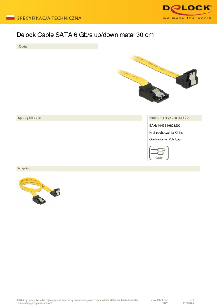 Delock Cable SATA 6 Gb/s up/down metal 30 cm Opis Specyfikacja Numer artykułu 82820 EAN: 4043619828203 Kraj pochodzenia: China Opakowanie: Poly bag Zdjęcia © 2017 by Delock. Wszelkie pojawiające się tutaj nazwy i znaki należą do ich odpowiednich właścicieli. Błędy drukarskie, zmiany & pomyłki zastrzeżone. Powered by TCPDF (www.tcpdf.org) www.delock.com 82820 1/1 03.03.2017