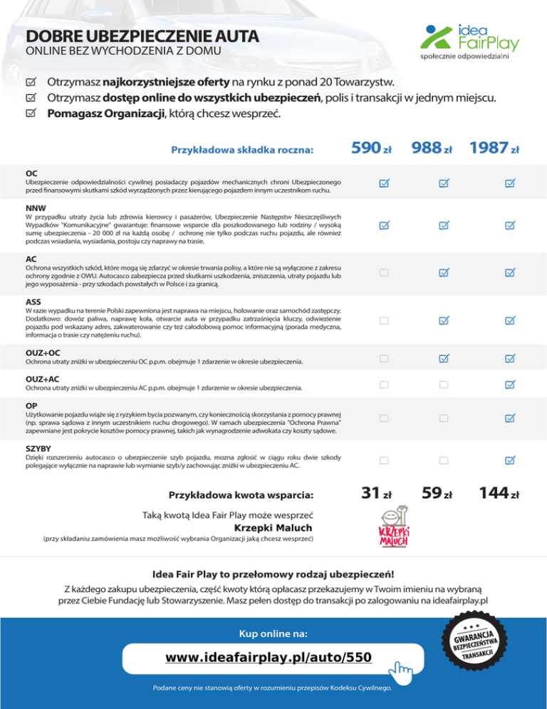 DOBRE UBEZPIECZENIE AUTA ONLINE BEZ WYCHODZENIA Z DOMU Otrzymasz najkorzystniejsze oferty na rynku z ponad 20 Towarzystw. Otrzymasz dostęp online do wszystkich ubezpieczeń, polis i transakcji w jednym miejscu. Pomagasz Organizacji, którą chcesz wesprzeć. Przykładowa składka roczna: 590 zł 988 zł 1987 zł OC Ubezpieczenie odpowiedzialności cywilnej posiadaczy pojazdów mechanicznych chroni Ubezpieczonego przed finansowymi skutkami szkód wyrządzonych przez kierującego pojazdem innym uczestnikom ruchu. NNW W przypadku utraty życia lub zdrowia kierowcy i pasażerów, Ubezpieczenie Następstw Nieszczęśliwych Wypadków "Komunikacyjne" gwarantuje: finansowe wsparcie dla poszkodowanego lub rodziny / wysoką sumę ubezpieczenia - 20 000 zł na każdą osobę / ochronę nie tylko podczas ruchu pojazdu, ale również podczas wsiadania, wysiadania, postoju czy naprawy na trasie. AC Ochrona wszystkich szkód, które mogą się zdarzyć w okresie trwania polisy, a które nie są wyłączone z zakresu ochrony zgodnie z OWU. Autocasco zabezpiecza przed skutkami uszkodzenia, zniszczenia, utraty pojazdu lub jego wyposażenia - przy szkodach powstałych w Polsce i za granicą. ASS W razie wypadku na terenie Polski zapewniona jest naprawa na miejscu, holowanie oraz samochód zastępczy. Dodatkowo: dowóz paliwa, naprawę koła, otwarcie auta w przypadku zatrzaśnięcia kluczy, odwiezienie pojazdu pod wskazany adres, zakwaterowanie czy też całodobową pomoc informacyjną (porada medyczna, informacja o trasie czy natężeniu ruchu). OUZ+OC Ochrona utraty zniżki w ubezpieczeniu OC p.p.m. obejmuje 1 zdarzenie w okresie ubezpieczenia. OUZ+AC Ochrona utraty zniżki w ubezpieczeniu AC p.p.m. obejmuje 1 zdarzenie w okresie ubezpieczenia. OP Użytkowanie pojazdu wiąże się z ryzykiem bycia pozwanym, czy koniecznością skorzystania z pomocy prawnej (np. sprawa sądowa z innym uczestnikiem ruchu drogowego). W ramach ubezpieczenia "Ochrona Prawna" zapewniane jest pokrycie kosztów pomocy prawnej, takich jak wynagrodzenie adwokata czy koszty sądowe. SZYBY Dzięki rozszerzeniu autocasco o ubezpieczenie szyb pojazdu, mozna zgłosić w ciągu roku dwie szkody polegające wyłącznie na naprawie lub wymianie szyb/y zachowując zniżki w ubezpieczeniu AC. Przykładowa kwota wsparcia: 31 zł 59 zł 144 zł Taką kwotą Idea Fair Play może wesprzeć Krzepki Maluch (przy składaniu zamówienia masz możliwość wybrania Organizacji jaką chcesz wesprzeć) Idea Fair Play to przełomowy rodzaj ubezpieczeń! Z każdego zakupu ubezpieczenia, część kwoty którą opłacasz przekazujemy w Twoim imieniu na wybraną przez Ciebie Fundację lub Stowarzyszenie. Masz pełen dostęp do transakcji po zalogowaniu na ideafairplay.pl Kup online na: www.ideafairplay.pl/auto/550 Podane ceny nie stanowią oferty w rozumieniu przepisów Kodeksu Cywilnego.