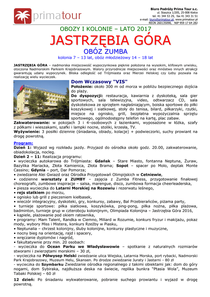 Biuro Podróży Prima Tour s.c. ul. Staszica 1/205, 25-008 Kielce tel. 41 344 53 29, fax 41 343 31 51 e-mail: [email protected], www.primatour.pl REON 260135098, NIP 959 17 64 282 OBOZY I KOLONIE – LATO 2017 JASTRZĘBIA GÓRA OBÓZ ZUMBA kolonia 7 – 13 lat, obóz młodzieżowy 14 – 18 lat JASTRZĘBIA GÓRA – nadmorska miejscowość wypoczynkowa pięknie położona na wysokim, klifowym urwisku, otoczona Nadmorskim Parkiem Krajobrazowym. Walory przyrodnicze miejscowości oraz mnóstwo innych atrakcji gwarantują udany wypoczynek. Bliska odległość od Trójmiasta oraz Mierzei Helskiej czy Łeby pozwala na realizację wielu wycieczek. Dom Wczasowy "VIS" Położenie: około 300 m od morza w pobliżu bezpiecznego dojścia do plaży. Do dyspozycji: restauracja, kawiarnia z dyskoteką, sala gier sportowych, sala telewizyjna, video, odtwarzacz CD, sala dyskotekowa ze sprzętem nagłaśniającym, boiska sportowe do piłki koszykowej i siatkowej, stoły do tenisa, bilard, piłkarzyki, rzutki, miejsce na ognisko, grill, bezpłatna wypożyczalnia sprzętu sportowego, ogólnodostępny telefon na kartę, plac zabaw. Zakwaterowanie: w pokojach 3 i 4–osobowych z łazienkami, wyposażone w łóżka, szafy z półkami i wieszakami, szafki i lampki nocne, stoliki, krzesła, TV. Wyżywienie: 3 posiłki dziennie (śniadania, obiady, kolacje) + podwieczorki, suchy prowiant na drogę powrotną. Program: Dzień 1: Wyjazd wg rozkładu jazdy. Przyjazd do ośrodka około godz. 20.00, zakwaterowanie, obiadokolacja, nocleg. Dzień 2 – 11: Realizacja programu: • wycieczka autokarowa do Trójmiasta: Gdańsk – Stare Miasto, fontanna Neptuna, Żuraw, Bazylika Mariacka, Złota Kamienica, Złota Brama; Sopot – spacer po Molo, deptak Monte Cassino; Gdynia – port, Dar Pomorza; • zwiedzanie Alei Gwiazd oraz Ośrodka Przygotowań Olimpijskich w Cetniewie, • codzienne warsztaty z ZUMBY – zajęcia z Zumba Fitness, przygotowanie finałowej choreografii, zumbowe inspiracje – salsa, marengue, disco, zumbowa formacja cheerleaderska, • piesza wycieczka do Latarni Morskiej na Rozewiu i rezerwatu leśnego, • rejs statkiem po morzu, • ognisko lub grill z pieczeniem kiełbasek, • wieczór integracyjny, dyskoteki, gry, konkursy, zabawy, Bal Przebierańców, piżama party, • turnieje sportowe: piłka siatkowa, koszykówka, ping-pong, piłka nożna, piłka plażowa, badminton, turnieje grup w czteroboju kolonijnym, Olimpiada Kolonijna – Jastrzębia Góra 2016, • kąpiele, plażowanie pod okiem ratownika, • programy: Mam Talent, Randka w Ciemno, Miliard w Rozumie, konkurs fryzur i makijażu, pokaz mody, wybory Miss i Mistera, konkurs Rzeźby w Piasku, • Neptunalia – chrzest kolonijny, śluby kolonijne, konkursy plastyczne i muzyczne, • nocny bieg na orientację, rajd i spacery, • wręczanie dyplomów i nagród, • fakultatywnie przy min. 20 osobach: - wycieczka do Ocean Parku we Władysławowie – spotkanie z naturalnych rozmiarów stworami i zwierzętami morskimi – 30 zł, - wycieczka na Półwysep Helski zwiedzanie ulica Wiejska, Latarnia Morska, port rybacki, Nadmorski Park Krajobrazowy, Muzeum Helu, Skansen. Po drodze zwiedzanie Juraty i Jastarni - 80 zł - wycieczka do Szymbarku Zwiedzanie ośrodka regionalnego z takimi obiektami jak: dom do góry nogami, dom Sybiraka, najdłuższa deska na świecie, replika bunkra “Ptasia Wola”, Muzeum Tabaki Polskiej – 60 zł 12 dzień: Po śniadaniu wykwaterowanie, pobranie suchego prowiantu i wyjazd w drogę powrotną. Biuro Podróży Prima Tour s.c. ul. Staszica 1/205, 25-008 Kielce tel/fax 41 344 53 29, 41 343 31 51 e-mail: [email protected], www.primatour.pl REGON 260135098, NIP 959 17 64 282 termin 25.06 – 06.07.2017 Cena 1 659 zł 06.07 – 17.07.2017 1 699 zł 17.07 – 28.07.2017 1 699 zł Cena obejmuje: transport autokarem, noclegi w pokojach z łazienkami, wyżywienie: 3 posiłki dziennie + podwieczorek, suchy prowiant na drogę powrotną, opiekę doświadczonej kadry pedagogicznej, instruktora fitness, medycznej oraz ratownika WOPR na plaży, realizację programu, ubezpieczenie NNW. Dodatkowo płatne: wycieczki fakultatywne; dopłata do wyjazdów antenowych – rozkład dostępny na www.primatour.pl; ubezpieczenie od kosztów rezygnacji +50 zł. Uwagi: Pierwszy posiłek kolacja w dniu przyjazdu, ostatni śniadanie w dniu wyjazdu oraz suchy prowiant na drogę. Wycieczki fakultatywne odbywają się przy minimum 10 osobach. Koniecznie zabrać legitymację szkolną, nakrycie głowy, krem z filtrem UV, ręcznik.