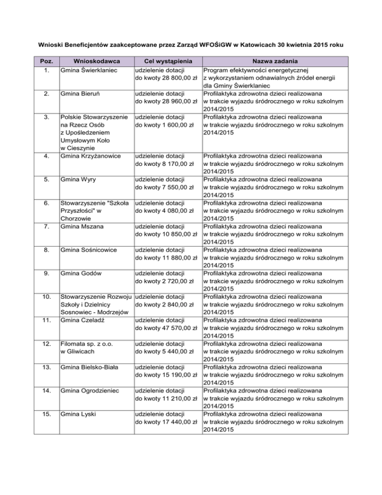 Wnioski Beneficjentów zaakceptowane przez Zarząd WFOŚiGW w Katowicach 30 kwietnia 2015 roku Poz. Wnioskodawca Cel wystąpienia 1. Gmina Świerklaniec 2. Gmina Bieruń 3. 4. Polskie Stowarzyszenie na Rzecz Osób z Upośledzeniem Umysłowym Koło w Cieszynie Gmina Krzyżanowice 5. Gmina Wyry 6. Stowarzyszenie "Szkoła udzielenie dotacji Przyszłości" w do kwoty 4 080,00 zł Chorzowie Gmina Mszana udzielenie dotacji do kwoty 10 850,00 zł 7. udzielenie dotacji Program efektywności energetycznej do kwoty 28 800,00 zł z wykorzystaniem odnawialnych źródeł energii dla Gminy Świerklaniec udzielenie dotacji Profilaktyka zdrowotna dzieci realizowana do kwoty 28 960,00 zł w trakcie wyjazdu śródrocznego w roku szkolnym 2014/2015 udzielenie dotacji Profilaktyka zdrowotna dzieci realizowana do kwoty 1 600,00 zł w trakcie wyjazdu śródrocznego w roku szkolnym 2014/2015 udzielenie dotacji do kwoty 8 170,00 zł udzielenie dotacji do kwoty 7 550,00 zł 8. Gmina Sośnicowice udzielenie dotacji do kwoty 11 880,00 zł 9. Gmina Godów udzielenie dotacji do kwoty 2 720,00 zł 10. Stowarzyszenie Rozwoju udzielenie dotacji Szkoły i Dzielnicy do kwoty 2 840,00 zł Sosnowiec - Modrzejów Gmina Czeladź udzielenie dotacji do kwoty 47 570,00 zł 11. Nazwa zadania 12. Filomata sp. z o.o. w Gliwicach udzielenie dotacji do kwoty 5 440,00 zł 13. Gmina Bielsko-Biała udzielenie dotacji do kwoty 15 190,00 zł 14. Gmina Ogrodzieniec udzielenie dotacji do kwoty 11 210,00 zł 15. Gmina Lyski udzielenie dotacji do kwoty 17 440,00 zł Profilaktyka zdrowotna dzieci realizowana w trakcie wyjazdu śródrocznego w roku szkolnym 2014/2015 Profilaktyka zdrowotna dzieci realizowana w trakcie wyjazdu śródrocznego w roku szkolnym 2014/2015 Profilaktyka zdrowotna dzieci realizowana w trakcie wyjazdu śródrocznego w roku szkolnym 2014/2015 Profilaktyka zdrowotna dzieci realizowana w trakcie wyjazdu śródrocznego w roku szkolnym 2014/2015 Profilaktyka zdrowotna dzieci realizowana w trakcie wyjazdu śródrocznego w roku szkolnym 2014/2015 Profilaktyka zdrowotna dzieci realizowana w trakcie wyjazdu śródrocznego w roku szkolnym 2014/2015 Profilaktyka zdrowotna dzieci realizowana w trakcie wyjazdu śródrocznego w roku szkolnym 2014/2015 Profilaktyka zdrowotna dzieci realizowana w trakcie wyjazdu śródrocznego w roku szkolnym 2014/2015 Profilaktyka zdrowotna dzieci realizowana w trakcie wyjazdu śródrocznego w roku szkolnym 2014/2015 Profilaktyka zdrowotna dzieci realizowana w trakcie wyjazdu śródrocznego w roku szkolnym 2014/2015 Profilaktyka zdrowotna dzieci realizowana w trakcie wyjazdu śródrocznego w roku szkolnym 2014/2015 Profilaktyka zdrowotna dzieci realizowana w trakcie wyjazdu śródrocznego w roku szkolnym 2014/2015 Poz. 16. 17. 18. 19. 20. 21. 22. 23. Wnioskodawca Gmina Psary Cel wystąpienia Nazwa zadania udzielenie dotacji Profilaktyka zdrowotna dzieci realizowana do kwoty 15 000,00 zł w trakcie wyjazdu śródrocznego w roku szkolnym 2014/2015 Profilaktyka zdrowotna dzieci realizowana Miejski Ośrodek Sportu udzielenie dotacji i Rekreacji w Rybniku do kwoty 56 000,00 zł w trakcie wyjazdu śródrocznego w roku szkolnym 2014/2015 Samodzielny Publiczny udzielenie Modernizacja systemu c.o., wentylacji nawiewnoZakład Opieki dofinansowania wywiewnej z rekuperacją oraz termomodernizacja Zdrowotnej - Szpital w formie dotacji poddasza dla zadania "Przebudowa klinicznego Specjalistyczny w Zabrzu do kwoty 65.159 zł oddziału laryngologii wraz z blokiem operacyjnym i pożyczki do kwoty i częściową adaptacją poddasza" 467.538 zł Spółdzielnia udzielenie Termomodernizacja budynku zlokalizowanego Mieszkaniowa "Górnik" dofinansowania w Sosnowcu przy ulicy: Braci Śniadeckich 5-5A w Będzinie w formie pożyczki należącego do zasobów Spółdzielni do kwoty 196.603 zł Mieszkaniowej ,,Górnik'' w Będzinie PROSPERPLAST udzielenie Budowa instalacji fotowoltaicznej dla zaspokojenia części potrzeb własnych obiektu biurowoSp. z o.o. SKA dofinansowania administracyjnego w Rybarzowicach przy w Rybarzowicach w formie dotacji ul. Wilkowskiej 968 do kwoty 70.966 zł PKM Sp. z o.o. udzielenia Wykonanie instalacji kolektorów słonecznych Sosnowiec dofinansowania w budynku hali napraw zlokalizowanego na w formie dotacji terenie zajezdni autobusowej w Dąbrowie do kwoty 191.332 zł Górniczej przy al. Piłsudskiego 60 Gmina Żory udzielenie Termomodernizacja wielorodzinnego budynku dofinansowania mieszkalnego na Osiedlu Sikorskiego 9M w formie pożyczki w Żorach do kwoty 359.411 zł Powiat Będziński udzielenie Termomodernizacja budynku Domu Dziecka dofinansowania im. Dominika Savio w Sarnowie, ul. Wiejska 104 w formie pożyczki w kwocie do 301.696,53 zł i dotacji w kwocie do 111.255 zł