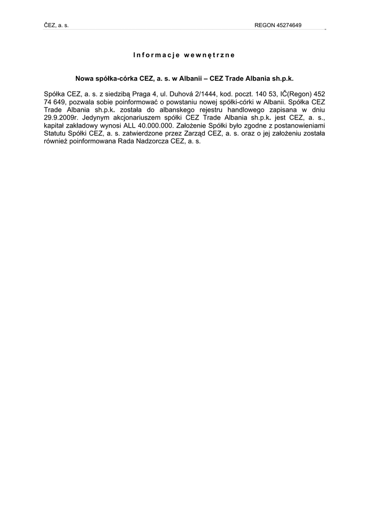 ČEZ, a. s. REGON 45274649 Informacje wewnętrzne Nowa spółka-córka CEZ, a. s. w Albanii – CEZ Trade Albania sh.p.k. Spółka CEZ, a. s. z siedzibą Praga 4, ul. Duhová 2/1444, kod. poczt. 140 53, IČ(Regon) 452 74 649, pozwala sobie poinformować o powstaniu nowej spółki-córki w Albanii. Spółka CEZ Trade Albania sh.p.k. została do albanskego rejestru handlowego zapisana w dniu 29.9.2009r. Jedynym akcjonariuszem spółki CEZ Trade Albania sh.p.k. jest CEZ, a. s., kapitał zakładowy wynosi ALL 40.000.000. Założenie Spółki było zgodne z postanowieniami Statutu Spółki CEZ, a. s. zatwierdzone przez Zarząd CEZ, a. s. oraz o jej założeniu została również poinformowana Rada Nadzorcza CEZ, a. s.