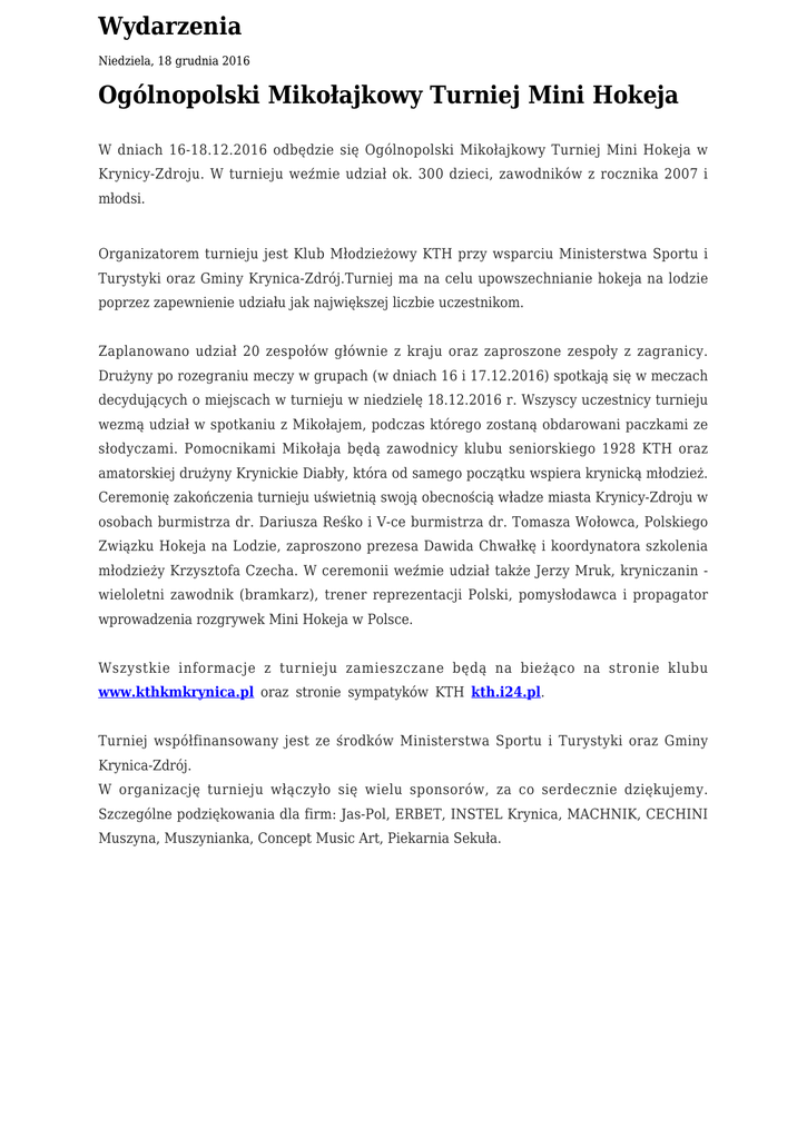 Wydarzenia Niedziela, 18 grudnia 2016 Ogólnopolski Mikołajkowy Turniej Mini Hokeja W dniach 16-18.12.2016 odbędzie się Ogólnopolski Mikołajkowy Turniej Mini Hokeja w Krynicy-Zdroju. W turnieju weźmie udział ok. 300 dzieci, zawodników z rocznika 2007 i młodsi. Organizatorem turnieju jest Klub Młodzieżowy KTH przy wsparciu Ministerstwa Sportu i Turystyki oraz Gminy Krynica-Zdrój.Turniej ma na celu upowszechnianie hokeja na lodzie poprzez zapewnienie udziału jak największej liczbie uczestnikom. Zaplanowano udział 20 zespołów głównie z kraju oraz zaproszone zespoły z zagranicy. Drużyny po rozegraniu meczy w grupach (w dniach 16 i 17.12.2016) spotkają się w meczach decydujących o miejscach w turnieju w niedzielę 18.12.2016 r. Wszyscy uczestnicy turnieju wezmą udział w spotkaniu z Mikołajem, podczas którego zostaną obdarowani paczkami ze słodyczami. Pomocnikami Mikołaja będą zawodnicy klubu seniorskiego 1928 KTH oraz amatorskiej drużyny Krynickie Diabły, która od samego początku wspiera krynicką młodzież. Ceremonię zakończenia turnieju uświetnią swoją obecnością władze miasta Krynicy-Zdroju w osobach burmistrza dr. Dariusza Reśko i V-ce burmistrza dr. Tomasza Wołowca, Polskiego Związku Hokeja na Lodzie, zaproszono prezesa Dawida Chwałkę i koordynatora szkolenia młodzieży Krzysztofa Czecha. W ceremonii weźmie udział także Jerzy Mruk, kryniczanin wieloletni zawodnik (bramkarz), trener reprezentacji Polski, pomysłodawca i propagator wprowadzenia rozgrywek Mini Hokeja w Polsce. Wszystkie informacje z turnieju zamieszczane będą na bieżąco na stronie klubu www.kthkmkrynica.pl oraz stronie sympatyków KTH kth.i24.pl. Turniej współfinansowany jest ze środków Ministerstwa Sportu i Turystyki oraz Gminy Krynica-Zdrój. W organizację turnieju włączyło się wielu sponsorów, za co serdecznie dziękujemy. Szczególne podziękowania dla firm: Jas-Pol, ERBET, INSTEL Krynica, MACHNIK, CECHINI Muszyna, Muszynianka, Concept Music Art, Piekarnia Sekuła.