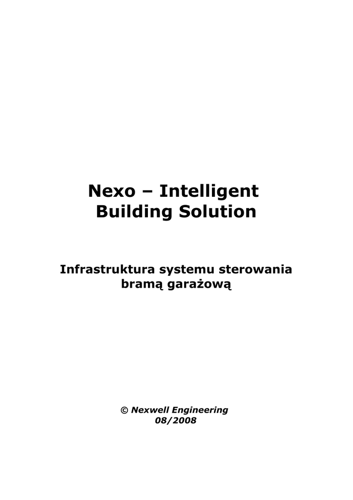 Nexo – Intelligent Building Solution Infrastruktura systemu sterowania bramą garażową © Nexwell Engineering 08/2008 Copyright Nexwell Engineering 2008 Wszelkie prawa zastrzeżone. Autor dołożył wszelkich starań, aby informacje zawarte w dokumencie były aktualne i rzetelne, jednak nie może ponosić odpowiedzialności za nieprawidłowe wykorzystanie niniejszej instrukcji, w tym za zniszczenie bądź uszkodzenie sprzętu. Wykorzystywanie treści dokumentu w innych publikacjach bez zgody autora jest zabronione. Aktualną wersje instrukcji można pobrać ze strony internetowej www.nexwell.eu Spis treści 1. Wstęp.....................................................................................4 2. Struktura połączeń...................................................................5 Wersja dokumentu.......................................................................7 Infrastruktura systemu sterowania bramą garażową Strona 3 1. Wstęp Dokument ten prezentuje sposób budowy elektrycznej dla systemu sterowania bramą garażową. Strona 4 infrastruktury Infrastruktura systemu sterowania bramą garażową 2. Struktura połączeń Aby móc sterować bramą garażową należy zapewnić połączenie pomiędzy centralą systemu Nexo, a siłownikiem bramy garażowej. Połączenie to zapewnia przewód instalatorski YTDY 4 x 0,5 mm. Połączenie takie prezentuje rysunek poniżej. Rys. 1 Schemat połączenia centrali systemu Nexo z siłownikiem bramy garażowej. Przewód YTDY 4 x 0,5 mm należy podłączyć w zaciski siłownika bramowego, odpowiedzialne za sterowanie ze stacyjki. Infrastruktura systemu sterowania bramą garażową Strona 5 Rys. 2 Zaciski odpowiadające za sterowanie siłownikiem ze stacyjki. Zasada działania wejścia stacyjki jest następująca: Impuls (zwarcie/rozwarcie) Akcja Góra STOP Dół STOP Dzięki takiemu połączeniu, możliwe staje się kontrolowanie bramy wjazdowej z punktu widzenia całego systemu Nexo. Do sterowania bramą możemy użyć ikony na pulpicie, pilota bądź harmonogramu zadań. W przypadku sterowania z poziomu ekranu dotykowego, daną ikonę możemy zabezpieczyć hasłem lub wyświetlić tylko na określonym ekranie. Istnieje możliwość ustawienia zależności logicznych pomiędzy bramą wjazdową a innymi akcjami generowanymi w systemie. W takim przypadku niezbędna jest instalacja kontaktronu bramowego determinującego aktualny stan położenia drzwi bramy. Strona 6 Infrastruktura systemu sterowania bramą garażową Wersja dokumentu Wersja Data modyfikacji Zmiany w dokumencie 1.00 19.09.2008 Wersja bazowa Infrastruktura systemu sterowania bramą garażową Strona 7