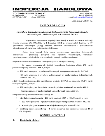 ---------------------------------------------------------------------------------------------------------------------WOJEWÓDZKI INSPEKTORAT ul. Gdańska 38 90-730 Łódź NIP 727-11-49-261 Regon 000136886 tel. 42 636-03-57 fax 42 636-85-50 e-mail: [email protected] Łódź, dnia 24.04.2014 r. INFORMACJA z wyników kontroli prawidłowości funkcjonowania firmowych sklepów cukierniczych i piekarniczych w I kwartale 2014 r. Wojewódzki Inspektorat Inspekcji Handlowej w Łodzi w ramach realizacji tematu własnego ŻG.042.2.2014 w I kwartale 2014 r. przeprowadził kontrole w 19 placówkach handlowych (sklepy firmowe zakładów cukierniczych i piekarniczych) zlokalizowanych na terenie województwa łódzkiego. Celem tych kontroli była ocena przestrzegania przepisów dotyczących znakowania i prezentacji pieczywa oraz wyrobów cukierniczych, warunków przechowywania tych środków oraz rzetelności obsługi i uwidaczniania cen. Nieprawidłowości stwierdzono w 19 sklepach (100 % objętych kontrolą), W trakcie prowadzonych działań kontrolnych badaniem objęto 270 partii produktów łącznej wartości 7.360 zł, w tym: 250 partii pieczywa i wyrobów cukierniczych bez opakowań wartości 5.473 zł; 20 partii pieczywa i wyrobów cukierniczych w opakowaniach jednostkowych wartości 1.887 zł , z których zakwestionowano 236 partii łącznej wartości 4.957 zł (co stanowiło 87,4 % partii badanych ogółem), w tym: 232 partie pieczywa i wyrobów cukierniczych bez opakowań wartości 4.932 zł; 4 partie pieczywa w opakowaniach jednostkowych wartości 25 zł . Powyższe towary zakwestionowano z uwagi na: niewłaściwe oznakowanie – 236 partii wartości 4.957 zł ( 93,3% partii) w tym: 232 partie pieczywa i wyrobów cukierniczych bez opakowań wartości 4.932 zł; 4 partie pieczywa w opakowaniach jednostkowych wartości 25 zł; zaniżoną masę jednostkową - 4 partie pieczywa bez opakowań wartości 25 zł (28,6% partii). WYNIKI KONTROLI 1. Rzetelność obsługi 1 Rzetelność obsługi klientów w zakresie prawidłowości wyliczania i pobierania należności badano w 19 placówkach i nieprawidłowości nie stwierdzono. 2. Przestrzeganie przepisów prawa żywnościowego a) Jakość handlową oferowanych do sprzedaży wyrobów i cukierniczych oceniono dla 16 partii wartości 252 zł, w tym dla: 14 partii pieczywa wartości 229 zł; 2 partie wyrobów cukierniczych wartości 23 zł. piekarniczych W trakcie kontroli: oceniono organoleptycznie 2 partie wyrobów cukierniczych łącznej wartości 23 zł, nie stwierdzając wad jakościowych; sprawdzono masy jednostkowe dla 14 partii pieczywa bez opakowań wartości 229 zł. W wyniku dokonania powyższych czynności zakwestionowano, z uwagi na obniżoną masę jednostkową w stosunku do deklaracji, 4 partie pieczywa wartości 25 zł, np. dla: chleba zwykłego deklarowano 550 g, a dla 9 sztuk (na 9 badanych) stwierdzono niedobory w granicach od 43 g do 55 g; bułek kajzerek deklarowano 50 g, a dla 14 sztuk (na 66 badanych) stwierdzono niedobory w granicach od 1g do 5 g. sprawdzono prawidłowość oznakowania 253 partii środków spożywczych wartości 5.520 zł, w tym: 247 partii pieczywa i wyrobów cukierniczych bez opakowań wartości 5.426zł; 6 partii pieczywa w opakowaniach jednostkowych wartości 94 zł; W wyniku dokonanych oględzin zakwestionowano 236 partii wartości 4.957 zł (93,3% ), w tym: 232 partie pieczywa i wyrobów cukierniczych bez opakowań wartości 4.932 zł; 4 partie pieczywa w opakowaniach jednostkowych wartości 25 zł. Produkty bez opakowań zakwestionowano, z uwagi na niepodanie w miejscu sprzedaży: wykazu składników – dla 232 partii pieczywa i wyrobów cukierniczych wartości 4.932 zł w 16 placówkach; nazwy wyrobu – dla 10 partii wyrobów cukierniczych wartości 669 zł w 1 placówce; pełnej nazwy, uwzględniającej rodzaj pieczywa – dla 40 partii pieczywa wartości 225 zł w 5 placówkach; masy jednostkowej – dla 41 partii pieczywa wartości 259 zł w 4 placówkach; informacji o tym, że produkt został wyprodukowany z ciasta głęboko mrożonego – dla 5 partii wyrobów cukierniczych wartości 59 zł w 1 placówce; 2 informacji o obecności w gotowym produkcie składników alergennych – dla 19 partii wyrobów cukierniczych wartości 480 zł w 2 placówkach. Produkty w opakowaniach jednostkowych zakwestionowano z uwagi na: brak nazwy środka spożywczego – dla 2 partii pieczywa wartości 15 zł; podanie niepełnej nazwy pieczywa, bez uwzględnienia rodzaju; brak wykazu składników występujących w środku spożywczym oraz masy jednostkowej – dla 1 partii pieczywa wartości 9 zł; zastosowanie niewłaściwego określenia poprzedzającego termin przydatności do spożycia, tj. „najlepiej spożyć przed” zamiast „należy spożyć do” – dla 3 partii pieczywa wartości 16 zł. Ponadto stwierdzono, że objęte kontrolą 6 partii pieczywa wartości 94 zł w opakowaniach jednostkowych nie zawierały w swoim składzie substancji dodatkowych innych niż dozwolone przepisami prawa. W trakcie kontroli zażądano usunięcia stwierdzonych nieprawidłowości poprzez umieszczenie w miejscu sprzedaży środków spożywczych bez opakowań brakujących oznaczeń. O nieprawidłowościach w oznakowaniu pieczywa w opakowaniach jednostkowych powiadomiono Wojewódzki Inspektorat Jakości Handlowej Artykułów Rolno – Spożywczych w Łodzi. W odpowiedzi na wystąpienia pokontrolne producenci niewłaściwie oznakowanego pieczywa zobowiązali się dostosować oznakowanie swoich wyrobów do wymagań obowiązujących przepisów. b) Identyfikowalność towarów We wszystkich kontrolowanych placówkach przedsiębiorcy posiadali dokumenty umożliwiające zidentyfikowanie osoby, która dostarczyła im środek spożywczy. W badanym zakresie kontrolą objęto 253 partie towarów wartości 5.520 zł. c) Warunki i sposób przechowywania We wszystkich kontrolowanych placówkach sprawdzono warunki i sposób przechowywania i nie s