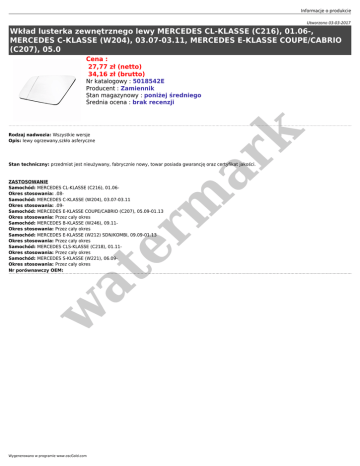 Informacje o produkcie Utworzono 03-03-2017 Wkład lusterka zewnętrznego lewy MERCEDES CL-KLASSE (C216), 01.06-, MERCEDES C-KLASSE (W204), 03.07-03.11, MERCEDES E-KLASSE COUPE/CABRIO (C207), 05.0 Cena : 27,77 zł (netto) 34,16 zł (brutto) Rodzaj nadwozia: Wszystkie wersje Opis: lewy ogrzewany,szkło asferyczne er m ar k Nr katalogowy : 5018542E Producent : Zamiennik Stan magazynowy : poniżej średniego Średnia ocena : brak recenzji Stan techniczny: przedmiot jest nieużywany, fabrycznie nowy, towar posiada gwarancję oraz certyfikat jakości. w at ZASTOSOWANIE Samochód: MERCEDES CL-KLASSE (C216), 01.06Okres stosowania: .08Samochód: MERCEDES C-KLASSE (W204), 03.07-03.11 Okres stosowania: .09Samochód: MERCEDES E-KLASSE COUPE/CABRIO (C207), 05.09-01.13 Okres stosowania: Przez cały okres Samochód: MERCEDES B-KLASSE (W246), 09.11Okres stosowania: Przez cały okres Samochód: MERCEDES E-KLASSE (W212) SDN/KOMBI, 09.09-01.13 Okres stosowania: Przez cały okres Samochód: MERCEDES CLS-KLASSE (C218), 01.11Okres stosowania: Przez cały okres Samochód: MERCEDES S-KLASSE (W221), 06.09Okres stosowania: Przez cały okres Nr porównawczy OEM: Wygenerowano w programie www.oscGold.com