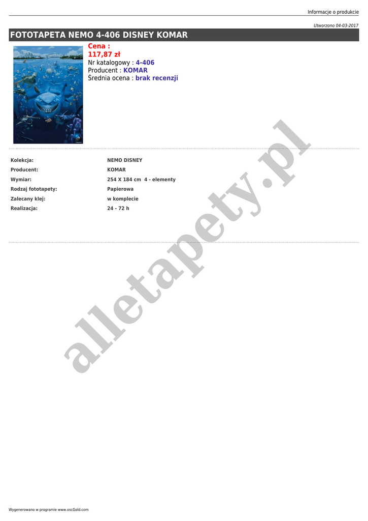 Informacje o produkcie Utworzono 04-03-2017 FOTOTAPETA NEMO 4-406 DISNEY KOMAR Cena : 117,87 zł Producent: KOMAR Wymiar: 254 X 184 cm 4 - elementy Rodzaj fototapety: Papierowa Zalecany klej: w komplecie Realizacja: 24 - 72 h ty NEMO DISNEY al le ta pe Kolekcja: .p l Nr katalogowy : 4-406 Producent : KOMAR Średnia ocena : brak recenzji Wygenerowano w programie www.oscGold.com