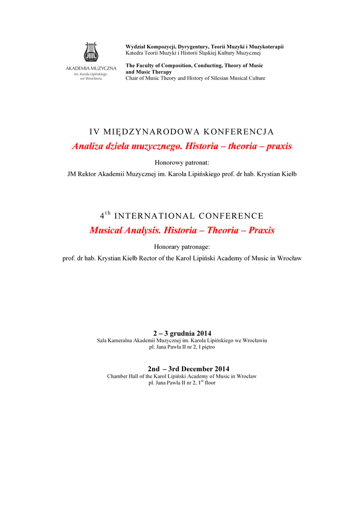 Wydział Kompozycji, Dyrygentury, Teorii Muzyki i Muzykoterapii Katedra Teorii Muzyki i Historii Śląskiej Kultury Muzycznej The Faculty of Composition, Conducting, Theory of Music and Music Therapy Chair of Music Theory and History of Silesian Musical Culture IV MIĘDZYNARODOWA KONFERENCJA Analiza dzieła muzycznego. Historia – theoria – praxis Honorowy patronat: JM Rektor Akademii Muzycznej im. Karola Lipińskiego prof. dr hab. Krystian Kiełb 4th INTERNATIONAL CONFERENCE Musical Analysis. Historia – Theoria – Praxis Honorary patronage: prof. dr hab. Krystian Kiełb Rector of the Karol Lipiński Academy of Music in Wrocław 2 – 3 grudnia 2014 Sala Kameralna Akademii Muzycznej im. Karola Lipińskiego we Wrocławiu pl. Jana Pawła II nr 2, I piętro 2nd – 3rd December 2014 Chamber Hall of the Karol Lipiński Academy of Music in Wrocław pl. Jana Pawła II nr 2, 1st floor 2 Kierownictwo naukowe i organizacyjne Scholarly and Organisational Supervision prof. dr hab. Anna Granat-Janki Organizacja konferencji / Conference Organisers dr Aleksandra Pijarowska dr Tomasz Kienik mgr Dorota Kanafa mgr Izabella Paradowska oraz Biuro Promocji i Organizacji Imprez / Office for Promotion and Events Studio Technik Multimedialnych Akademii Muzycznej im. Karola Lipińskiego we Wrocławiu Multimedia Techniques Studio of the Karol Lipiński Academy of Music in Wrocław Organizacja koncertów / Concerts Organisers dr hab. Robert Kurdybacha oraz Studio Kompozycji Komputerowej / The Computer Composition Studio Kierownik / The Head: prof. Stanisław Krupowicz Przygotowanie wystawy / Exhibition Organiser Biblioteka Główna Akademii Muzycznej im. Karola Lipińskiego we Wrocławiu The Main Library of the Karol Lipiński Academy of Music in Wrocław Tłumaczenie / English Translation mgr Ewa Skotnicka 3 Akademia Muzyczna im. Karola Lipińskiego we Wrocławiu 4 PROGRAM / PROGRAMME Wtorek, 2 grudnia 2014 / Tuesday, 2nd December 2014 Sala Kameralna Akademii Muzycznej im. Karola Lipińskiego we Wrocławiu pl. Jana Pawła II nr 2, I piętro Chamber Hall of the Karol Lipiński Academy of Music in Wrocław pl. Jana Pawła II, no. 2, 1st floor 9.30 / 9.30 a.m. Otwarcie konferencji / Opening Address Rektor AM we Wrocławiu – prof. dr hab. Krystian Kiełb 9.45 – 10.30 / 9.45 – 10.30 a.m. Wykład inauguracyjny (Keynote Lecture) Márta Grabócz (Strasburg) Introduction to Theories and Practice of Musical Signification and Narratology [Wprowadzenie do teorii i praktyki znaczenia muzycznego oraz narratologii] 10.30 – 11.15 / 10.30 – 11.15 a.m. Mieczysław Tomaszewski (Kraków) Droga ku pełni. Dzieje muzyki wobec praw tetraktisu. Rekonesans [A Path to Wholeness. The History of Music and the Principle of Tetractys. A Reconnaissance] 11.15 – 11.45 przerwa na kawę / 11.15 – 11.45 a.m. coffee break 11.45 – 13.45 / 11.45 – 1.45 p.m. Prowadzenie / Chair Anna Granat-Janki (Wrocław) Z warsztatu kompozytora / On Composer’s Technique 11.45 – 12.15 / 11.45 – 12.15 p.m. Alicja Gronau-Osińska (Warszawa) Forma znacząca w warsztacie kompozytora współczesnego [Meaningful Form in Workshop of Contemporary Composer] Metodologia, perspektywy badawcze / Methodology, Research Perspectives 12.15 – 12.45 / 12.15 – 12.45 p.m. Jacek Szerszenowicz (Łódź) Problemy metodologiczne analizy przedmiotu czysto intencjonalnego [The Methodological Problems of the Analysis of a Piece of Music Regarded as an ‘Intentional Object’] 5 12.45 – 13.15 / 12.45 – 1.15 p.m. Kinga Kiwała (Kraków) Utwór muzyczny i fenomenologia. „Corale, interludio e aria” Eugeniusza Knapika w perspektywie koncepcji Romana Ingardena [A Work of Music and Phenomenology. Corale, interludio e aria by Eugeniusz Knapik from the Perspective of Roman Ingarden’s Theory] 13.15 – 13.45 / 1.15 – 1.45 p.m. Marta Dziewanowska-Pachowska (Warszawa) Dzieło otwarte w perspektywie reistycznej – instalacje dźwiękowe Krzysztofa Knittla [An Open Work of Art from a Reistic Perspective – Sound Installations by Krzysztof Knittel] 13.45 – 15.00 przerwa obiadowa / 1.45 – 3.00 p.m. lunch break 15.00 – 16.30 / 3.00 – 4.30 p.m Prowadzenie / Chair Anna Nowak (Bydgoszcz) 15.00 – 15.30 / 3.00 – 3.30 p.m. Iwona Hanna Świdnicka (Warszawa) Preludium As-dur op. 28 nr 17 Fryderyka Chopina – od inspiracji po rezonans [Prelude in A flat major, Op. 28 No. 17 by Fryderyk Chopin – from Inspiration to Resonance] 15.30 – 16.00 / 3.30 – 4.00 p.m. Janina Tatarska (Poznań) Idea różnorodności w jedności i jej muzyczne konkretyzacje [The Idea of Diversity in Unity Reflected in Music] 16.00 – 16.30 / 4.00 – 4.30 p.m. Andrzej Tuchowski (Zielona Góra, Wrocław) Beethoven-Chopin-Rachmaninow: semantyka tonacji c-moll w świetle tradycji romantycznej [Beethoven – Chopin – Rachmaninoff: the Semantic Meaning of the C-minor Key in the Context of Romantic Tradition] 16.30 – 17.00 przerwa na kawę / 4.30 – 5.00 p.m. coffee break Genologia / Genology 17.00 – 18.30 / 5.00 – 6.30 p.m. Prowadzenie / Chair Alicja Gronau-Osińska (Warszawa) 17.00 – 17.30 / 5.00 – 5.30 p.m. Catherine Doulova (Mińsk) Problems of Theatrical Music Shaping: Textology Observations [Problemy kształtowania muzyki scenicznej: spostrzeżenia tekstologiczne] 6 17.30 – 18.00 / 5.30 – 6.00 p.m Anna Nowak (Bydgoszcz) Mazurek fortepianowy – tradycja gatunku a dwudziestowieczna twórczość muzyczna [Piano Mazurka – Tradition of the Genre and the 20th-Century Musical Output] 18.00 – 18.30 / 6.00 – 6.30 p.m. Aleksandra Pijarowska (Wrocław) „02/03” na recorder, fortepian, dwoje skrzypiec, altówkę i wiolonczelę Katarzyny Dziewiątkowskiej-Mleczko a problematyka gatunku [‘02/03’ for Recorder, Piano, Two Violins, Viola and Cello by Katarzyna Dziewiątkowska-Mleczko and the Issue of Its Musical Genre] 20.00 / 8.00 p.m. Koncert / Concert Koncert akustyczny: Sound Factory Orchestra pod dyrekcją dra hab. Roberta Kurdybachy Acoustic Concert: Sound Fac