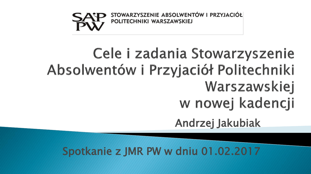 Andrzej Jakubiak Spotkanie z JMR PW w dniu 01.02.2017 Zarząd SAiP PW wybrany na kadencję 2016-2021: Prezes: Andrzej Jakubiak, Wiceprezes: Jolanta Hibner, Sekretarz: Tomasz Piłka, Skarbnik: Paweł Zając, Członkowie: Jerzy Baranowski, Tadeusz Namedyński, Krzysztof Sobków, Adam Zaborowski. Sąd Koleżeński: Jerzy Majcher – przewodniczący Janusz Drużycki Zdzisław Firlej Komisja Rewizyjna: Apoloniusz Dobrzycki - przewodniczący Aurelia Konopacka Piotr Kroenke STATUTOWY CEL DZIAŁALNOŚCI: „Propagowanie osiągnięć Politechniki Warszawskiej i dokonań jej Absolwentów, wspieranie wysiłków Władz Uczelni na rzecz jej rozwoju oraz integracja środowiska i tworzenie więzów koleżeńskich pomiędzy Absolwentami i Przyjaciółmi Politechniki Warszawskiej.” CELE I ZADANIA W NOWEJ KADENCJI: Integracja środowiska poprzez współpracę ze stowarzyszeniami wydziałowymi oraz z absolwentami z zagranicy. Aktualizacja i prowadzenie bazy danych o absolwentach. Propagacja informacji o uczelni: wydarzenia, inicjatywy, sukcesy, historia, tradycja, itp. Angażowanie absolwentów w sprawy i potrzeby uczelni. Organizacja cyklicznych spotkań z absolwentami – kontynuacja dotychczasowych oraz stworzenie nowych, tematycznych. Podniesienie rangi Złotej Księgi Absolwenta. Współpraca z Fundacją Politechniki Warszawskiej. Współpraca z Biurem Promocji PW, Biurem Karier PW, organizacjami studenckimi i zespołami artystycznymi PW. Uruchomienie stałej działalności Klubu Absolwenta. Podejmowanie inicjatyw dotyczących bezpośredniej pomocy absolwentów dla uczelni. ZADANIOWY SYSTEM DZIAŁALNOŚCI 1. Zespoły robocze: - ds. Integracji, - ds. Centrum Kultury i Sztuki PW, - ds. Centrum Sportu PW. 2. Pełnomocnicy Zarządu: ds. Historii i Tradycji – Kazimierz Mart ds. Kontaktów Środowiskowych i Biznesowych – - Jerzy Szewczyk ds. Działalności Klubu - ... Zespół ds. Integracji: Jolanta Hibner (koordynator) Jerzy Baranowski Tadeusz Namedyński Paweł Zając Zespół ds. Centrum Kultury i Sztuki PW: Andrzej Jakubiak (koordynator) Jerzy Baranowski Janusz Chojecki Waldemar Dąbrowski Maciej Gierej Dariusz Łapiński Wiesław Pękala Tadeusz Węgrzynowski Krzysztof Wilczyński Adam Zaborowski Ryszard Zając Zespół ds. Centrum Sportu PW: Krzysztof Perlicki (koordynator) Jolanta Dolecka Jolanta Hibner Andrzej Kocańda Jerzy Szewczyk DZIAŁANIA PODJĘTE: Organizacja Dnia Absolwenta w ramach obchodów Dnia Politechniki Warszawskiej 2016 (Konferencja pt. Październik 1956 na PW, apel poległych Pracowników i Studentów PW w wojnie 1920r., gala Złotej Księgi Absolwenta). Powołanie grup zadaniowych i pełnomocników. Podjęcie prac koncepcyjnych Centrum Kultury i Sztuki PW. Reorganizacja systemu informacji i promocji. Spotkanie integracyjne z organizacjami wydziałowymi. DZIAŁANIA PODJĘTE c.d. Utworzenie Portalu Absolwenta (we współpracy z Biurem Promocji i Informacji PW). Przygotowania do uruchomienia Salonów Tematycznych Klubu Absolwenta PW (Muzyczny, Historyczny, Dyskusyjny, Sportowy). Aktualizacja listy Członków SAiP PW. - - PILNE ZADANIA DO PODJĘCIA: Reorganizacja systemu finansowego. Unormowanie zasad korzystania z lokali PW. Uzupełnienie składu Zarządu. Zmiany w Statucie. Adaptacja pomieszczeń Klubu. Aktualizacja i prowadzenie bazy danych. - - BARIERY I TRUDNOŚCI: Sprzeczne oczekiwania. Dostęp do bazy danych. Przemiany pokoleniowe. Finansowanie działalności. ... ale damy radę !