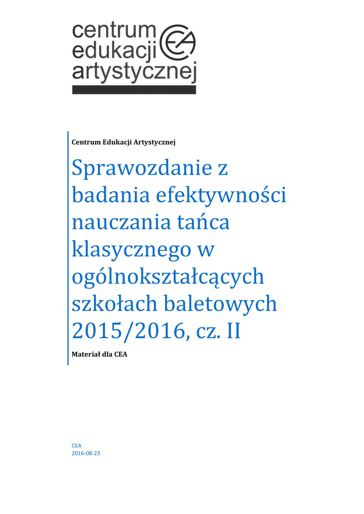 Centrum Edukacji Artystycznej Sprawozdanie z badania efektywności nauczania tańca klasycznego w ogólnokształcących szkołach baletowych 2015/2016, cz. II Materiał dla CEA CEA 2016-08-23 0 Sprawozdanie z badania efektywności nauczania tańca klasycznego w ogólnokształcących szkołach baletowych 2015/2016, cz. II SPIS TREŚCI CHARAKTERYSTYKA BADANIA ................................................................................................................................. 2 ANALIZA KART OBSERWACJI EGZAMINU ................................................................................................................ 4 POPRAWNOŚĆ METODYCZNA I MERYTORYCZNA LEKCJI ................................................................................ 4 OMÓWIENIE WYKONANIA UCZNIÓW I UCZENNIC oraz STOPIEŃ REALIZACJI ZALECEŃ Z POPRZEDNIEJ OBSERWACJI.................................................................................................................................................... 5 ANALIZA ZALECEŃ MERYTORYCZNYCH ................................................................................................................... 5 ANALIZA OCENIANIA ............................................................................................................................................... 6 WNIOSKI .................................................................................................................................................................. 7 SKUTECZNOŚĆ NAUCZANIA ................................................................................................................................. 7 OCZEKIWANIA NAUCZYCIELI ............................................................................................................................... 8 UCZNIOWIE SZCZEGÓLNIE UZDOLNIENI ............................................................................................................. 8 ŁĄCZENIE KLAS i PRZYDZIAŁ PEDAGOGÓW ......................................................................................................... 8 PLAN NAPRAWCZY .................................................................................................................................................. 9 1. CELE KSZTAŁCENIA ..................................................................................................................................... 9 2. WARSZTATY METODYCZNE ........................................................................................................................ 9 3. NADZÓR PEDAGOGICZNY ......................................................................................................................... 10 PODSUMOWANIE .................................................................................................................................................. 10 ZAŁĄCZNIK NR 1: Wykaz egzaminów promocyjnych i dyplomowych ................................................................ 1 ZAŁĄCZNIK NR 2: Zestawienie ocen wystawionych przez obserwatorów oraz szkolne komisje egzaminacyjne uczniom biorącym udział w lekcjach obserwowanych w trybie egzaminu promocyjnego ................................. 1 1 Sprawozdanie z badania efektywności nauczania tańca klasycznego w ogólnokształcących szkołach baletowych 2015/2016, cz. II Centrum Edukacji Artystycznej w roku szkolnym 2015/2016 po raz pierwszy przeprowadziło badanie efektywności nauczania tańca klasycznego w ogólnokształcących szkołach baletowych. Badanie miało miejsce jesienią 2015 roku i dostarczyło cennych spostrzeżeń, które zostały opisane w odpowiednim sprawozdaniu, jednak po analizie zgromadzonego materiału zdecydowano o jego kontynuacji. Kontynuację badania przeprowadzono w drugim okresie roku szkolnego w celu oceny efektów nauczania tańca klasycznego na podstawie egzaminu promocyjnego, wskazania zagadnień metodycznych wymagających wsparcia systemowego, jak również analizy sposobu oceniania. CHARAKTERYSTYKA BADANIA Drugą część badania efektywności nauczania tańca klasycznego przeprowadzili konsultanci Centrum Edukacji Artystycznej w niezmienionym w stosunku do poprzedniej edycji składzie: Wacław Gaworczyk, Liliana Kowalska, Teresa Memches i dr Barbara Sier-Janik. Konsultanci dokonali obserwacji egzaminów promocyjnych, a następnie przeprowadzili ich analizę od strony merytorycznej i metodycznej. Ponadto zostali zobowiązani do ocenienia umiejętności uczniów biorących udział w egzaminach. Lekcje do ponownej obserwacji wytypowano spośród grupy zajęć omawianych w pierwszej części badania i prowadzonych w klasach II, V oraz VIII ogólnokształcących szkół baletowych. Zadaniem konsultantów było sprawdzenie stopnia realizacji przez nauczycieli zaleceń metodycznych sformułowanych po poprzedniej obserwacji, jak również poziomu wzrostu umiejętności uczniów poprzez porównanie prezentacji dwóch lekcji – egzaminacyjnej z końca roku szkolnego i bieżącej z jego początku. Ocenie poddano jedenaście lekcji tańca klasycznego, spośród których dziesięć stanowiło egzamin promocyjny, bądź ze względu na udział w nim klasy IX – egzamin dyplomowy. Jedna z obserwowanych lekcji, z powodów organizacyjnych, nie została zaprezentowana konsultantowi w warunkach egzaminu. Szczegółowy wykaz monitorowanych lekcji znajduje się w załączniku nr 1. 2 Sprawozdanie z badania efektywności nauczania tańca klasycznego w ogólnokształcących szkołach baletowych 2015/2016, cz. II Konsultanci obserwowali wyznaczone egzaminy w okresie od marca do czerwca 2016 roku według poniższego harmonogramu: Nazwa szkoły Termin pobytu konsultantów Liczba obserwowanych lekcji Ogólnokształcąca Szkoła Baletowa im. Romana Turczynowicza w Warszawie 7 marca 2016, 15 kwietnia 2016 3 Ogólnokształcąca Szkoła Baletowa im. Janiny Jarzynówny-Sobczak w Gdańsku 23 maja 2016, 9 czerwca 2016 2 Ogólnokształcąca Szko