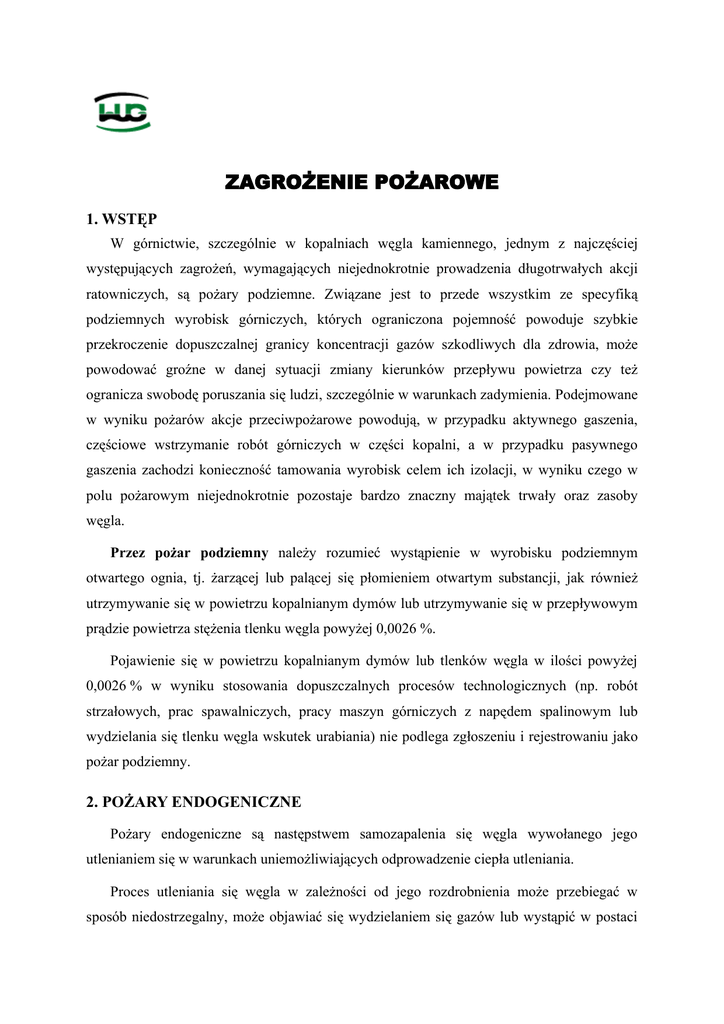 ZAGROŻENIE POŻAROWE 1. WSTĘP W górnictwie, szczególnie w kopalniach węgla kamiennego, jednym z najczęściej występujących zagrożeń, wymagających niejednokrotnie prowadzenia długotrwałych akcji ratowniczych, są pożary podziemne. Związane jest to przede wszystkim ze specyfiką podziemnych wyrobisk górniczych, których ograniczona pojemność powoduje szybkie przekroczenie dopuszczalnej granicy koncentracji gazów szkodliwych dla zdrowia, może powodować groźne w danej sytuacji zmiany kierunków przepływu powietrza czy też ogranicza swobodę poruszania się ludzi, szczególnie w warunkach zadymienia. Podejmowane w wyniku pożarów akcje przeciwpożarowe powodują, w przypadku aktywnego gaszenia, częściowe wstrzymanie robót górniczych w części kopalni, a w przypadku pasywnego gaszenia zachodzi konieczność tamowania wyrobisk celem ich izolacji, w wyniku czego w polu pożarowym niejednokrotnie pozostaje bardzo znaczny majątek trwały oraz zasoby węgla. Przez pożar podziemny należy rozumieć wystąpienie w wyrobisku podziemnym otwartego ognia, tj. żarzącej lub palącej się płomieniem otwartym substancji, jak również utrzymywanie się w powietrzu kopalnianym dymów lub utrzymywanie się w przepływowym prądzie powietrza stężenia tlenku węgla powyżej 0,0026 %. Pojawienie się w powietrzu kopalnianym dymów lub tlenków węgla w ilości powyżej 0,0026 % w wyniku stosowania dopuszczalnych procesów technologicznych (np. robót strzałowych, prac spawalniczych, pracy maszyn górniczych z napędem spalinowym lub wydzielania się tlenku węgla wskutek urabiania) nie podlega zgłoszeniu i rejestrowaniu jako pożar podziemny. 2. POŻARY ENDOGENICZNE Pożary endogeniczne są następstwem samozapalenia się węgla wywołanego jego utlenianiem się w warunkach uniemożliwiających odprowadzenie ciepła utleniania. Proces utleniania się węgla w zależności od jego rozdrobnienia może przebiegać w sposób niedostrzegalny, może objawiać się wydzielaniem się gazów lub wystąpić w postaci otwartego ognia. Na intensywność utleniania się węgla mają głównie wpływ następujące czynniki: stopień rozdrobnienia węgla, zawartość w węglu wilgoci higroskopijnej, węgla pierwiastkowego i substancji mineralnych. Rozkruszenie węgla sprzyja jego samozapaleniu się. Im większa jest bowiem powierzchnia węgla stykającego się z powietrzem, tym szybciej przebiega proces utleniania się i tym szybciej będzie się on rozszerzał. Ponadto węgiel pokruszony ma niższą temperaturę zapłonu i wskutek tego łatwiej może dojść do jego samozapalenia się. Nie bez znaczenia dla samozapalności węgla jest jego skład petrograficzny. Pokłady węgla, w których występują w znacznej ilości składniki kruche, jak np. fuzyt i klaryt, łatwiej ulegają pokruszeniu, a w następstwie tego samozapaleniu. Istotny wpływ na samozapalność węgla mają również zawartość wilgoci higroskopijnej i węgla pierwiastkowego. Wilgoć higroskopijna jest w tym przypadku czynnikiem ujemnym i w miarę wzrostu jej zawartości w węglu wzrasta jego samozapalność. Im zaś bardziej uwęglony jest węgiel, to znaczy im wyższą odznacza się on zawartością węgla pierwiastkowego, tym jego samozapalność jest mniejsza. Samozapalność węgla zależy również od zawartości w nim popiołu. Stwierdzono, że substancja mineralna obniża samozapalność węgla w przybliżeniu proporcjonalnie do zawartości. W powstawaniu pożarów endogenicznych ważną rolę odgrywa również system robót przygotowawczych i udostępniających oraz koncentracja wydobycia. W związku z tym w pokładach skłonnych do samozapalenia powinno się prowadzić roboty przygotowawcze w postaci chodników pojedynczych, a nie podwójnych. Filary oporowe między podwójnym chodnikiem ulegają bowiem zazwyczaj popękaniu, a powietrze przepływając przez te szczeliny z chodnika ze świeżym powietrzem do chodnika z powietrzem zużytym może doprowadzać do samozapalenia się węgla. Jeśli chodzi o systemy wybierania, to ze względu na zapobieganie samozapaleniu się węgla korzystniejsze są systemy umożliwiające czyste wybieranie pokładów. Przy 2 ścianowym wybieraniu grubych pokładów warstwami i z zastosowaniem podsadzki hydraulicznej o możliwości powstawania pożarów endogenicznych decyduje w dużej mierze dokładność podsadzania. Koncentracja wydobycia, wpływająca na szybsze wybranie określonych partii pokładu węgla jest również czynnikiem obniżającym możliwość powstawania pożarów endogenicznych. Oznaczenie wskaźnika samozapalności węgla (zmodyfikowana metoda Olpińskiego) i obliczenie wskaźnika aktywacji wykonuje się według ustaleń ujętych w normie PN-93/G04558, natomiast próbki węgla do badań samozapalności pobiera się na zasadach określonych normą PN-G-04039. Jak można zauważyć na rys. 1. w latach 1947-1960 ilość pożarów endogenicznych i egzogenicznych w podziemnych kopalniach węgla kamiennego była bardzo duża; w latach pięćdziesiątych nawet ok. 600 pożarów w ciągu roku. Następnie można zaobserwować znaczny sukcesywny spadek ilości pożarów np. z ok. 300 pożarów w roku 1960 do ok. 30 w roku 1970. W okresie ostatnich 10 lat ich ilość nie przekroczyła 7 w ciągu roku, osiągając w roku 2001 wartość minimalną, tj. jeden pożar. W okresie ostatnich 10 i 5 lat w skali roku notowano średnio ok. czterech pożarów. Rys. 1. Ilość pożarów w latach 1947 - 2005 700 600 Ilość pożarów 500 400 300 200 100 0 1940 1950 1960 1970 1980 1990 2000 Rok Pożary razem Pożary endogeniczne 3 Pożary egzogeniczne 2010 3. WYPADKI ŚMIERTELNE W WYNIKU POŻARÓW W tabeli 1. ujęto pożary endogeniczne i egzogeniczne oraz wypadki śmiertelne zaistniałe w ich wyniku we wszystkich podziemnych zakładach górniczych w latach 1996-2005. Natomiast w tabeli 2. przedstawiono ilości zaistniałych pożarów w interwale ostatnich 10 lat, a na rys. 2. zależn