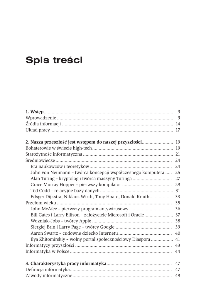 Spis treści 1. Wstęp.................................................................................................... 9 Wprowadzenie.......................................................................................... 9 Źródła informacji...................................................................................... 14 Układ pracy............................................................................................... 17 2. Nasza przeszłość jest wstępem do naszej przyszłości........................ 19 Bohaterowie w świecie high-tech............................................................... 19 Starożytność informatyczna...................................................................... 21 Średniowiecze.......................................................................................... 24 Era naukowców i teoretyków................................................................ 24 John von Neumann – twórca koncepcji współczesnego komputera...... 25 Alan Turing – kryptolog i twórca maszyny Turinga............................... 27 Grace Murray Hopper – pierwszy kompilator....................................... 29 Ted Codd – relacyjne bazy danych......................................................... 31 Edsger Dijkstra, Niklaus Wirth, Tony Hoare, Donald Knuth.................. 33 Przełom wieku......................................................................................... 35 John McAfee – pierwszy program antywirusowy.................................. 36 Bill Gates i Larry Ellison – założyciele Microsoft i Oracle....................... 37 Wozniak–Jobs – twórcy Apple.............................................................. 38 Siergiej Brin i Larry Page – twórcy Google............................................ 39 Aaron Swartz – cudowne dziecko Internetu.......................................... 40 Ilya Zhitomirskiy – wolny portal społecznościowy Diaspora.................. 41 Informatycy przyszłości........................................................................... 43 Informatyka w Polsce............................................................................... 44 3. Charakterystyka pracy informatyka................................................... 47 Definicja informatyka............................................................................... 47 Zawody informatyczne............................................................................. 49 Informatycy 6 Czy informatycy powinni dużo zarabiać?................................................. 54 Informatycy są współczesnymi profesjonalistami, jak lekarze czy prawnicy............................................................................................ 56 Kodeks postępowania zawodowego.......................................................... 59 Myślenie algorytmiczne........................................................................... 62 4. Stereotypowy geek.............................................................................. 66 Waga stereotypów.................................................................................... 66 Wygląd informatyka................................................................................. 68 Programista – melancholijny introwertyk................................................. 72 Wczesne sukcesy i późne porażki............................................................. 75 Geek i pieniądze....................................................................................... 80 Dążenie do doskonałości, merytokracja i rywalizacja............................... 83 Dążenie do doskonałości...................................................................... 83 Rywalizacja.......................................................................................... 85 Merytokracja........................................................................................ 86 Merytokracja – problemy z przywództwem.......................................... 87 5. Stereotypy w organizacji pracy informatyków.................................... 91 Niechęć do współpracy w grupie............................................................... 91 Informatycy są jak dzieci – zabawa w informatykę i inne zabawy............. 97 Zaangażowanie....................................................................................... 100 Asertywność, brak szacunku i zaufania................................................... 104 Kultura informatyków (geeków).............................................................. 110 Zarządzanie za pomocą stereotypów....................................................... 113 6. Biologiczne uwarunkowania bycia informatykiem.......................... 117 Co to jest spektrum autystyczne?............................................................ 117 Czy informatycy są ze spektrum autystycznego?..................................... 122 Autystyczna różnica................................................................................ 126 Kobiety w informatyce............................................................................ 129 Informatyka nie przyciąga kobiet........................................................ 129 Dylemat różnego postrzegania............................................................ 131 Atmosfera „męskiej szatni”.................................................................. 135 Kobiety się nie nadają.......................................................................... 140 7. Skazani na stres.................................................................................. 149 Stres w pracy........................................................................................... 149 Stres – wysokie wymagania i brak panowania nad pracą.......................... 152 Stres – informatyk wessany przez maszynę...........................................