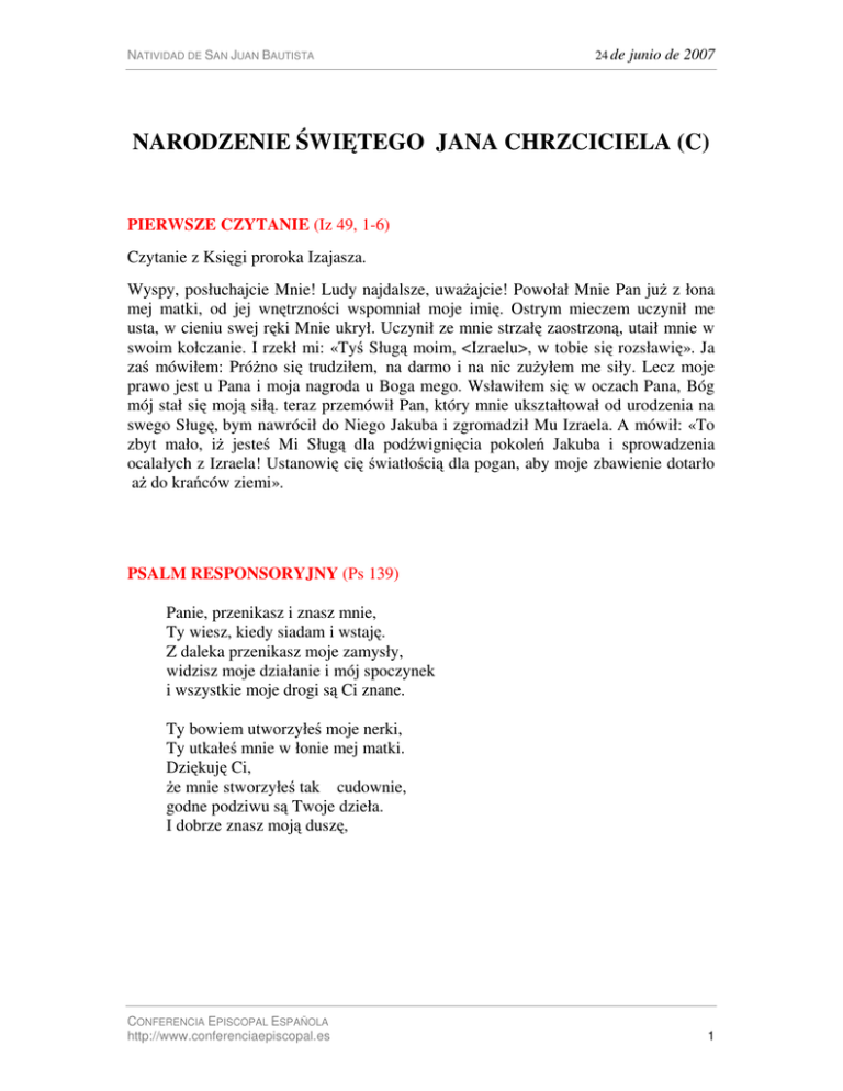 NATIVIDAD DE SAN JUAN BAUTISTA 24 de junio de 2007 NARODZENIE ŚWIĘTEGO JANA CHRZCICIELA (C) PIERWSZE CZYTANIE (Iz 49, 1-6) Czytanie z Księgi proroka Izajasza. Wyspy, posłuchajcie Mnie! Ludy najdalsze, uważajcie! Powołał Mnie Pan już z łona mej matki, od jej wnętrzności wspomniał moje imię. Ostrym mieczem uczynił me usta, w cieniu swej ręki Mnie ukrył. Uczynił ze mnie strzałę zaostrzoną, utaił mnie w swoim kołczanie. I rzekł mi: «Tyś Sługą moim, <Izraelu>, w tobie się rozsławię». Ja zaś mówiłem: Próżno się trudziłem, na darmo i na nic zużyłem me siły. Lecz moje prawo jest u Pana i moja nagroda u Boga mego. Wsławiłem się w oczach Pana, Bóg mój stał się moją siłą. teraz przemówił Pan, który mnie ukształtował od urodzenia na swego Sługę, bym nawrócił do Niego Jakuba i zgromadził Mu Izraela. A mówił: «To zbyt mało, iż jesteś Mi Sługą dla podźwignięcia pokoleń Jakuba i sprowadzenia ocalałych z Izraela! Ustanowię cię światłością dla pogan, aby moje zbawienie dotarło aż do krańców ziemi». PSALM RESPONSORYJNY (Ps 139) Panie, przenikasz i znasz mnie, Ty wiesz, kiedy siadam i wstaję. Z daleka przenikasz moje zamysły, widzisz moje działanie i mój spoczynek i wszystkie moje drogi są Ci znane. Ty bowiem utworzyłeś moje nerki, Ty utkałeś mnie w łonie mej matki. Dziękuję Ci, że mnie stworzyłeś tak cudownie, godne podziwu są Twoje dzieła. I dobrze znasz moją duszę, CONFERENCIA EPISCOPAL ESPAÑOLA http://www.conferenciaepiscopal.es 1 NATIVIDAD DE SAN JUAN BAUTISTA 24 de junio de 2007 DRUGIE CZYTANIE (Dz 13, 22-26) Czytanie z Dziejów Apostolskich. W Synagodze w Antiochii Pizyjskiej Paweł powiedział: Gdy zaś jego odrzucił, powołał na ich króla Dawida, o którym też dał świadectwo w słowach: Znalazłem Dawida, syna Jessego, człowieka po mojej myśli, który we wszystkim wypełni moją wolę. Z jego to potomstwa, stosownie do obietnicy, wyprowadził Bóg Izraelowi Zbawiciela Jezusa. Przed Jego przyjściem Jan głosił chrzest nawrócenia całemu ludowi izraelskiemu. A pod koniec swojej działalności Jan mówił: "Ja nie jestem tym, za kogo mnie uważacie. Po mnie przyjdzie Ten, któremu nie jestem godny rozwiązać sandałów na nogach". Bracia, synowie rodu Abrahama, i ci spośród was, którzy się boją Boga! Nam została przekazana nauka o tym zbawieniu. Oto słowo Boże EWANGELIA (Lk 1, 57-66.80) Słowa Ewangelii według świętego Łukasza. Dla Elżbiety zaś nadszedł czas rozwiązania i urodziła syna. Gdy jej sąsiedzi i krewni usłyszeli, że Pan okazał tak wielkie miłosierdzie nad nią, cieszyli się z nią razem. Ósmego dnia przyszli, aby obrzezać dziecię, i chcieli mu dać imię ojca jego, Zachariasza. Jednakże matka jego odpowiedziała: «Nie, lecz ma otrzymać imię Jan». Odrzekli jej: «Nie ma nikogo w twoim rodzie, kto by nosił to imię». Pytali więc znakami jego ojca, jak by go chciał nazwać. On zażądał tabliczki i napisał: «Jan będzie mu na imię». I wszyscy się dziwili. A natychmiast otworzyły się jego usta, język się rozwiązał i mówił wielbiąc Boga. I padł strach na wszystkich ich sąsiadów. W całej górskiej krainie Judei rozpowiadano o tym wszystkim, co się zdarzyło. A wszyscy, którzy o tym słyszeli, brali to sobie do serca i pytali: «Kimże będzie to dziecię?» Bo istotnie ręka Pańska była z nim. Chłopiec zaś rósł i wzmacniał się duchem, a żył na pustkowiu aż do dnia ukazania się przed Izraelem. Oto słowo Pańskie. CONFERENCIA EPISCOPAL ESPAÑOLA http://www.conferenciaepiscopal.es 2