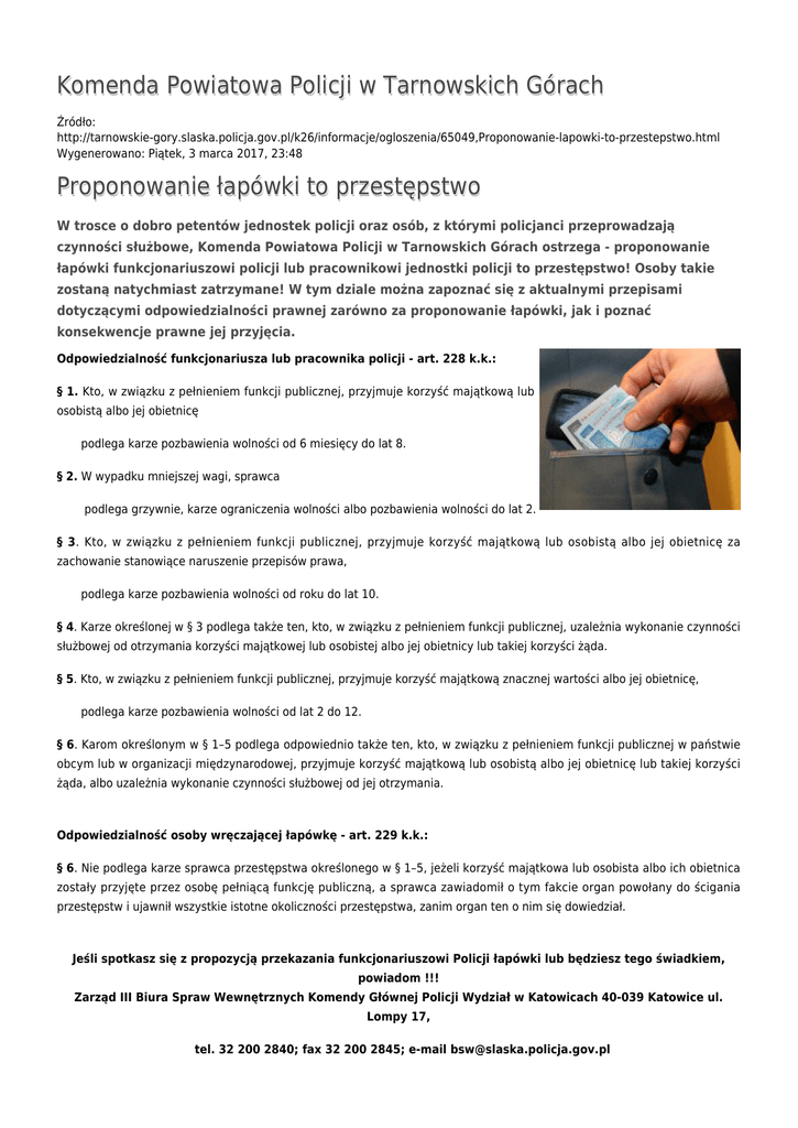 Komenda Powiatowa Policji w Tarnowskich Górach Źródło: http://tarnowskie-gory.slaska.policja.gov.pl/k26/informacje/ogloszenia/65049,Proponowanie-lapowki-to-przestepstwo.html Wygenerowano: Piątek, 3 marca 2017, 23:48 Proponowanie łapówki to przestępstwo W trosce o dobro petentów jednostek policji oraz osób, z którymi policjanci przeprowadzają czynności służbowe, Komenda Powiatowa Policji w Tarnowskich Górach ostrzega - proponowanie łapówki funkcjonariuszowi policji lub pracownikowi jednostki policji to przestępstwo! Osoby takie zostaną natychmiast zatrzymane! W tym dziale można zapoznać się z aktualnymi przepisami dotyczącymi odpowiedzialności prawnej zarówno za proponowanie łapówki, jak i poznać konsekwencje prawne jej przyjęcia. Odpowiedzialność funkcjonariusza lub pracownika policji - art. 228 k.k.: § 1. Kto, w związku z pełnieniem funkcji publicznej, przyjmuje korzyść majątkową lub osobistą albo jej obietnicę podlega karze pozbawienia wolności od 6 miesięcy do lat 8. § 2. W wypadku mniejszej wagi, sprawca podlega grzywnie, karze ograniczenia wolności albo pozbawienia wolności do lat 2. § 3. Kto, w związku z pełnieniem funkcji publicznej, przyjmuje korzyść majątkową lub osobistą albo jej obietnicę za zachowanie stanowiące naruszenie przepisów prawa, podlega karze pozbawienia wolności od roku do lat 10. § 4. Karze określonej w § 3 podlega także ten, kto, w związku z pełnieniem funkcji publicznej, uzależnia wykonanie czynności służbowej od otrzymania korzyści majątkowej lub osobistej albo jej obietnicy lub takiej korzyści żąda. § 5. Kto, w związku z pełnieniem funkcji publicznej, przyjmuje korzyść majątkową znacznej wartości albo jej obietnicę, podlega karze pozbawienia wolności od lat 2 do 12. § 6. Karom określonym w § 1–5 podlega odpowiednio także ten, kto, w związku z pełnieniem funkcji publicznej w państwie obcym lub w organizacji międzynarodowej, przyjmuje korzyść majątkową lub osobistą albo jej obietnicę lub takiej korzyści żąda, albo uzależnia wykonanie czynności służbowej od jej otrzymania. Odpowiedzialność osoby wręczającej łapówkę - art. 229 k.k.: § 6. Nie podlega karze sprawca przestępstwa określonego w § 1–5, jeżeli korzyść majątkowa lub osobista albo ich obietnica zostały przyjęte przez osobę pełniącą funkcję publiczną, a sprawca zawiadomił o tym fakcie organ powołany do ścigania przestępstw i ujawnił wszystkie istotne okoliczności przestępstwa, zanim organ ten o nim się dowiedział. Jeśli spotkasz się z propozycją przekazania funkcjonariuszowi Policji łapówki lub będziesz tego świadkiem, powiadom !!! Zarząd III Biura Spraw Wewnętrznych Komendy Głównej Policji Wydział w Katowicach 40-039 Katowice ul. Lompy 17, tel. 32 200 2840; fax 32 200 2845; e-mail [email protected] Ocena: 0/5 (0) Tweetnij