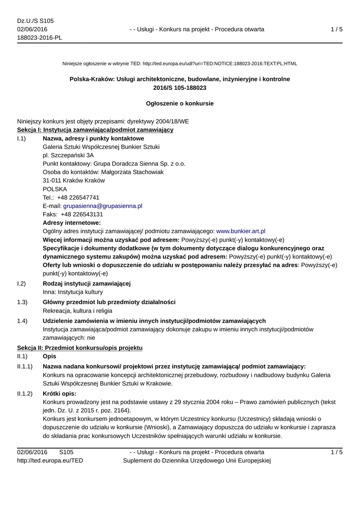 Dz.U./S S105 02/06/2016 188023-2016-PL - - Usługi - Konkurs na projekt - Procedura otwarta 1/5 Niniejsze ogłoszenie w witrynie TED: http://ted.europa.eu/udl?uri=TED:NOTICE:188023-2016:TEXT:PL:HTML Polska-Kraków: Usługi architektoniczne, budowlane, inżynieryjne i kontrolne 2016/S 105-188023 Ogłoszenie o konkursie Niniejszy konkurs jest objęty przepisami: dyrektywy 2004/18/WE Sekcja I: Instytucja zamawiająca/podmiot zamawiający I.1) Nazwa, adresy i punkty kontaktowe Galeria Sztuki Współczesnej Bunkier Sztuki pl. Szczepański 3A Punkt kontaktowy: Grupa Doradcza Sienna Sp. z o.o. Osoba do kontaktów: Małgorzata Stachowiak 31-011 Kraków Kraków POLSKA Tel.: +48 226547741 E-mail: [email protected] Faks: +48 226543131 Adresy internetowe: Ogólny adres instytucji zamawiającej/ podmiotu zamawiającego: www.bunkier.art.pl Więcej informacji można uzyskać pod adresem: Powyższy(-e) punkt(-y) kontaktowy(-e) Specyfikacje i dokumenty dodatkowe (w tym dokumenty dotyczące dialogu konkurencyjnego oraz dynamicznego systemu zakupów) można uzyskać pod adresem: Powyższy(-e) punkt(-y) kontaktowy(-e) Oferty lub wnioski o dopuszczenie do udziału w postępowaniu należy przesyłać na adres: Powyższy(-e) punkt(-y) kontaktowy(-e) I.2) Rodzaj instytucji zamawiającej Inna: Instytucja kultury 1.3) Główny przedmiot lub przedmioty działalności Rekreacja, kultura i religia 1.4) Udzielenie zamówienia w imieniu innych instytucji/podmiotów zamawiających Instytucja zamawiająca/podmiot zamawiający dokonuje zakupu w imieniu innych instytucji/podmiotów zamawiających: nie Sekcja II: Przedmiot konkursu/opis projektu II.1) Opis II.1.1) Nazwa nadana konkursowi/ projektowi przez instytucję zamawiającą/ podmiot zamawiający: Konkurs na opracowanie koncepcji architektonicznej przebudowy, rozbudowy i nadbudowy budynku Galeria Sztuki Współczesnej Bunkier Sztuki w Krakowie. II.1.2) Krótki opis: Konkurs prowadzony jest na podstawie ustawy z 29 stycznia 2004 roku – Prawo zamówień publicznych (tekst jedn. Dz. U. z 2015 r. poz. 2164). Konkurs jest konkursem jednoetapowym, w którym Uczestnicy konkursu (Uczestnicy) składają wnioski o dopuszczenie do udziału w konkursie (Wnioski), a Zamawiający dopuszcza do udziału w konkursie i zaprasza do składania prac konkursowych Uczestników spełniających warunki udziału w konkursie. 02/06/2016 S105 http://ted.europa.eu/TED - - Usługi - Konkurs na projekt - Procedura otwarta Suplement do Dziennika Urzędowego Unii Europejskiej 1/5 Dz.U./S S105 02/06/2016 188023-2016-PL - - Usługi - Konkurs na projekt - Procedura otwarta 2/5 Konkurs prowadzony jest w języku polskim. Wnioski o dopuszczenie do udziału w konkursie, dokumenty potwierdzające spełnianie warunków udziału w konkursie, oświadczenia, prace konkursowe oraz inne składane przez Uczestników konkursu informacje, wnioski, zawiadomienia i dokumenty mogą być składane wyłącznie w tym języku. Jeśli dokumenty zostały sporządzone w innym języku powinny zostać złożone wraz z tłumaczeniem na język polski. Zamawiający przygotował wersję anglojęzyczną Założeń do programu funkcjonalno-użytkowego. Wiążąca jest wersja sporządzona w języku polskim. Wersja sporządzona w języku angielskim nie ma charakteru wersji wiążącej. Przedmiotem konkursu jest opracowanie koncepcji architektonicznej przebudowy, rozbudowy i nadbudowy budynku Galeria Sztuki Współczesnej Bunkier Sztuki w Krakowie. Opracowana koncepcja konkursowa musi dotyczyć oprócz koncepcji architektonicznej przebudowy, rozbudowy i nadbudowy obiektu również koncepcję zagospodarowania terenu. Koncepcja musi obejmować 2 części realizacji inwestycji: Część 1 obejmująca prace związane z wykonaniem przebudowy istniejącego budynku oraz wykonaniem rozbudowy podziemnej i budową nowego pawilonu kawiarni; Część 2 obejmująca prace związane z wykonaniem nadbudowy budynku; Część 2 będzie podlegała realizacji, o ile dokonana zostanie zmiana Miejscowego Planu Zagospodarowania Przestrzennego umożliwiająca wykonanie nadbudowy. Część 1 będzie wykonywana tak, aby uwzględnić możliwość wykonania nadbudowy w ramach oddzielnej inwestycji. II.1.3) Wspólny Słownik Zamówień (CPV) 71000000, 71400000 Sekcja III: Informacje o charakterze prawnym, ekonomicznym, finansowym i technicznym III.1) Kryteria kwalifikacji uczestników: 9.1. Uczestnikami konkursu mogą być osoby fizyczne, osoby prawne lub jednostki organizacyjne nie posiadające osobowości prawnej: 9.1.1. legitymujące się uprawnieniami do projektowania w zakresie architektonicznym bez ograniczeń lub posługujące się osobami fizycznymi posiadającymi takie uprawnienia; 9.1.2. nie podlegające wykluczeniu na podstawie art. 24 ust. 1 i 2 ustawy Prawo zamówień publicznych. 9.2. W celu potwierdzenia spełniania warunków określonych w punkcie 9.1 Uczestnicy Konkursu składają we Wniosku o dopuszczenie do udziału w konkursie: 9.2.1. oświadczenie, że posiadają niezbędną wiedzę oraz doświadczenie, a także, że dysponują osobami zdolnymi do wykonania zamówienia (zgodnie z wzorem stanowiącym Załącznik nr 3 do Regulaminu Konkursu); 9.2.2. oświadczenie, że nie podlegają wykluczeniu z postępowania o udzielenie zamówienia publicznego na podstawie art. 24 ust. 1 ustawy Prawo zamówień publicznych (zgodnie z wzorem stanowiącym Załącznik nr 2 do Regulaminu Konkursu). 9.3. Ponadto Uczestnicy Konkursu w celu oceny wniosków przedkładają dokument potwierdzający prawo do reprezentacji dla osoby, która składa wniosek w imieniu podmiotu ubiegającego się o udział w konkursie (np. odpis z Krajowego Rejestru Sądowego, umowę spółki, a także pełnomocnictwo, jeśli wniosek składa osoba, której prawo do reprezentacji nie jest uwidocznione w takim dokumencie). W przypadku braku takiego dokumentu oraz gdy prawo do reprezentacji wynika z informacji zawartych w urzędowych otwartych rejestrach elektronicznych Zamawiający może sam