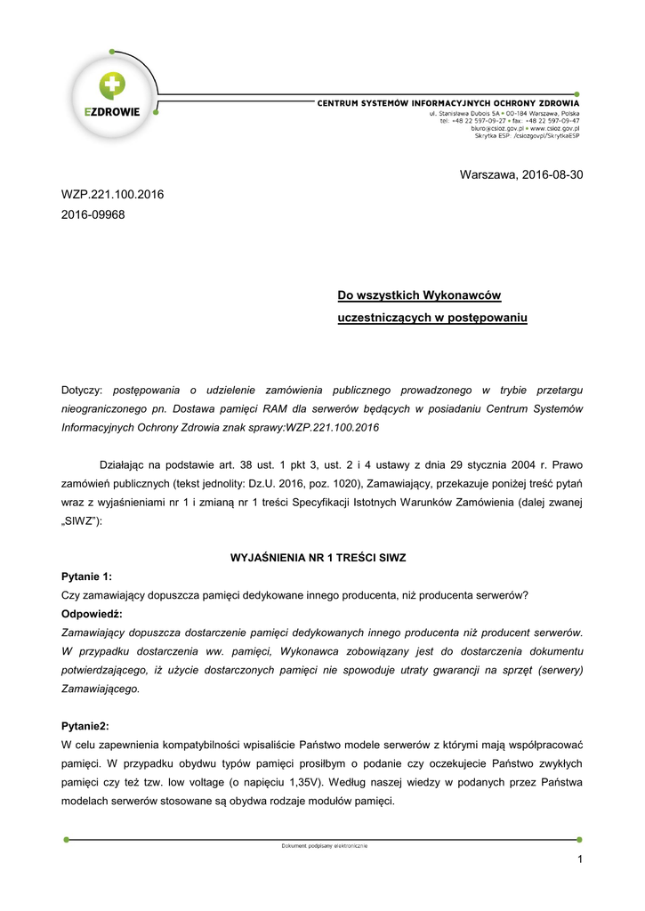 Wyjaśnienia nr 1 zmiana nr 1 treści SIWZ z dnia 2016-08-30