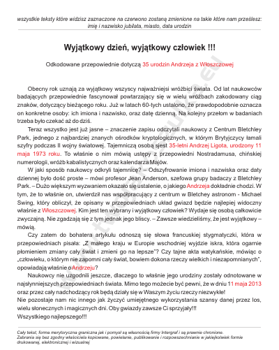 wszystkie teksty które widzisz zaznaczone na czerwono zostan¹ zmienione na takie które nam przeœlesz: imiê i nazwisko jubilata, miasto, data urodzin u Wyj¹tkowy dzieñ, wyj¹tkowy cz³owiek !!! a .e Odkodowane przepowiednie dotycz¹ 35 urodzin Andrzeja z W³oszczowej ww w. tw oja ko sz ulk Obecny rok uznaj¹ za wyj¹tkowy wszyscy najwa¿niejsi wró¿bici œwiata. Od lat naukowców badaj¹cych przepowiednie fascynowa³ powtarzaj¹cy siê w wielu wró¿bach zakodowany ci¹g znaków, dotycz¹cy bie¿¹cego roku. Ju¿ w latach 60-tych ustalono, ¿e prawdopodobnie oznacza on konkretne osoby: ich imiona i nazwisko, oraz datê dzienn¹. Na kolejny prze³om w badaniach trzeba by³o czekaæ a¿ do dziœ. Teraz wszystko jest ju¿ jasne – znaczenie zapisu odczytali naukowcy z Centrum Bletchley Park, jednego z najbardziej znanych oœrodków kryptologicznych, w którym Brytyjczycy ³amali szyfry podczas II wojny œwiatowej. Tajemnicz¹ osob¹ sjest 35-letni Andrzej Ligota, urodzony 11 maja 1973 roku. To w³aœnie o nim mówi¹ ustêpy z przepowiedni Nostradamusa, chiñskiej numerologii, wró¿b kabalistycznych oraz kalendarza Majów. W jaki sposób naukowcy odkryli tajemnicê? – Odszyfrowanie imiona i nazwiska oraz daty dziennej by³o doœæ proste – mówi profesor Jean Anderson, szefowa grupy badaczy z Bletchley Park. – Du¿o wiêkszym wyzwaniem okaza³o siê ustalenie, o jakiego Andrzeja dok³adnie chodzi. W tym, ¿e to w³aœnie on, utwierdzi³ nas wspó³pracuj¹cy z centrum w Bletchey astronom - Michael Swing, który obliczy³, ¿e opisany w przepowiedniach uk³ad gwiazd bêdzie najlepiej widoczny w³aœnie z W³oszczowej. Kim jest ten wybrany i wyj¹tkowy cz³owiek? Wydaje siê osob¹ ca³kowicie zwyczajn¹. Nie zgadzaj¹ siê z tym jednak jego bliscy. – Zawsze wiedzieliœmy, ¿e jest wyj¹tkowy – mówi¹. Czy zatem do bohatera artyku³u odnosz¹ siê s³owa francuskiej stygmatyczki, która w przepowiedniach pisa³a: „Z ma³ego kraju w Europie wschodniej wyjdzie iskra, która ogarnie p³omieniem zmiany ca³y œwiat i zmieni go na lepsze”? Czy tajne akta watykañskie, mówi¹c o „cz³owieku, o którym nie zapomni ca³y œwiat, bowiem dokona rzeczy wielkich i niezapomnianych”, opowiadaj¹ w³aœnie o Andrzeju? Naukowcy nie uzgodnili jeszcze, dlaczego to w³aœnie jego urodziny zosta³y odnotowane w najs³ynniejszych przepowiedniach œwiata. Mimo tego mo¿ecie byæ pewni, ¿e w dniu 11 maja 2013 oraz przez ca³y nadchodz¹cy rok bêd¹ dzia³y siê w Waszym ¿yciu rzeczy niezwyk³e! Nie pozostaje nam nic innego jak ¿yczyæ umiejêtnego wykorzystania szansy danej przez los, wielu s³onecznych i magicznych dni. Oby gwiazdy zawsze Ci sprzyja³y!!! Wszystkiego najlepszego!!! Ca³y tekst, forma merytoryczna graniczna jak i pomys³ s¹ w³asnoœci¹ firmy Intergraf i s¹ prawnie chronione. Zabrania siê bez zgodny w³aœciciela kopiowane, powielanie, publikowanie i rozpowszechnianie w jakiejkolwiek formie drukowanej, elektronicznej i wizualnej